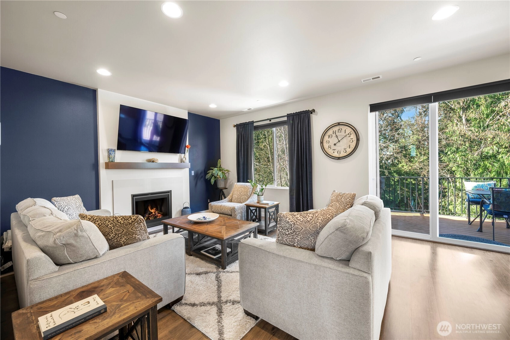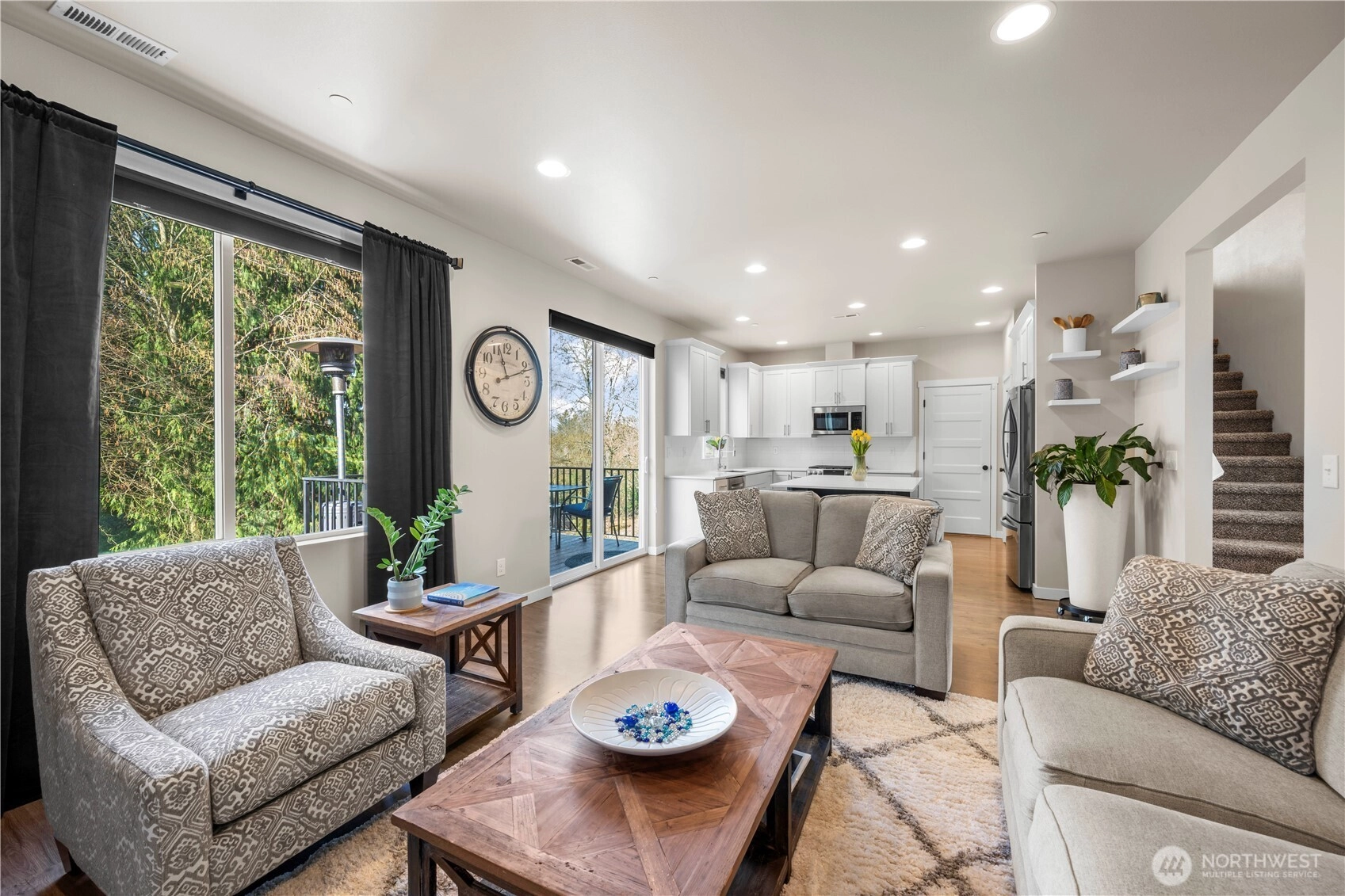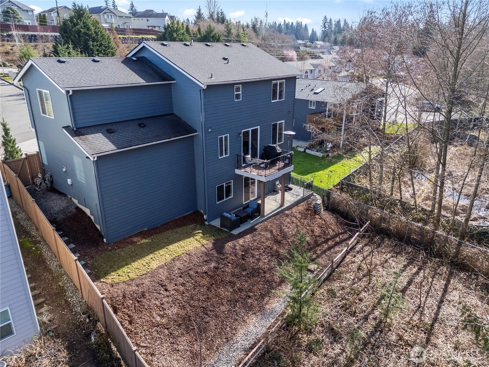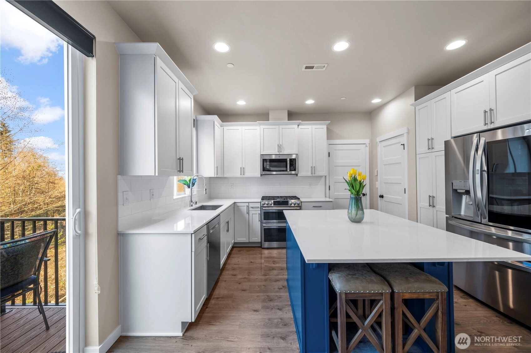 Modern farmhouse charm meets peaceful Northwest living in Ridgeview Park in South Marysville. This like-new home has been lovingly maintained, offering designer style and thoughtful spaces throughout. The open-concept main level is perfect for gathering, featuring gorgeous laminate flooring, quartz countertops, tile backsplash, a center island, stainless steel appliances, upgraded pull-out shelving for easy kitchen organization, designed for both everyday living and entertaining. The main floor includes a dedicated den perfect for working from home or flexible use to fit your lifestyle. Upstairs, you’ll find four spacious bedrooms along with the convenience of upstairs laundry. The primary suite offers a large walk-in closet and a well-appointed bathroom with double sinks and a shower. The finished lower level provides even more versatility with a full bathroom and separate entrance ideal for multi-generational living, extended guests, or a private retreat. Step outside and enjoy the serenity of a secluded greenbelt right behind the home, creating a peaceful and private backdrop. Located on a desirable corner lot, the home also enjoys access to the scenic Bayview Trail from within the community, perfect for morning walks, evening strolls, or simply enjoying the outdoors. Additional features include a home EV charging station, adding convenience for modern living. This spotless home blends modern style, comfort, and lifestyle in a truly special way.