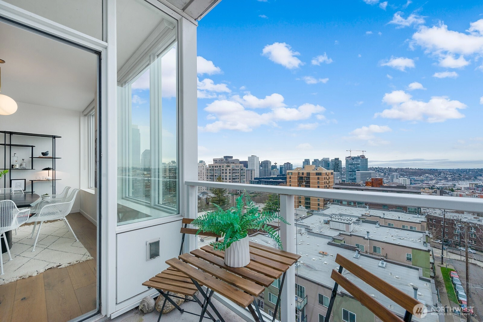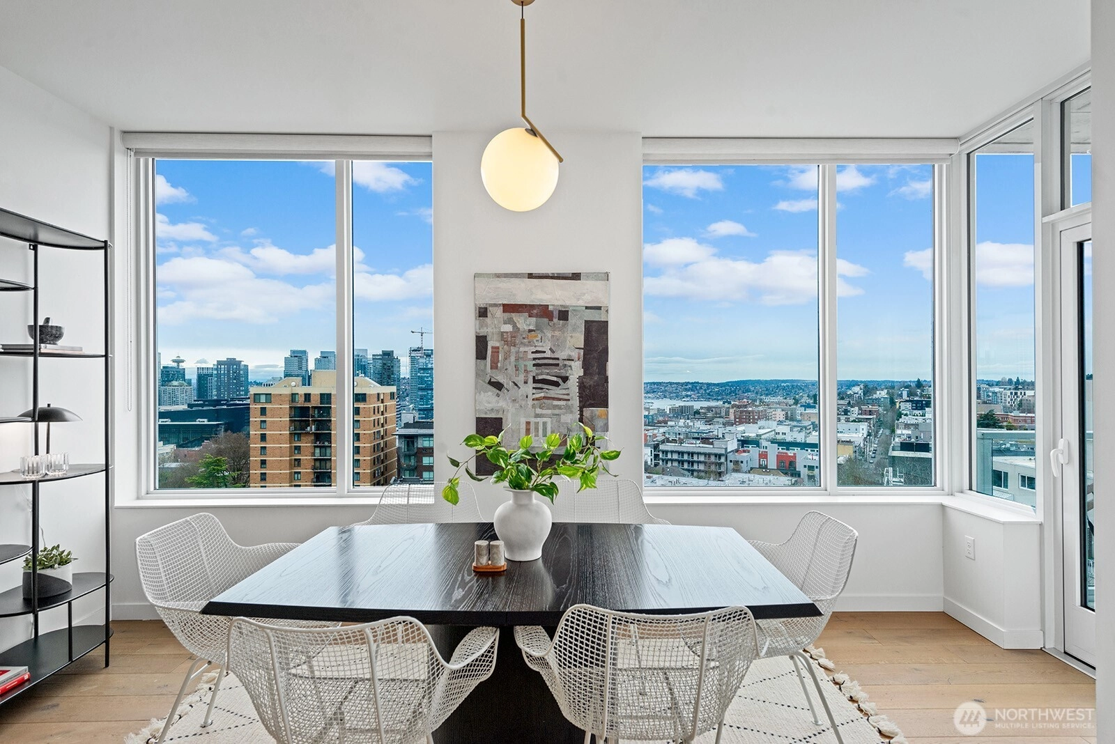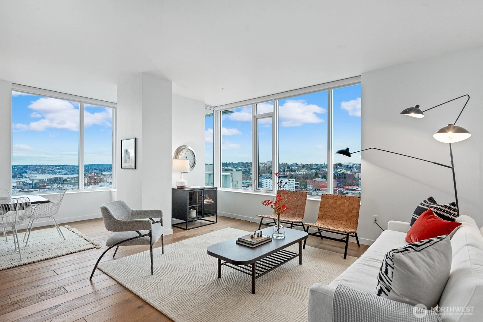 NE-corner residence at LUMA in Seattle’s First Hill, offering wide city and water views and exceptional natural light. Floor-to-ceiling windows and 9-foot ceilings frame the skyline from the living spaces and both bedrooms. The open plan connects living and dining to a contemporary kitchen with an oversized island and gas cooktop (as shown), designed for hosting and everyday life. The primary suite features a spa-style bath with dual vanity, glass-enclosed shower, and a generous walk-in closet. The second bedroom provides flexibility for guests or a dedicated home office. Includes 1 assigned parking space in a secured garage, dedicated storage, and building EV charging available (not assigned to the unit). LUMA offers a 24-hour concierge, fitness center, and a 24th-floor rooftop with indoor and outdoor gathering spaces, terraces, grills, and a spa with expansive views. Convenient to the Pike/Pine corridor and downtown Seattle shopping, with Whole Foods nearby. 2 BR, 1.75 BA, 1,185 SF (per MLS), built 2016.