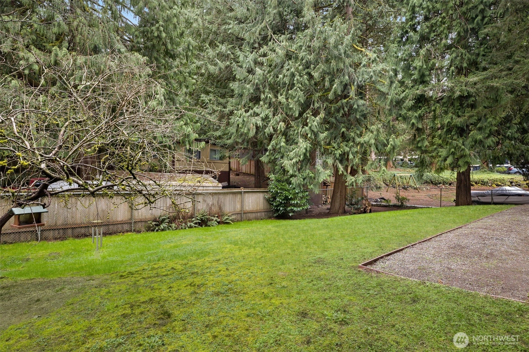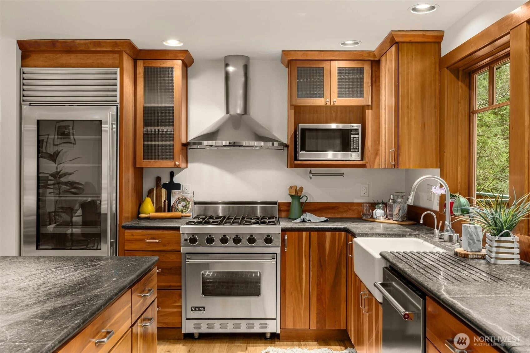 This private Redmond home is tucked away on a quiet street surrounded by green views. Natural light pours in through skylights and high end wood framed windows, highlighting hardwood floors, new carpet, and a cozy wood burning stove. The large deck off the living room creates seamless indoor outdoor living and extends your entertaining space into a natural setting. The spacious kitchen features a generous island, high end stainless steel appliances and abundant cabinetry, ideal for both everyday living and gatherings. Upstairs you will find two bedrooms and a full bath with a deep jetted tub, including a primary suite with a walk-in closet and its own private deck. The lower level offers two additional bedrooms and a full bath, plus smart storage under the stairs and a 1 car garage. An expansive backyard provides the perfect setting for entertaining or quiet relaxation. A dedicated exterior dog run adds a convenient and secure space for your furry friends. Conveniently located near Redmond Town Center, parks, trails, Microsoft and the new Eastside light rail, this home offers peaceful living with exceptional access to everything the Eastside has to offer.