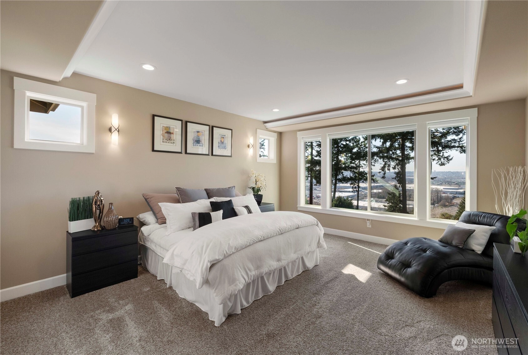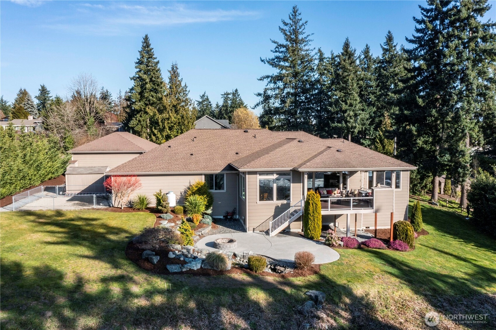 Exquisite Fife Heights Estate with Panoramic Views, this private 2.7-acre compound overlooks the Hylebos Nature Reserve, the Olympic Mountains and the Port of Tacoma. Enjoy spectacular western exposure sunsets from your private deck, complete with outdoor fireplace perfect for relaxing or entertaining. The 3,184 sq ft single-level main home is thoughtfully designed. Two primary suites, an additional bedroom with an adjacent bath, and a theater room/office enhanced with added sound insulation and high-speed Cat 6 cabling. The great room showcases a spacious gourmet kitchen with a large eating area, an ideal gathering place. Attached 1,052 sq. ft. garage includes an EV charger and built-in storage room wired for a dog shower, laundry setup, and direct access to a covered dog run, making this an animal lover’s dream. A single-level ADU offers versatile space for extended living or guests, complete with its own two-car garage. An impressive 1,800 sq. ft. detached garage/shop, with its own separate 115V service, delivers endless opportunities for hobbies and toys. The estate is equipped with efficient geothermal heating and cooling, heated floors, and forced air climate control across seven separate zones for maximum comfort. Additional highlights include data room, solar domestic hot water system, and roughly finished 11-foot crawl space with drywall and concrete flooring. Discover a rare combination of privacy, luxury, and technology—an estate with no detail left undone.