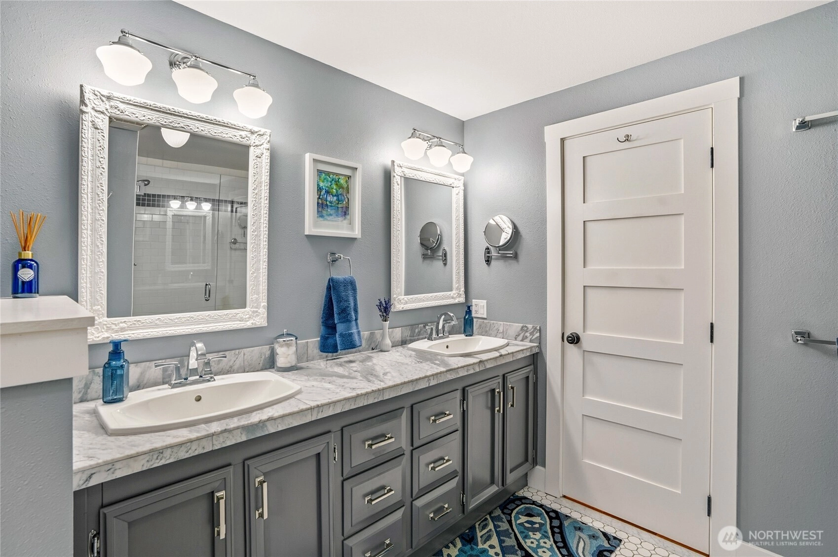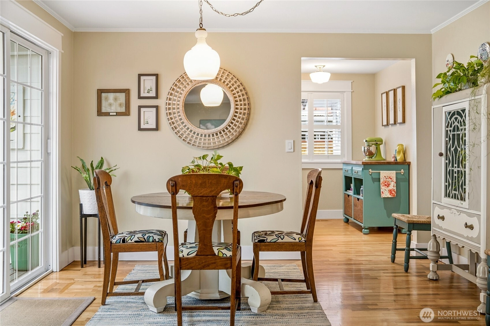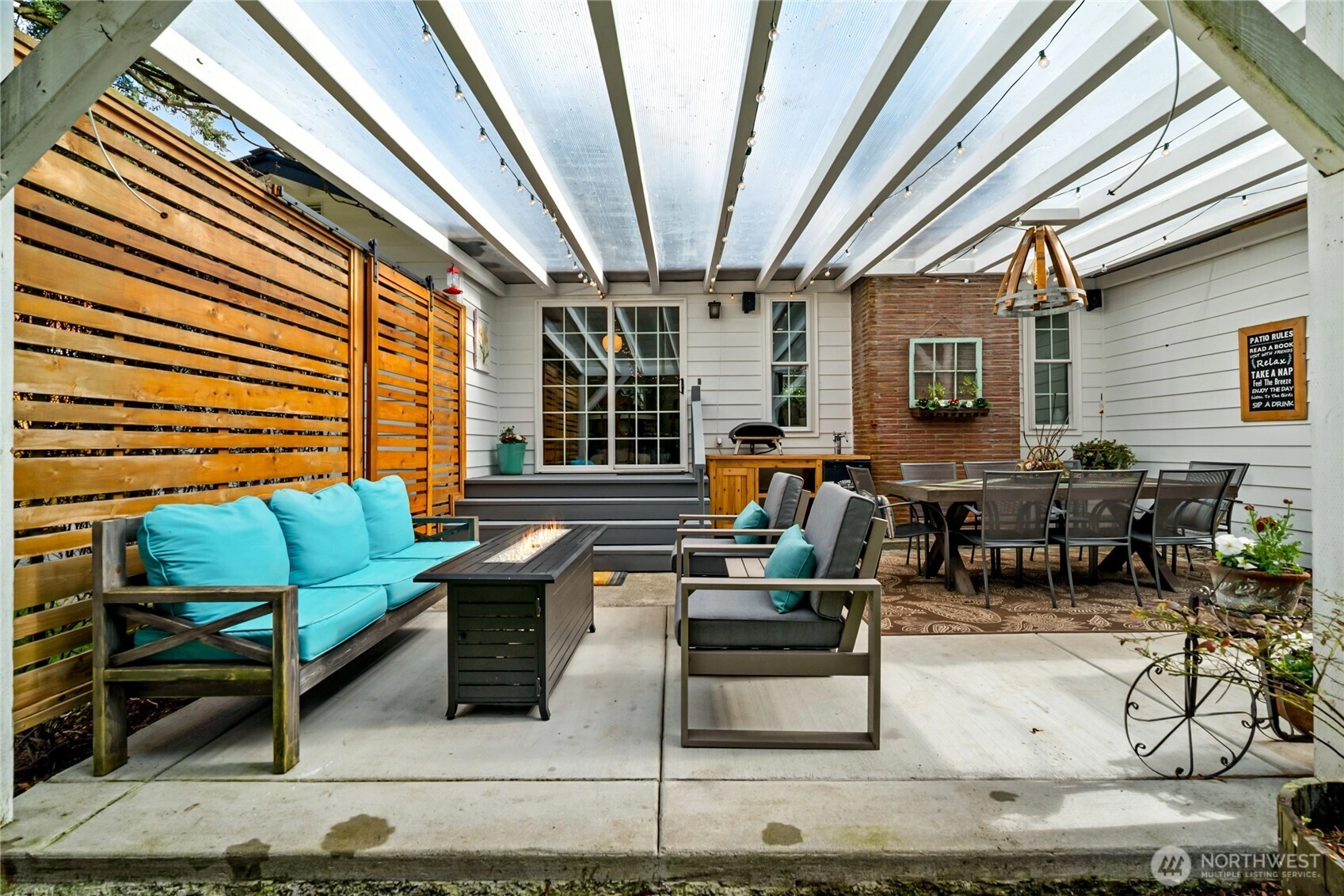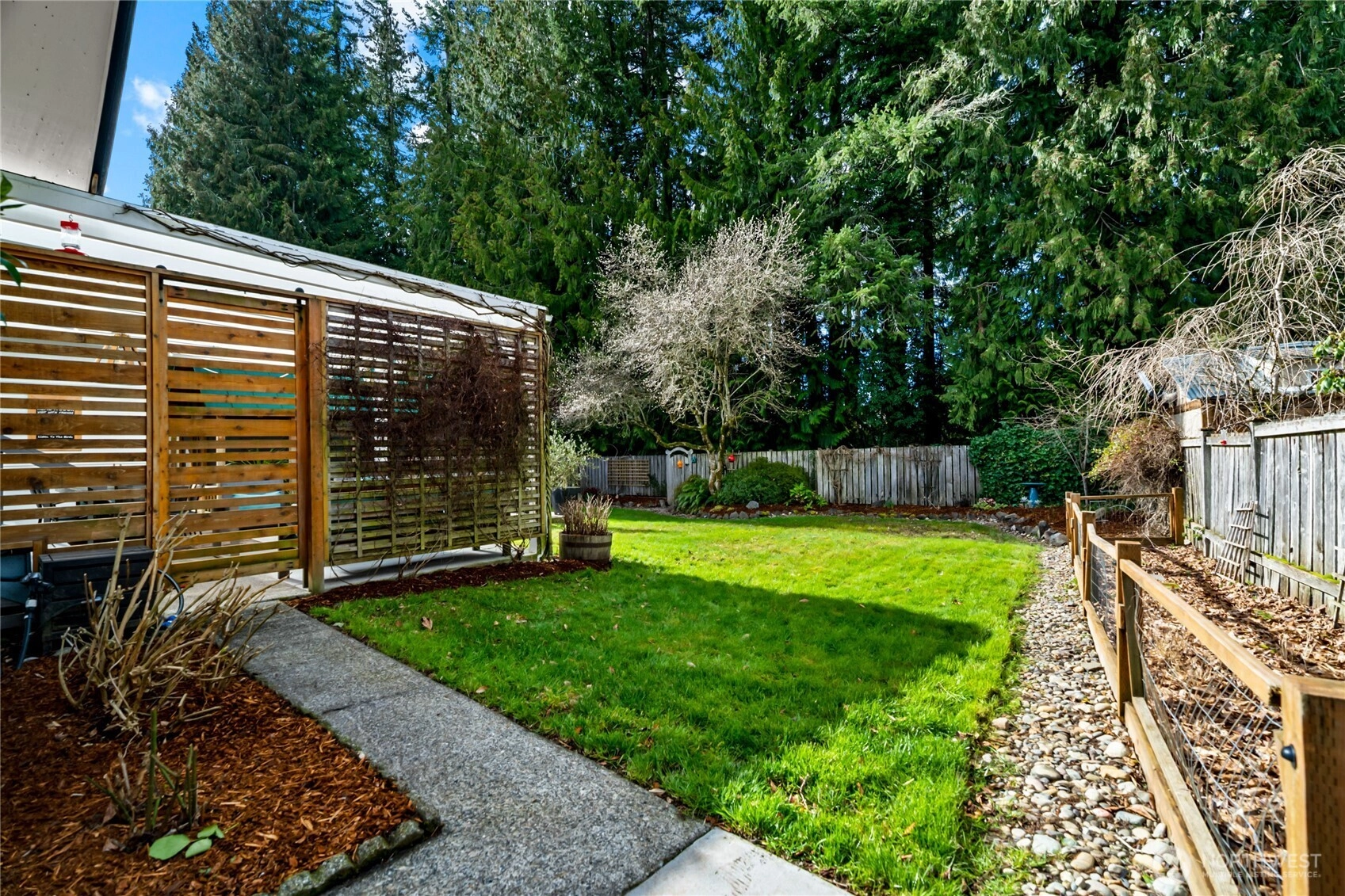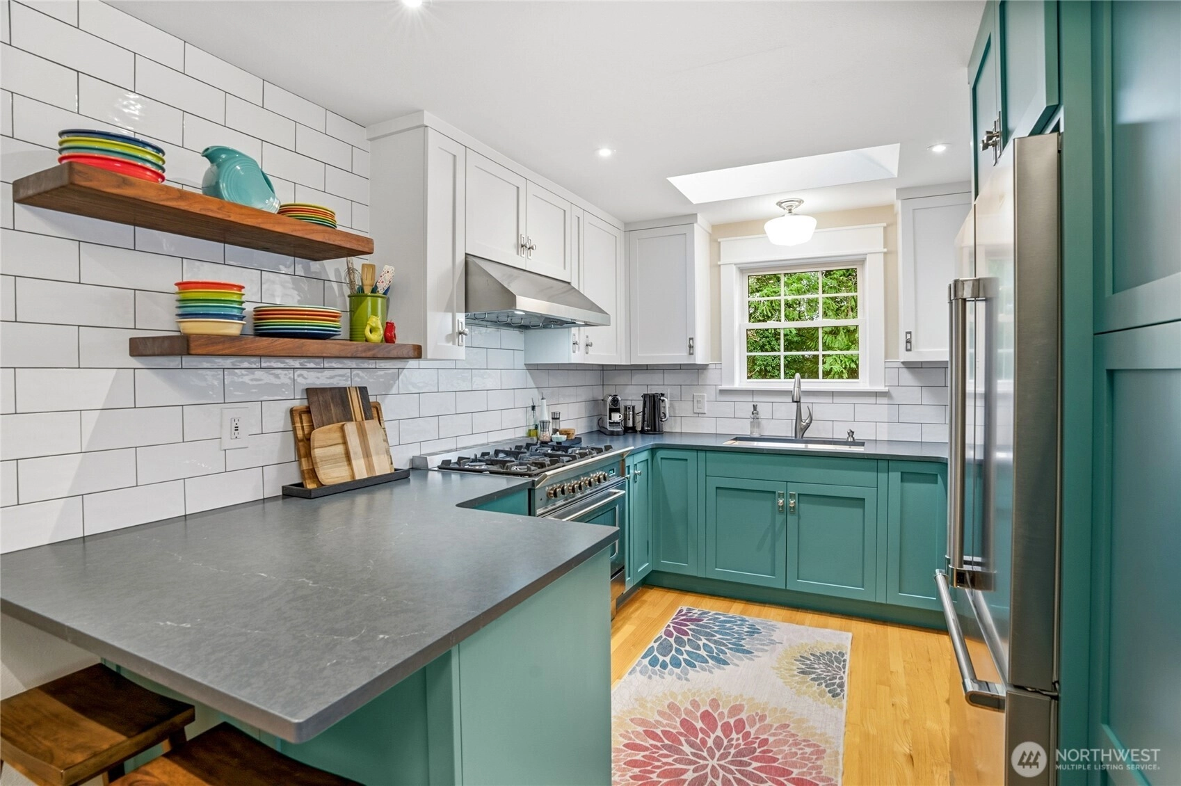 Some homes are updated. This one was DESIGNED. Extensively remodeled with intention and craftsmanship, this stunning one-story rambler stands apart. Refinished hardwood floors flow throughout—no carpet—creating warmth and continuity. The living room features a wood-burning fireplace with insert, flanked by full-height windows & built-in benches with storage. The kitchen showcases custom cabinetry from International Kitchens in Bellevue with dovetail construction and pullouts. Lower cabinets are finished in a custom lagoon teal created specifically for these owners—so beautiful it was later adopted into the cabinet company’s permanent collection—paired with crisp white uppers and a skylight overhead. A 36" 5-burner Verona range from Italy, commercial-style hood & stainless appliances complete the space. Both bedrooms are impressively spacious, offering comfort & flexibility, while the primary bedroom includes custom closet organizers. The beautifully reimagined main bath—taken down to the studs—feels like a boutique retreat, featuring mosaic tile floors, a double vanity with marble countertop & an expansive walk-in shower for everyday luxury. Enjoy year-round living under the exceptional 24x18 covered patio with blooming wisteria and privacy screening. Beautifully landscaped front and back with seasonal color, including winter camellia blooms. Major updates include heat pump (AC), furnace, tankless water heater, updated windows/doors—and BRAND NEW roof installed February 2026.