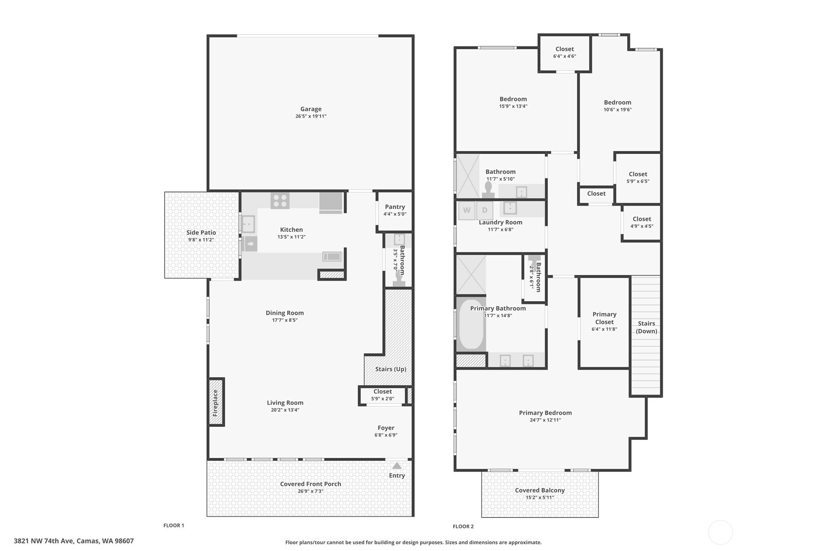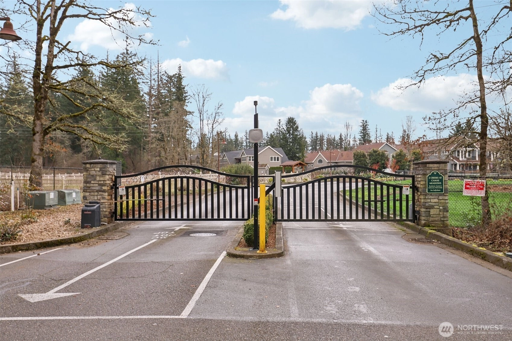Refined living in the gated community of Two Creeks at Camas Meadows. Thoughtfully designed with expansive living spaces, 10-foot ceilings, and 8-foot doors throughout. A welcoming covered front porch and private two-car alley-access garage enhance both charm and convenience. Wood flooring spans the main level, with carpeted stairs for comfort. The side yard, largest in the community, offers a covered patio and mature landscaping—ideal for quiet mornings or curated garden touches. Upstairs, the primary suite impresses with vaulted ceilings, dramatic floor-to-ceiling windows, a generous walk-in closet, and a well-appointed ensuite. Two additional bedrooms, each with walk-in closets, accompany a functional laundry room complete with storage and utility sink. Residents enjoy premier amenities including pickleball courts, a fitness center, outdoor pool, saunas, hot tub, and meeting space. Direct access to the Lacamas Heritage Trail and effortless proximity to Camas Meadows Golf Course.
