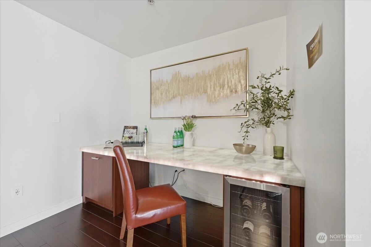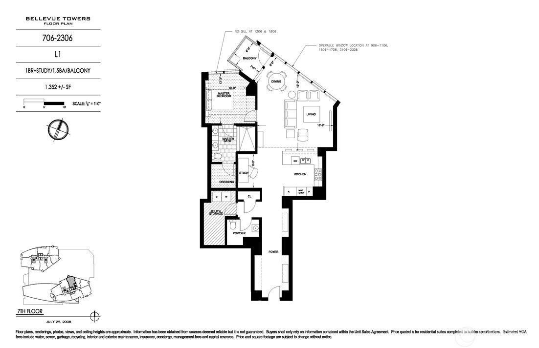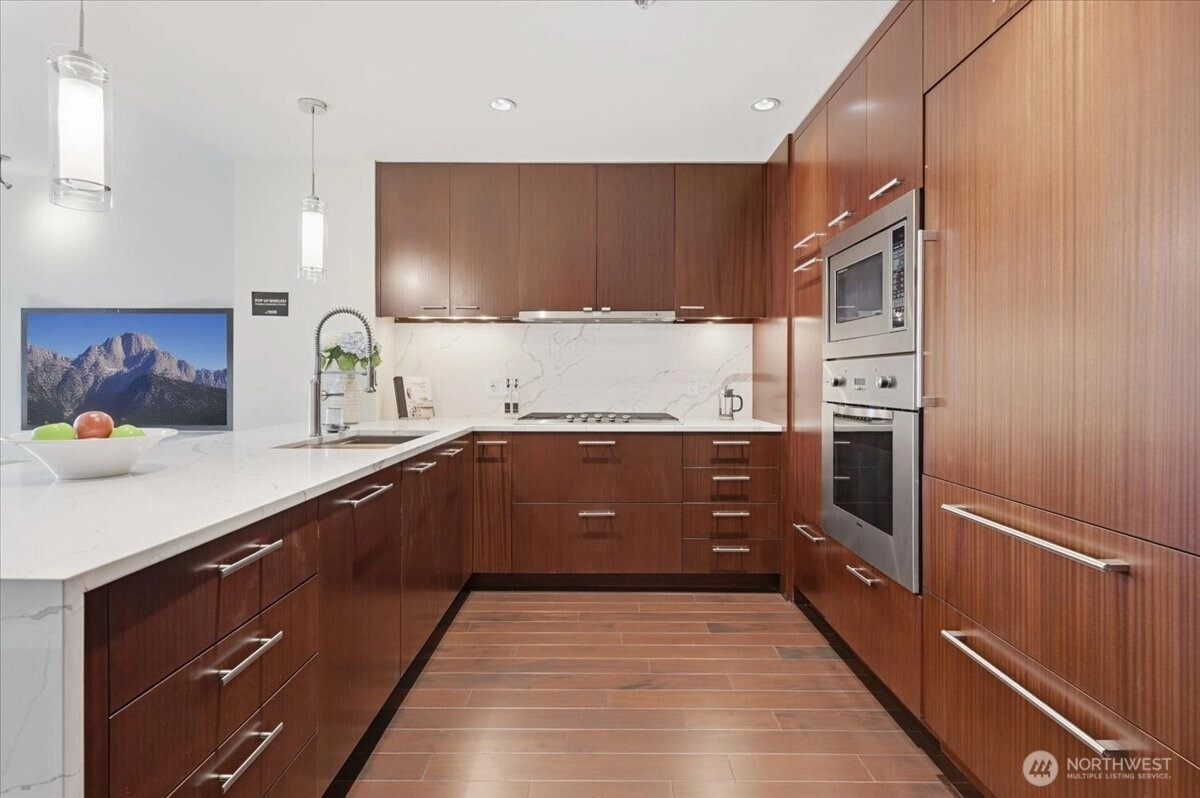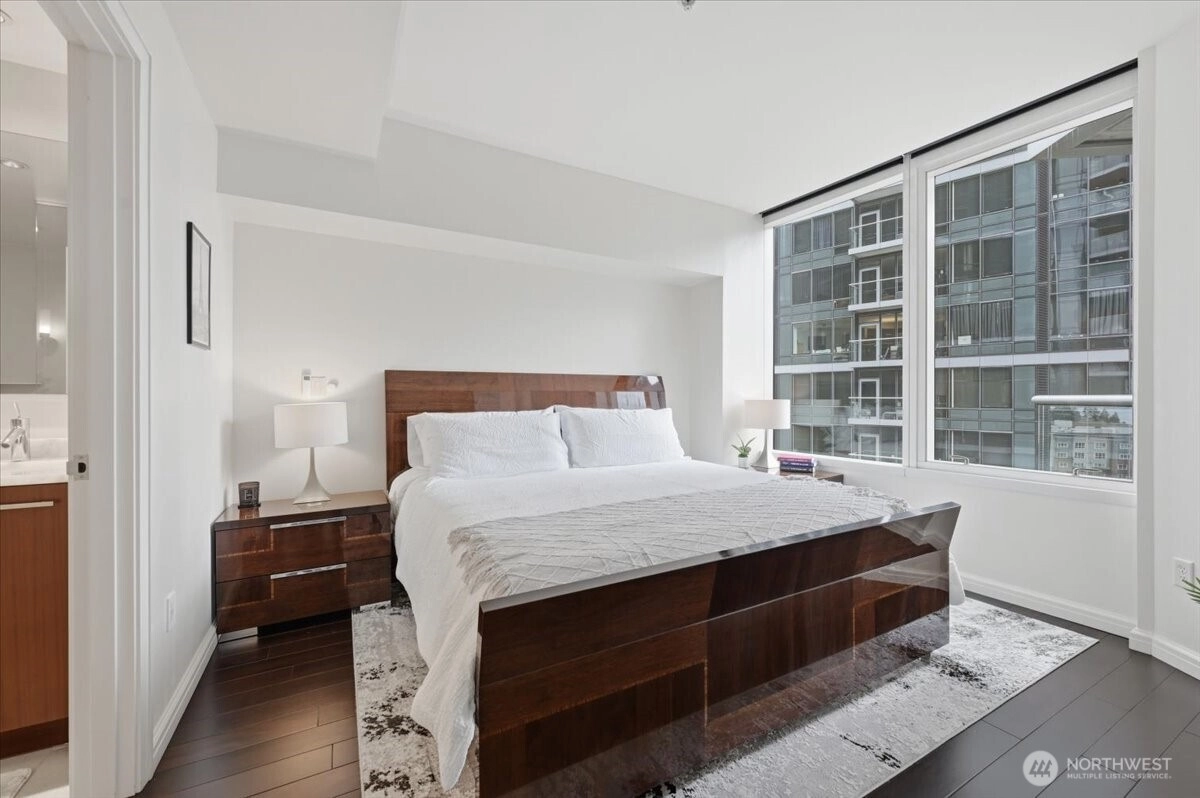 Experience refined urban living in this exceptional Bellevue Towers residence. This spacious 1,354 sq. ft. floor plan features a gallery entry that flows into an open-concept living area—perfect for maintaining positive Qi (energy).Balancing modern luxury and timeless elegance, this residence features sweeping city views and premium finishes throughout for an elevated lifestyle in the heart of downtown. Recently installed gleaming solid hardwood floors and a chef-inspired kitchen with quartz slab countertops and backsplashes, the unique backlit Cristallo stone accents in the custom-built den and bathrooms, creating a sophisticated ambiance. Nine-foot ceilings and abundant natural light highlight the clean architectural lines designed for seamless entertaining. The spacious primary suite accommodates a king-size bed and boasts a walk-in closet and a luxurious ensuite with dual vanities and a walk-in shower. A private deck with a BBQ hookup extends the living space outdoors, while a separate laundry room serves also as additional storage space. This smart home controls automated blinds on all windows, lighting, and a Nest thermostat. For added convenience, the dedicated parking space is ideally located close to the elevator. Residents enjoy world-class amenities: two fitness centers, a spa with a sauna, steam room, and plunge pool, a screening room, and an urban garden with fireplaces. Just steps from Bellevue’s premier dining and shopping, this is where luxury meets location.