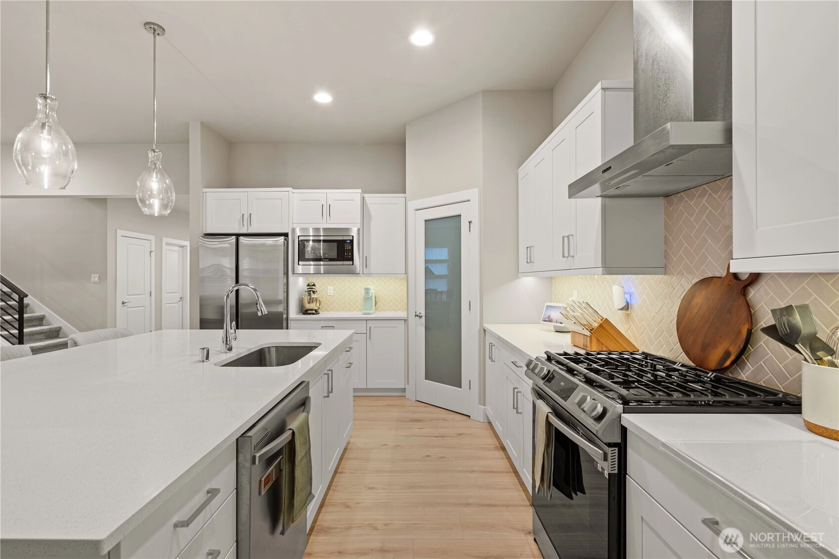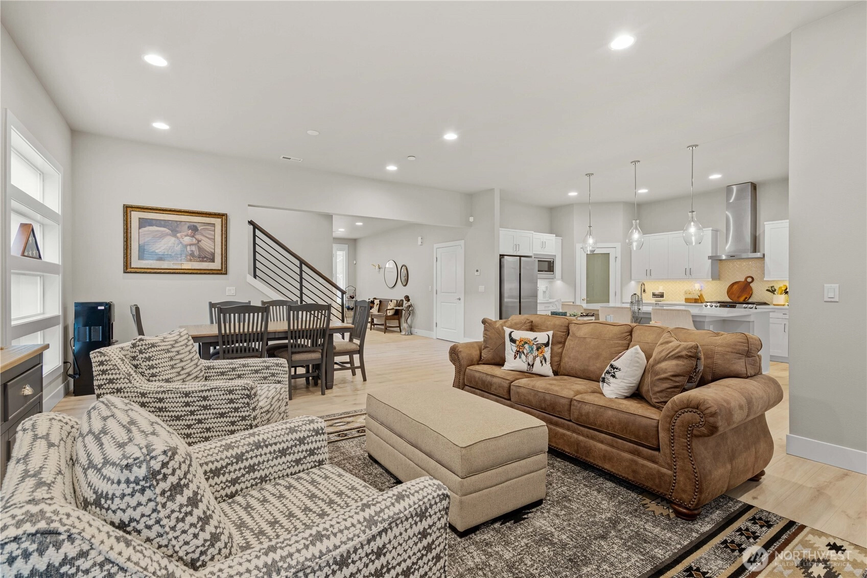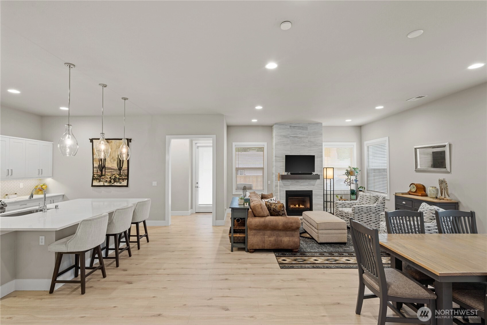 Welcome to this stunning 3 bed, 2.5 bath Rush home in Berggren’s Landing, Puyallup. Built in 2022, this 2,838 sq ft residence combines modern elegance with thoughtful design and premium upgrades. The main-floor primary suite features a spa-inspired ensuite with soaking tub, floor-to-ceiling tiled walk-in shower, and custom-built wardrobe organizers. The open-concept great room flows seamlessly to the gourmet chef’s kitchen with oversized island with seating, full-height tile backsplash, quartz countertops, stainless steel appliances, gas range, soft-close cabinets, and pantry. A versatile den on the main floor provides an ideal office or guest space. Upstairs, secondary bedrooms and a spacious bonus loft offer flexible living. The backyard is a private oasis with Trek deck, low-maintenance turf, and fully fenced yard. Additional highlights include EV charger and custom storage racks in the garage, plus an automatic generator to ensure you’re never without power. Energy-efficient systems, durable flooring, and quality millwork throughout. Move-in ready, turnkey, in the top-rated Puyallup School District, near shopping, dining, parks, and SR-512/I-5 access.