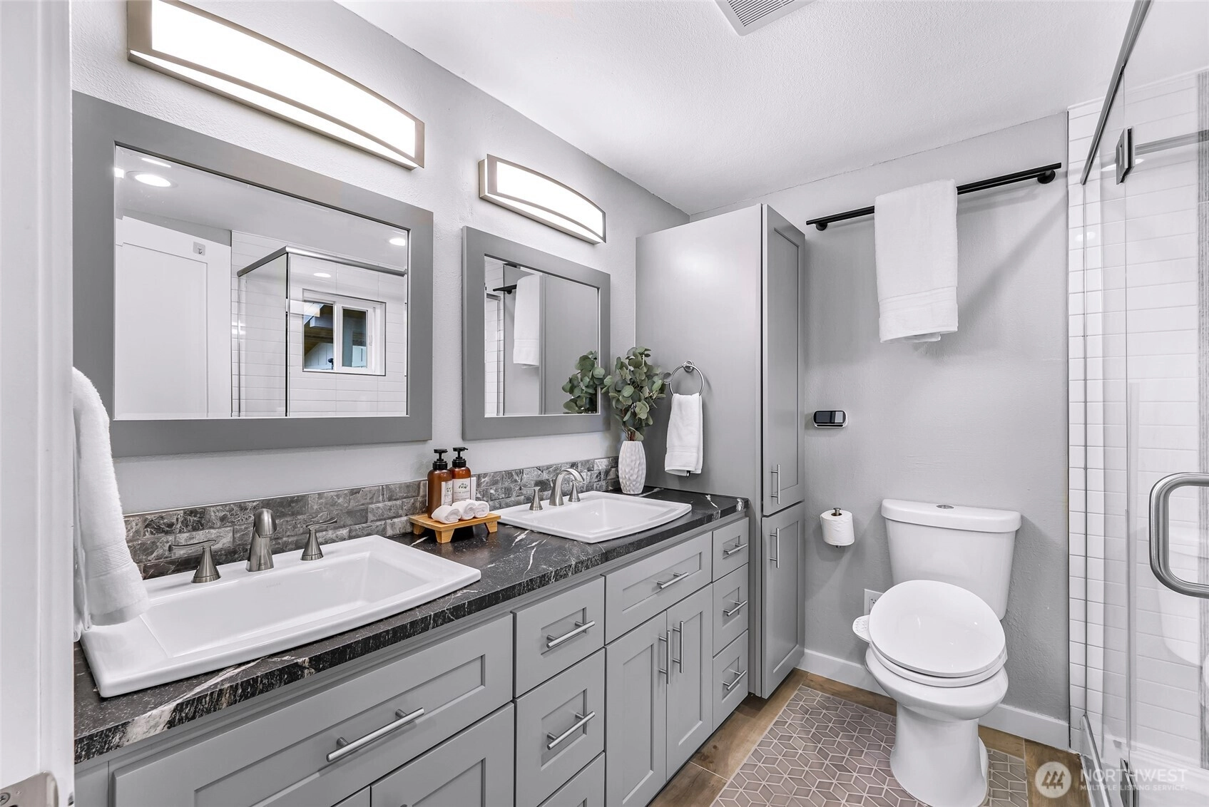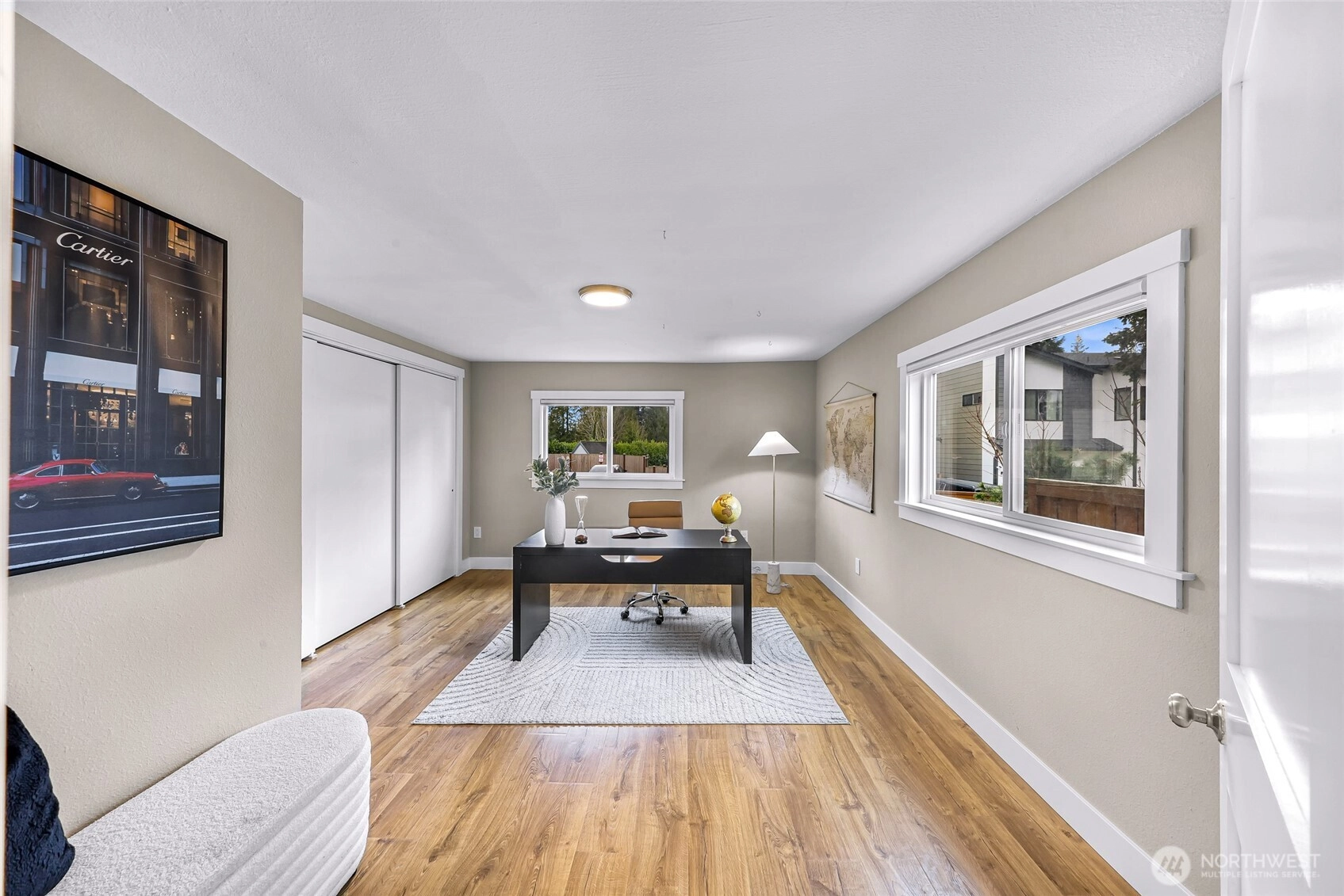 Tastefully renovated single-level home featuring a comprehensive update throughout. The redesigned kitchen offers modern cabinetry, stainless steel appliances, and durable stone surfaces. The primary suite includes a spacious walk-in wardrobe and a custom-appointed bathroom with radiant heated flooring, along with direct access to an outdoor deck. A separate detached studio provides flexible space ideal for a home office, creative workspace, or learning environment. Abundant natural light fills the home through expansive skylights. Year-round comfort is ensured with an efficient ductless heating and cooling system. The property also includes a generous rear yard with newer deck and an approximately 650-square-foot detached shop suitable for parking or workshop use. Conveniently situated close to schools, retail amenities, and Paine Field/Boeing. Welcome home!
