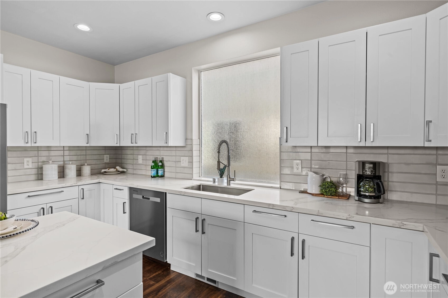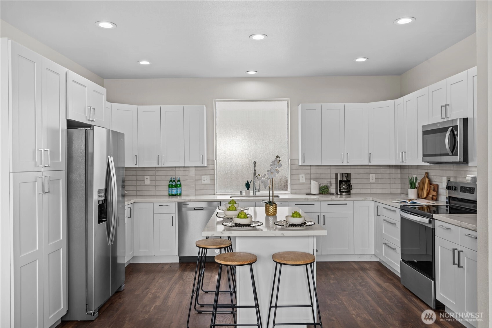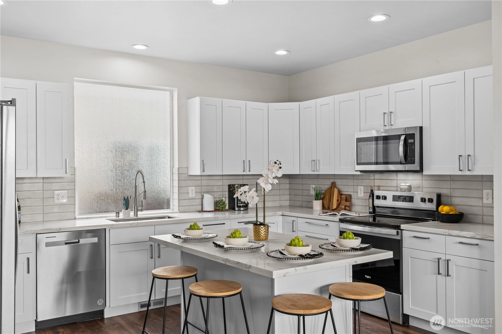 PRICE IMPROVEMENT! Beautifully maintained & updated, this Crosswater home lives like a single-family with a private fenced backyard, low-maintenance outdoor space & patio with firepit for easy entertaining, plus a 2-car garage. Move-in ready with a permitted upstairs addition, central A/C & a refreshed interior that makes the value feel immediate. Big-ticket updates already completed include a 2024 gas furnace + central air, 2022 water heater, plus newer paint, flooring & carpet. The fully renovated 2024 kitchen is a standout with new cabinets, quartz countertops, stainless appliances & a center island with eating bar. The main level offers a front living & dining area plus an open kitchen & living room anchored by a cozy dual-sided gas fireplace, great for daily flow & entertaining. The custom upstairs layout offers 3 bedrooms, 2 full baths & convenient laundry. Two bedrooms are ensuite-style, including a roomy second suite with WIC & a full bath offering bedroom + hallway access. The spacious primary suite includes an updated 5-piece bath, WIC & attached flex space perfect for a work-from-home office, nursery, or workout area. Neighborhood amenities include trails, tot lots & Boulder Park with open field, gazebo, playground & sport court. Minutes to Lundeen Park on Lake Stevens, plus shopping, dining & new nearby conveniences. Easy commuter routes via Hwy 9 with connections to US 2 and I-5. Desirable Lake Stevens schools support long-term value & future resale.