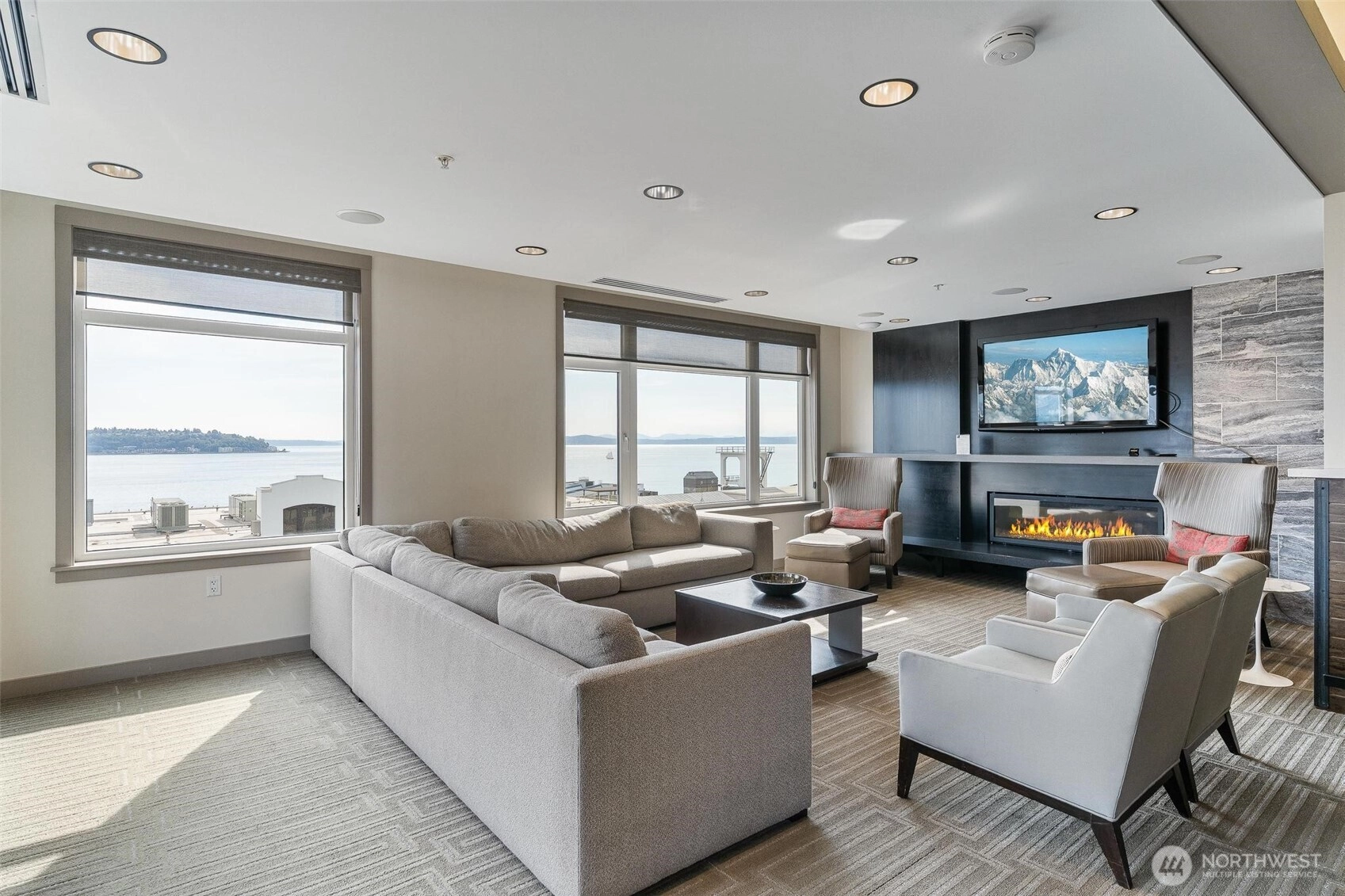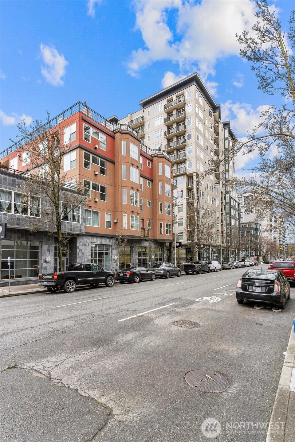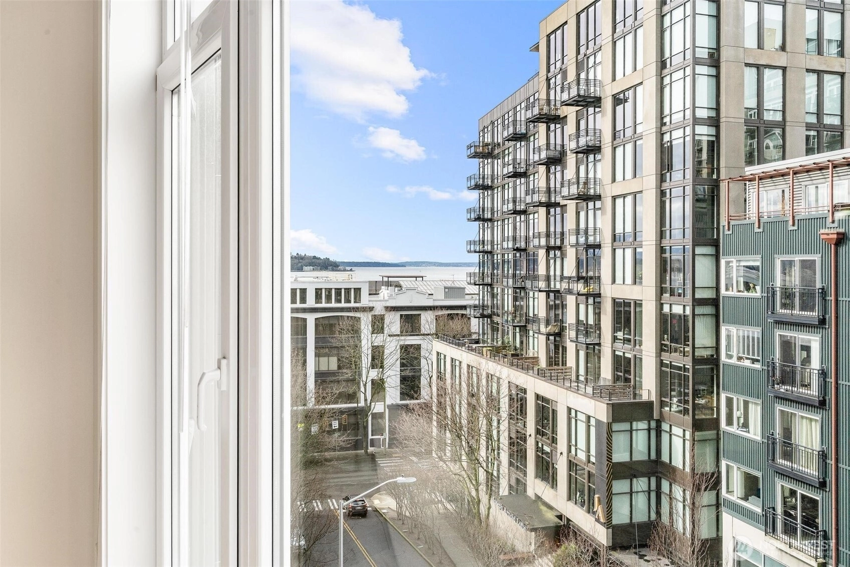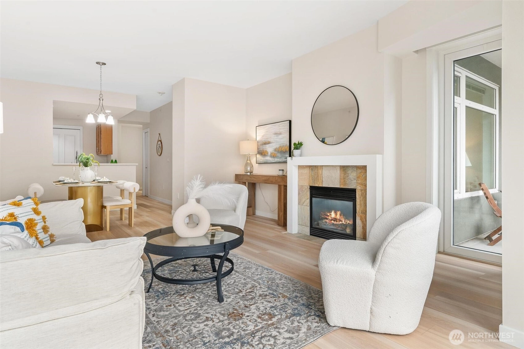 An amazing opportunity to own at The Vine in Belltown, a well-run, luxury building that takes pride in homeownership! The spacious 924sqft condo is a 1 bed, 1 bath plus a flex space that can be used as an office or guest room. The unit’s large footprint is significant for the area, as many 1-bedroom condos in this building range between 600-700sqft, making this condo a rare find for the neighborhood. Recent upgrades include new natural hickory LVP flooring, fresh paint, white quartz countertops in the kitchen and bathroom, and newer stainless-steel appliances. Open concept living/dining area with a gas fireplace, deck access with partial water views and large windows for natural light. Walk-in closet, in-unit new washer and dryer with plenty of storage space. One secure parking and storage space included. The building offers excellent amenities such as a 24-hour concierge, gym, on-site car wash and EV charger station, clubroom, rooftop deck with stunning Puget Sound views, guest suite & secure parking. The building sits in a walker's paradise (walk score 99), serving as a gateway between Belltown’s dining and nightlife and the tranquility of the waterfront.
