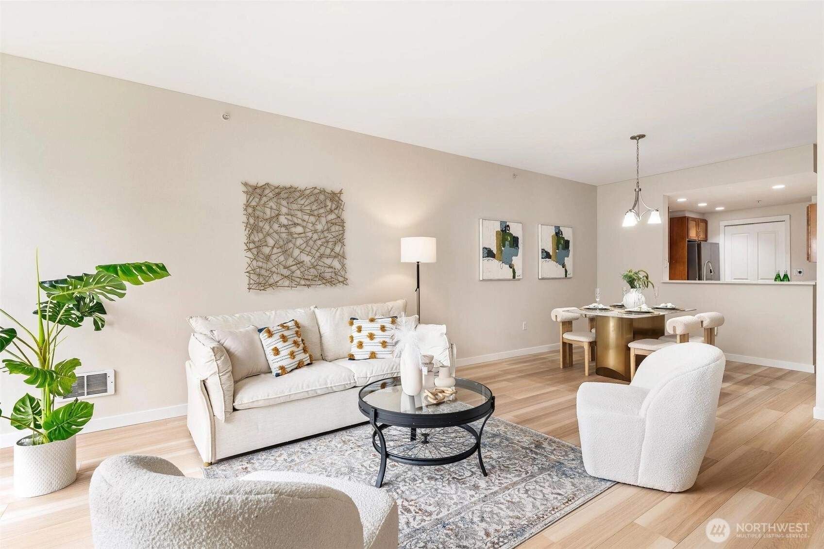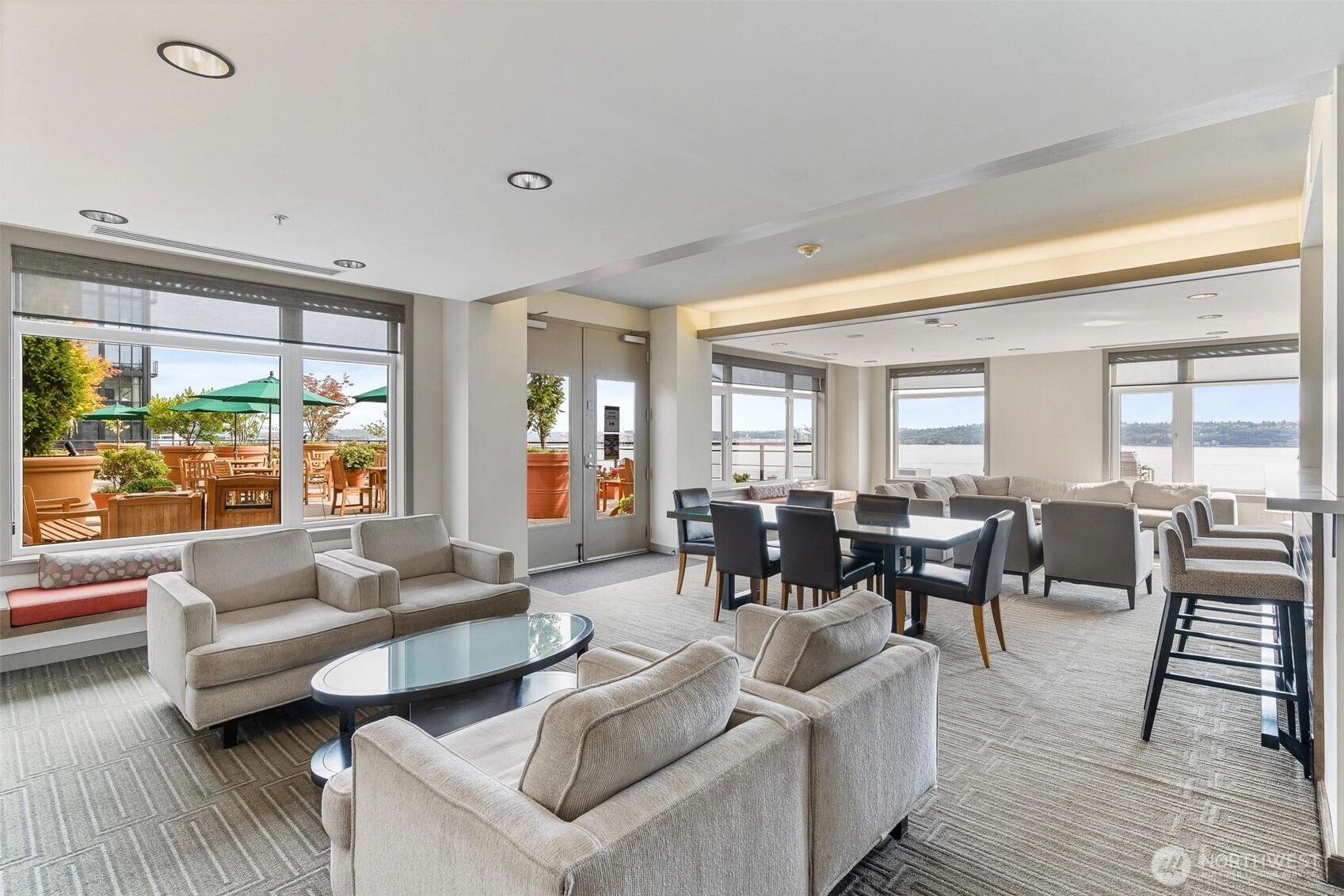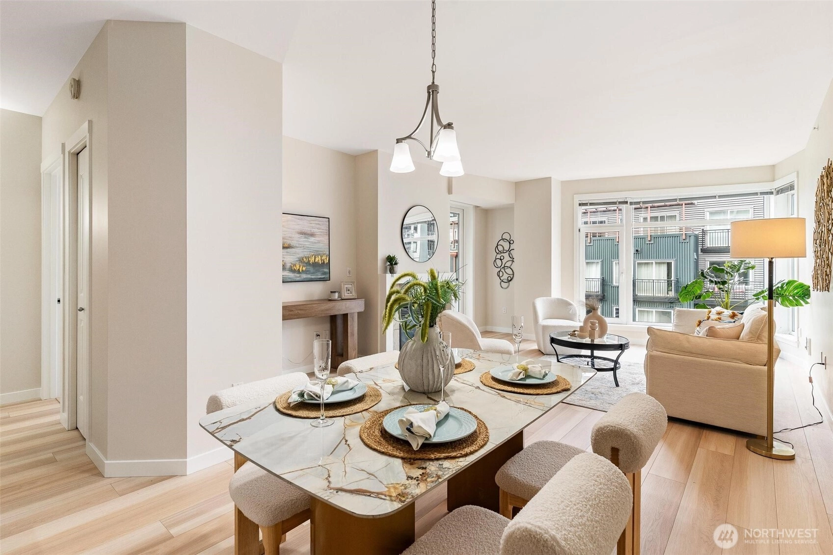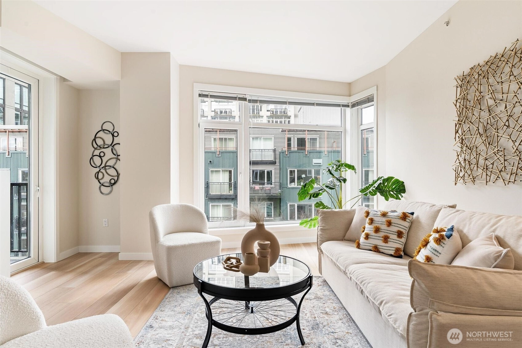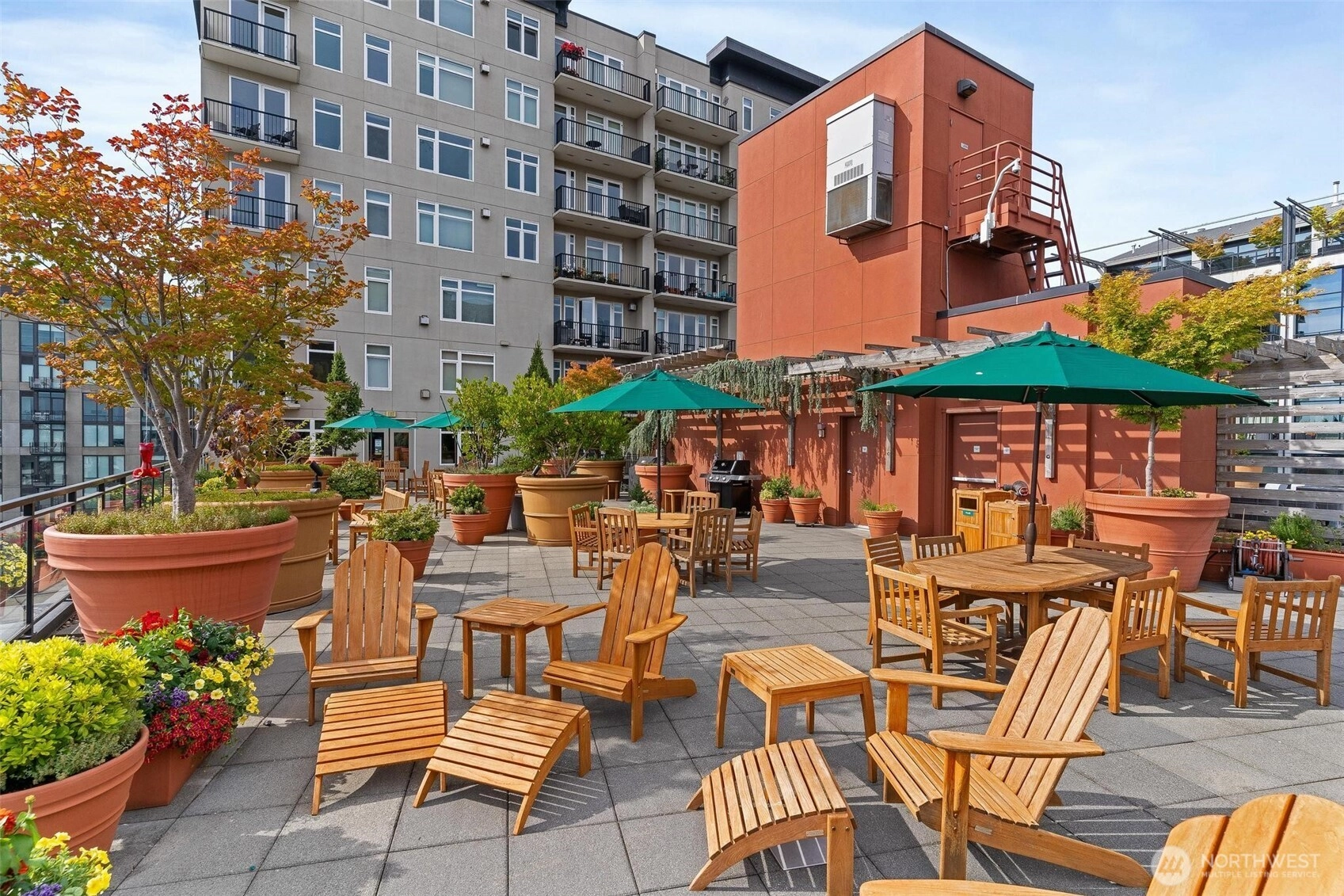 An amazing opportunity to own at The Vine in Belltown, a well-run, luxury building that takes pride in homeownership! The spacious 924sqft condo is a 1 bed, 1 bath plus a flex space that can be used as an office or guest room. The unit’s large footprint is significant for the area, as many 1-bedroom condos in this building range between 600-700sqft, making this condo a rare find for the neighborhood. Recent upgrades include new natural hickory LVP flooring, fresh paint, white quartz countertops in the kitchen and bathroom, and newer stainless-steel appliances. Open concept living/dining area with a gas fireplace, deck access with partial water views and large windows for natural light. Walk-in closet, in-unit new washer and dryer with plenty of storage space. One secure parking and storage space included. The building offers excellent amenities such as a 24-hour concierge, gym, on-site car wash and EV charger station, clubroom, rooftop deck with stunning Puget Sound views, guest suite & secure parking. The building sits in a walker's paradise (walk score 99), serving as a gateway between Belltown’s dining and nightlife and the tranquility of the waterfront.