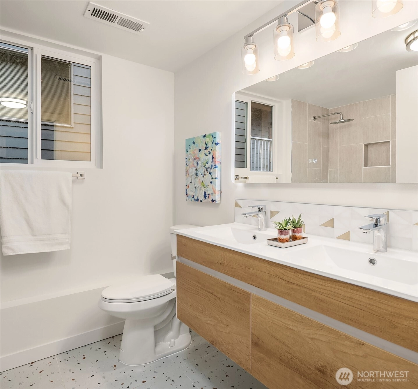 Modern renovated split-level home featuring 3 bedrooms and 2.75 baths with stylish upgrades throughout. Updates include a new composition roof, new double-pane windows, modern front door, fresh interior and exterior paint, new trims, and new interior doors. Durable LVP flooring throughout and custom light fixtures create a bright contemporary feel. The updated kitchen features a new island, quartz countertops, full-height backsplash, and undermount sink, flowing into the dining area with balcony deck access, perfect for relaxing or entertaining. The primary suite offers a wood panel accent wall, walk-in closet, and barn door, while all three bathrooms are fully renovated with modern finishes. The lower level includes a bedroom, new full bath, and spacious family room with wood-burning fireplace and patio access. Enjoy a fully fenced yard for outdoor living. Conveniently located on a transit bus line and walkable to Lake Serene, dining, and shopping. Minutes to Edmonds Ferry, Alderwood Mall, Costco, and major freeways. Move-in ready with modern design and thoughtful upgrades throughout. New gutters, garage door & paint just installed. Conveniently located on the transit bus line and walkable to Lake Serene, dining and shopping centers. Short drive to the Edmonds Ferry, Alderwood Mall, Costco, & major freeways (I-5/405 & WA-99/525). No HOA!