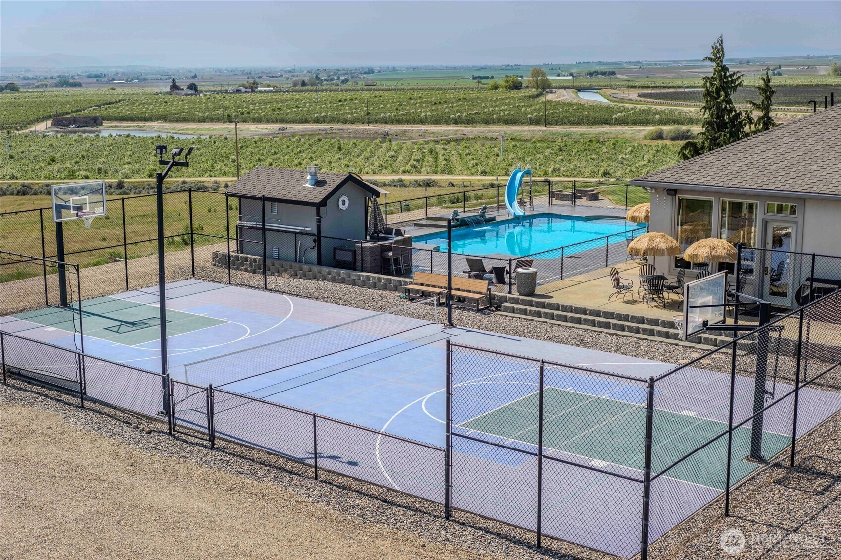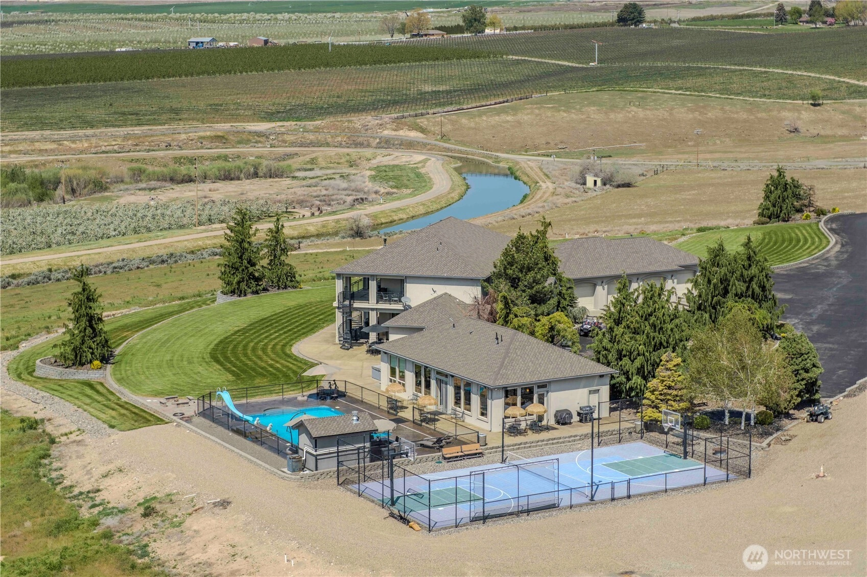 Stunning 7,238 sq ft estate with panoramic views of Mt. Rainier & Mt. Adams in the Lower Yakima Valley. Custom-built with slate floors, granite, tall ceilings, large kitchen, great room, formal living & dining. Main level also features theater with wet bar, rec room, gym, mudroom & guest bath. Upstairs the primary suite offers a spa bath, walk-in closet, fireplace & private covered lanai, 2 add’l bedrooms, 3/4 bath, a library loft and the main laundry room. Outside: heated pool, sport court, hot tub & gas fire pit. Includes 4-car garage, craft room, 2 storage rooms & 25kw generator. Great home or a vineyard, B&B or event venue (Buyer to verify zoning). This secluded yet close to town (one-of-a-kind) property is a great opportunity.