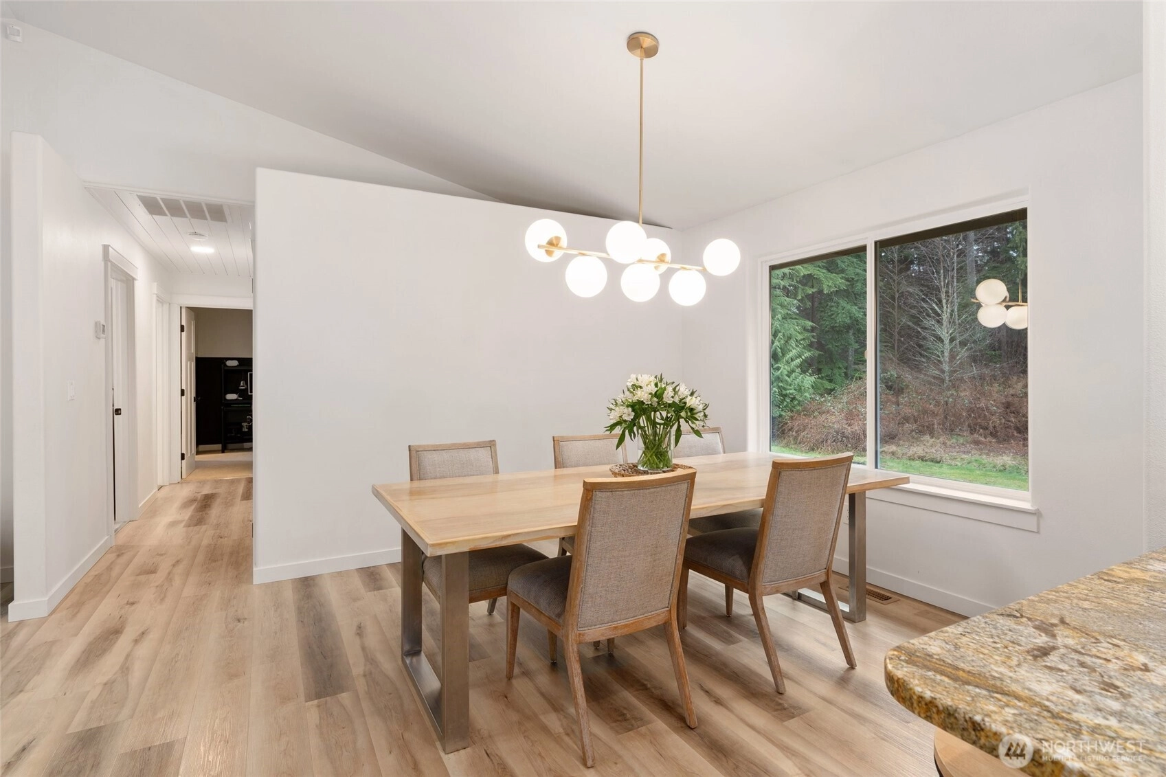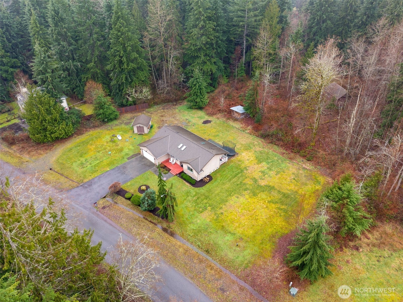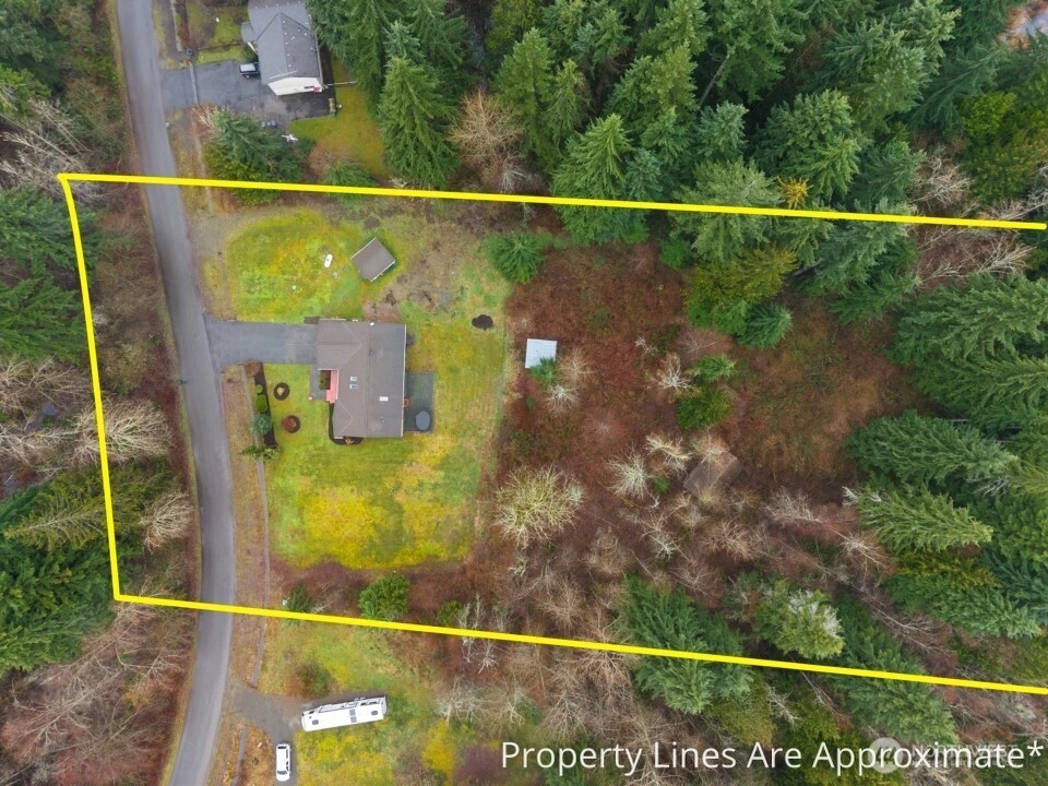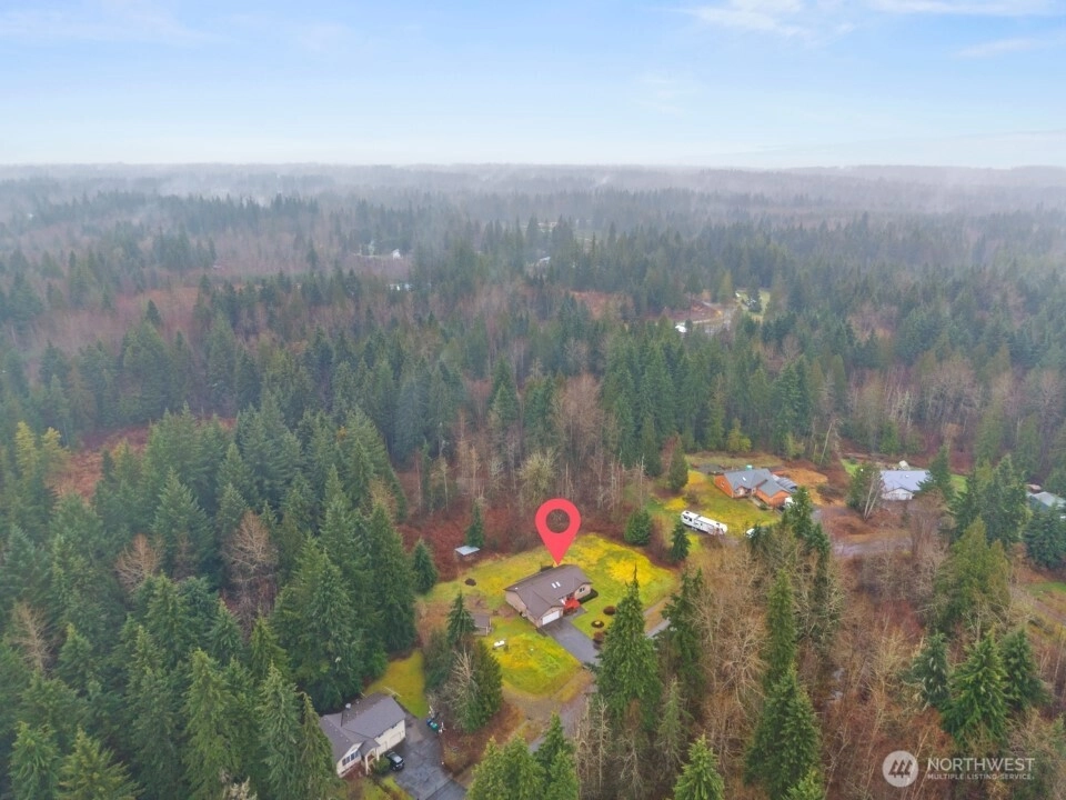 Polished Arlington rambler on a massive 5 + acre lot. This beautifully updated 3 bedroom 2 bath home offers almost 1500 square feet of living space with fresh interior updates throughout. LVP flooring, new interior doors and trim, custom two tone cabinetry with new hardware, granite countertops + kitchen-Aid appliances give the home a modern and refined feel. The primary suite features an attached bath with dual sinks, a sage accent wall, and new carpet, while the additional bedrooms also have new carpet and plenty of natural light. Vaulted ceilings with skylights enhance the bright open floor plan, highlighted by a West Elm dining fixture, built-in accent walls, and charming shiplap details. The updated secondary bath boasts a modern vanity and tile. New windows, tankless water heater and a high-efficiency heat pump + furnace with air conditioning provide comfort year round. Outside, a 2 car garage, additional outbuilding, and storage shed offer plenty of space for projects, hobbies, or storage. This home is on a 4 bed septic system that could be ideal for future DADU or addition. This home blends thoughtful updates, modern style, and a serene private setting on a generous lot, ready to be enjoyed as your forever home.