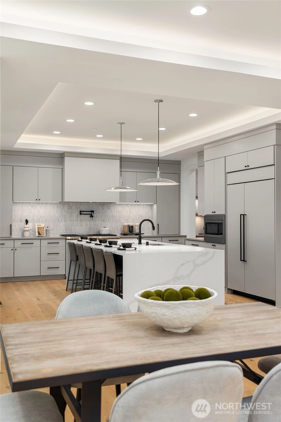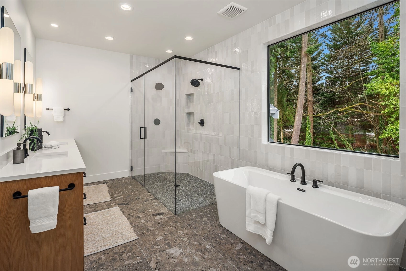 MN Custom Homes presents a transitional design on one of Rose Hill's premier streets. Entertainment spaces include: 2 story great room, chef’s kitchen, outdoor covered living space with heaters & upper-floor bonus room. Main floor guest suite. Upper floor primary suite with 5-piece bath and heated floors. Abundant natural light. Private office and designated dining room. Sunny, spacious backyard. Smart & green home features throughout, including solar panels. 3 car wide garage. Convenient access to DT Kirkland amenities, parks, schools & all major Tech campuses.