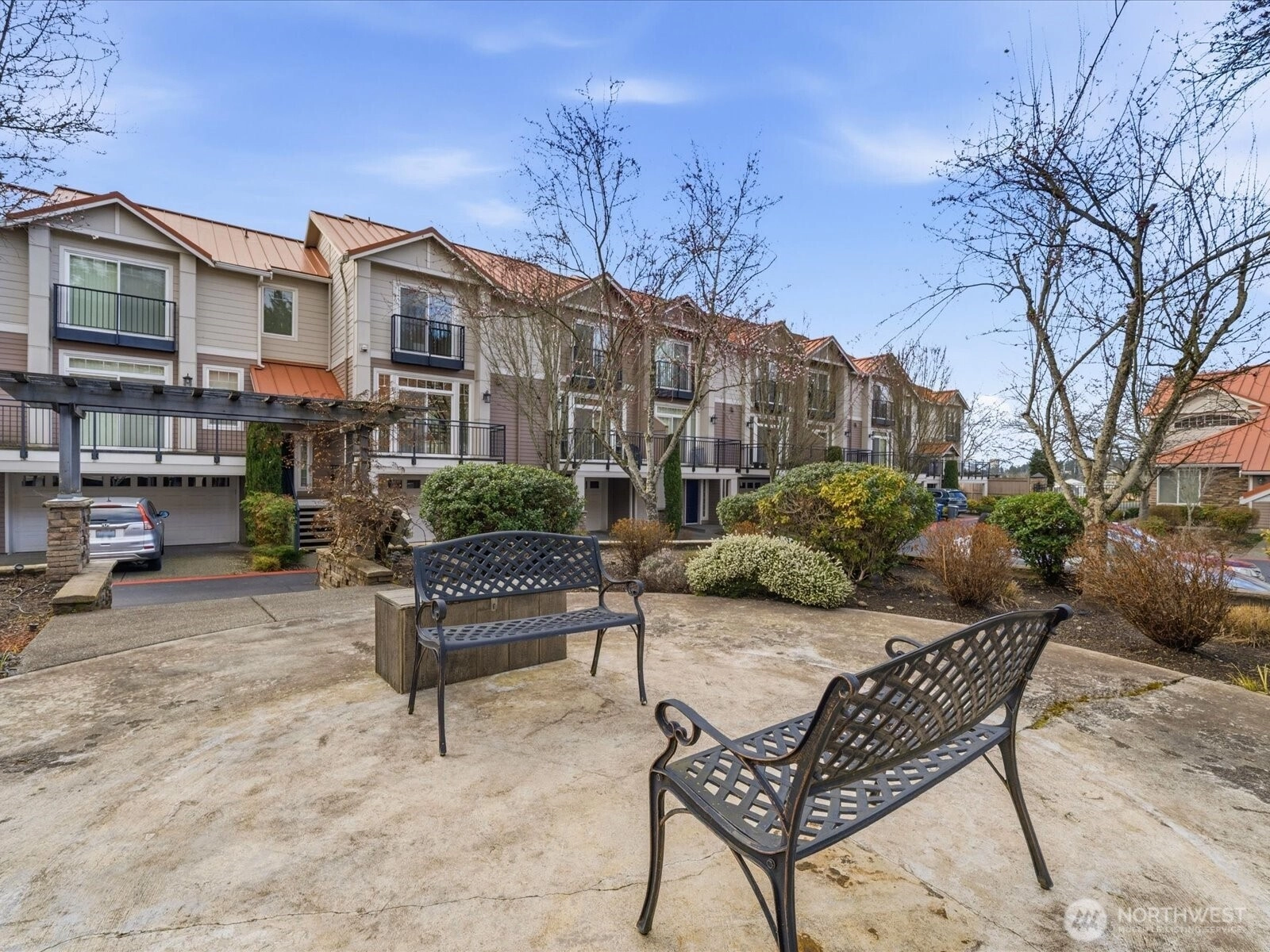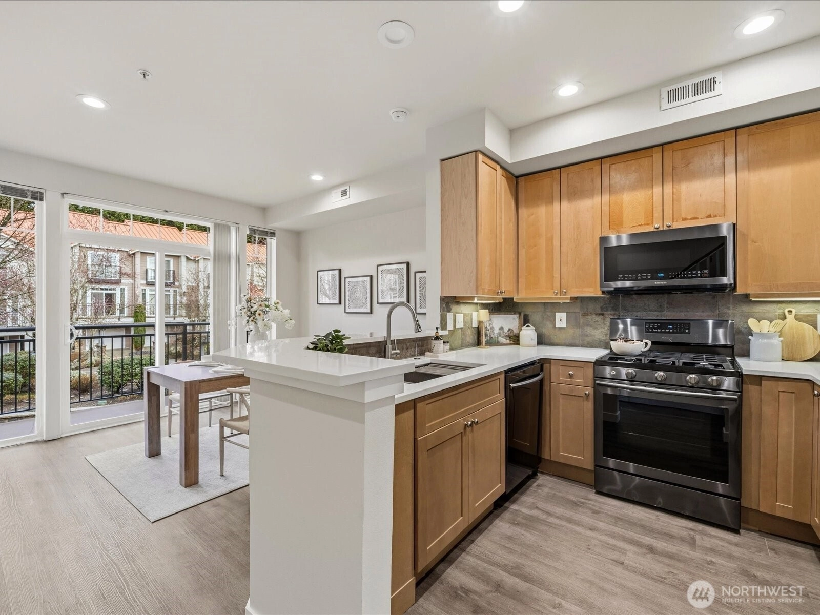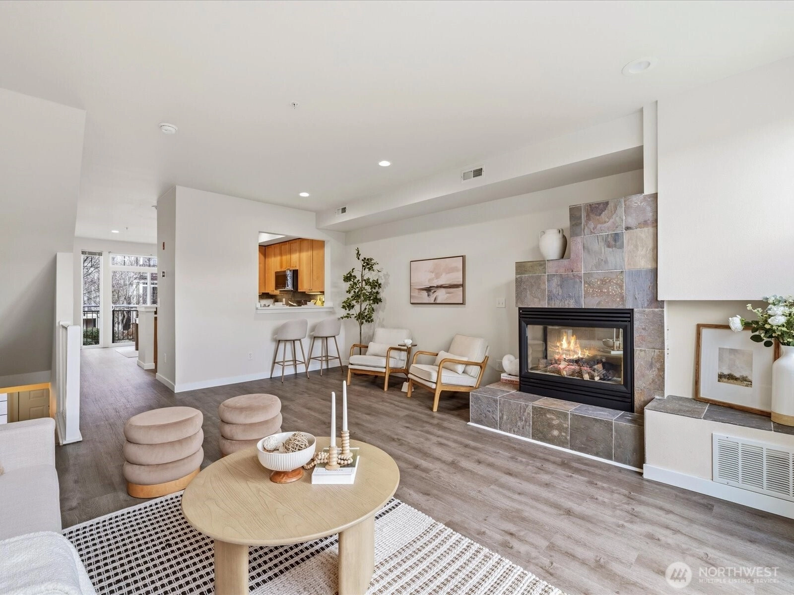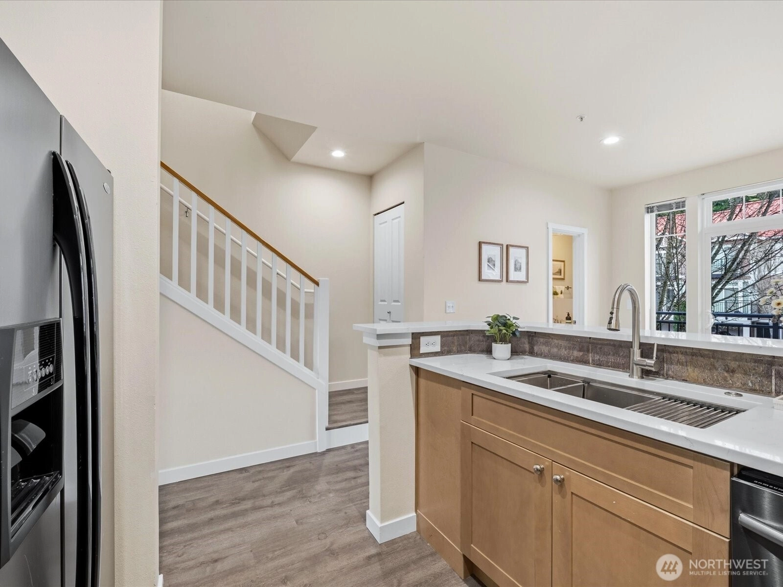 Beautifully updated townhome in a gated community with an unbeatable location! This light-filled home offers 3 bedrooms, 2.25 baths, and a spacious tandem garage with additional W/D hookups. The brand-new kitchen features quartz countertops, stainless steel appliances, and recessed LED lighting unique to this unit. New waterproof vinyl plank flooring and fresh interior paint enhance the bright living spaces, highlighted by vaulted ceilings, large windows, and a skylight. Enjoy breakfast in the sunlit dining area or relax by the gas fireplace. Step out onto the sunny balcony for added outdoor space. Walk to T&T, Target, Factoria Mall, and nearby restaurants, with quick access to I-405, I-90, and transit routes (203, 240) connecting to Bellevue, Kirkland, and the greater Eastside. Close to the 42-mile East Lake Sammamish Trail extending throughout the Lake Washington area. Nearby parks include Newcastle Beach Park and The Golf Club at Newcastle. Located in the award-winning Bellevue School District: Woodridge Elementary, Tyee Middle, and Newport High School.
