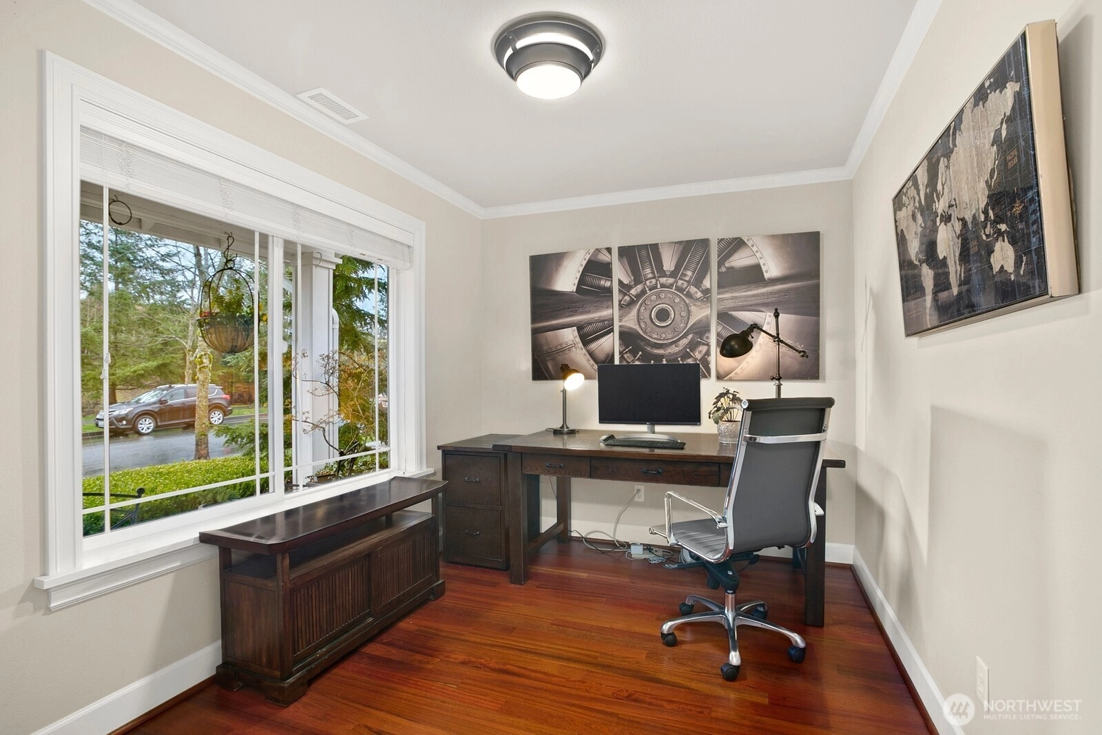 Beautiful VIEW home...3 bedrooms plus office...in the HEART of Snoqualmie Ridge. Upgrades and custom features throughout. Exceptional lot with spectacular views of pond, mountains and park. You will appreciate the privacy within the home, the warm and inviting living room and the way the natural light drenches the kitchen and dining areas. This home exudes quality from the beautiful hardwood floors and wood wrapped windows to the custom millwork, high-end window treatments, updated gas fireplace, curated fixtures and lighting. Be inspired by the light, bright and timeless kitchen perfect for gatherings and daily living. Kitchen connects seamlessly to professionally designed entertaining spaces, including a gorgeous patio and lush landscaping. Yard is very private, fully fenced and includes a beautiful spa and garden shed. This home includes 3 spacious bedrooms upstairs plus a dedicated office on the main floor. Great use of space with plenty of storage. One-of-a-kind setting...and you can walk to everything...close to restaurants, shops, Cascade View Elementary, parks, trails & YMCA. Great schools and an amazing lifestyle await you in this special home and community.
