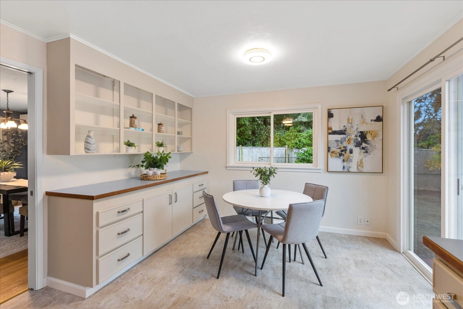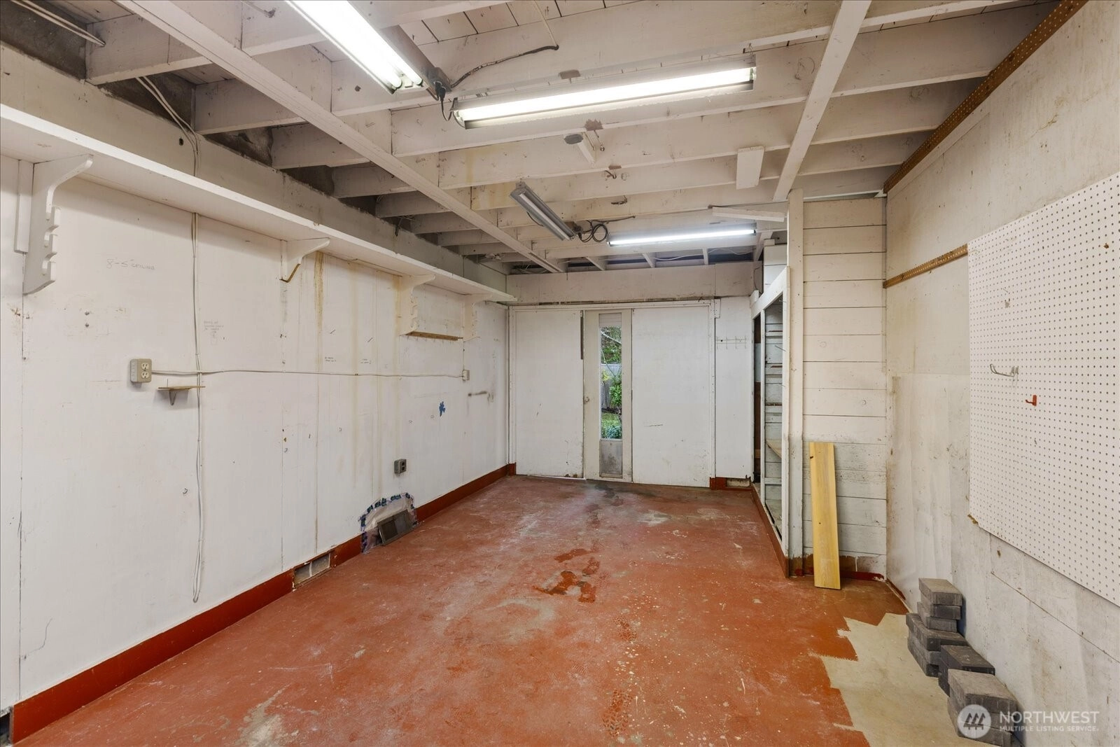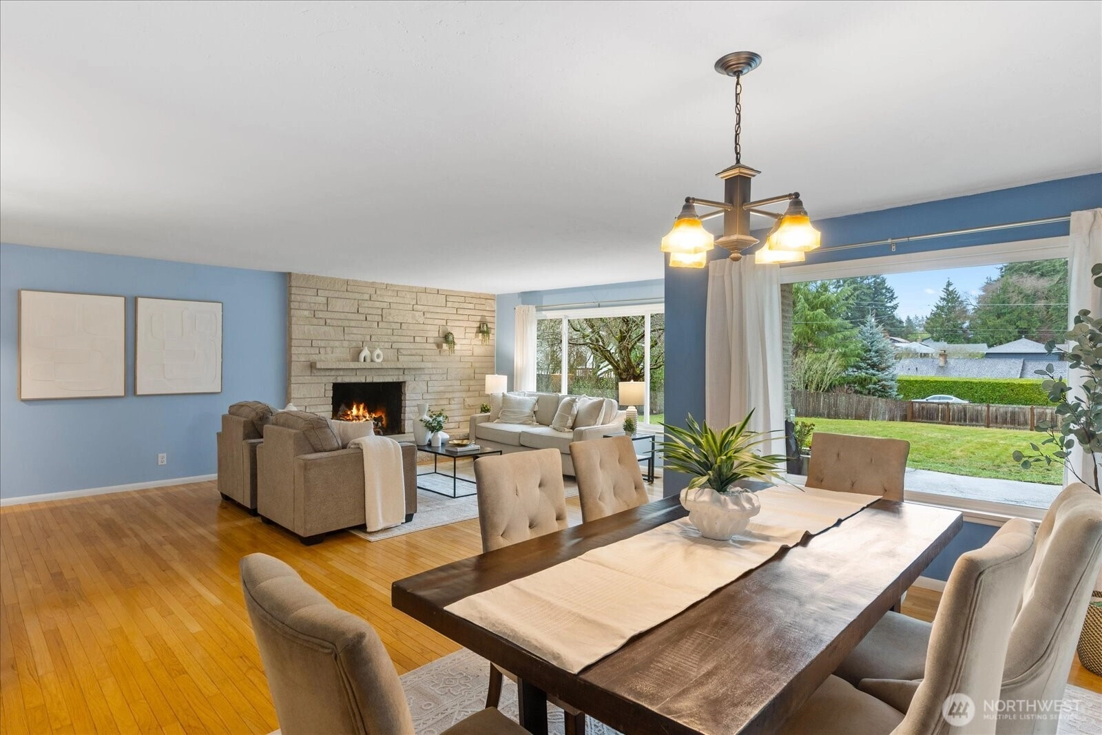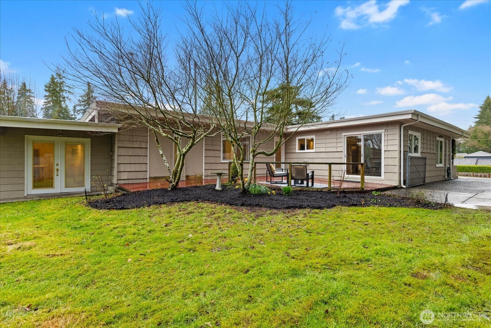Tucked back off of a quiet street, this mid-century modern rambler offers space, privacy, and endless possibility. Set on a huge, 18,000sqft fully fenced lot surrounded by fruit trees, flowering shrubs and edible berries. This home is filled with natural light and serene views from every window. Spacious living and dining areas center around a cozy wood-burning fireplace—ideal for gathering or quiet evenings in. The refreshed kitchen features new LVT flooring, all new appliances, and space for a breakfast nook overlooking the peaceful patio and visiting wildlife. Enjoy year-round comfort with new mini-splits throughout providing efficient heating and cooling from room to room. Newly installed TPO (Thermoplastic Polyolefin) roof complete with added insulation for peace of mind. With its NR3 zoning, the expansive lot offers exciting DADU or future build potential (buyer to verify). Large shop/studio with electric heat and a two-car garage add versatility for hobbies, storage, or creative space. Conveniently located near sought-after Boeing Creek Park and Sunset Park and within the Shoreline School District. A rare opportunity to live, expand, and create your vision.