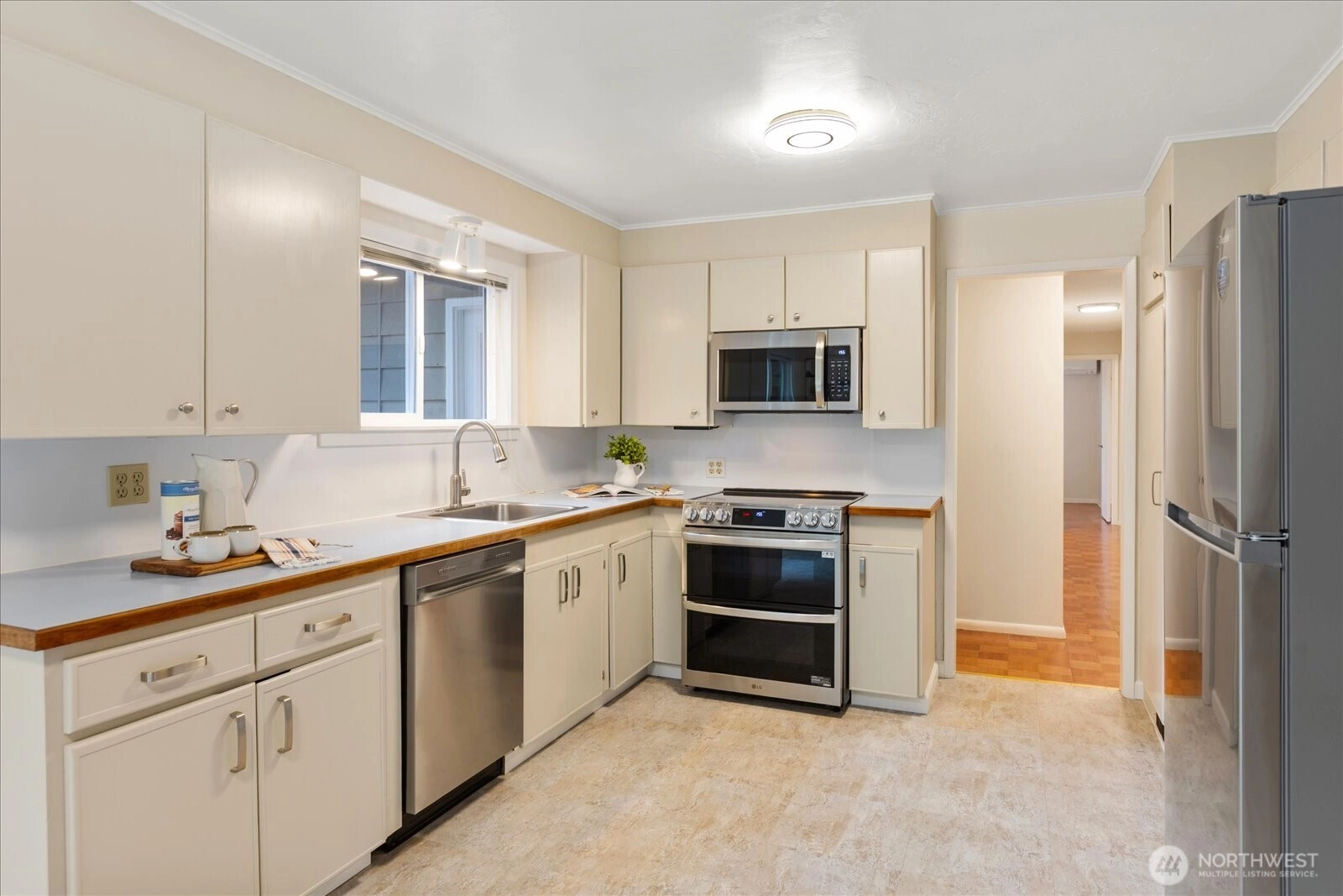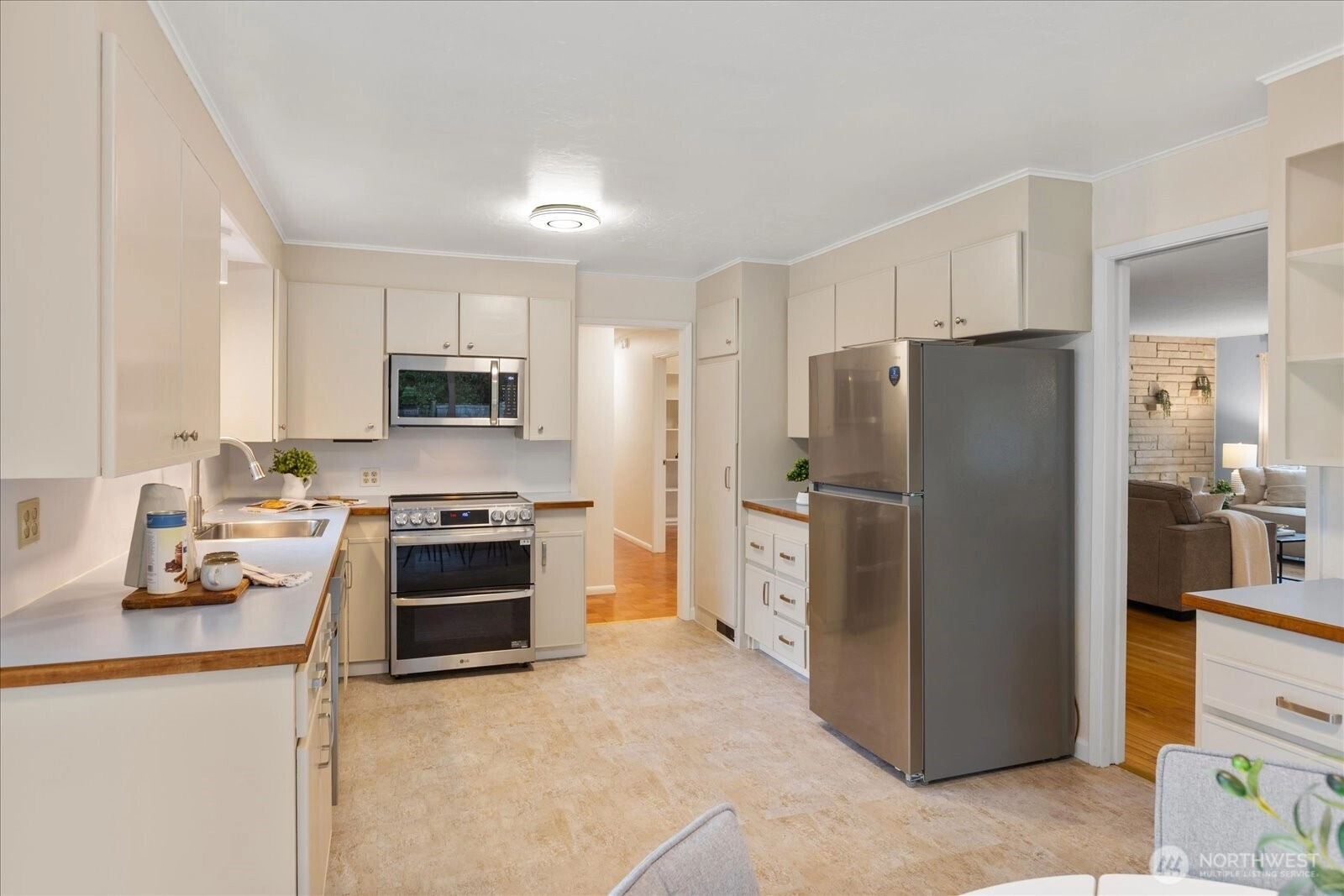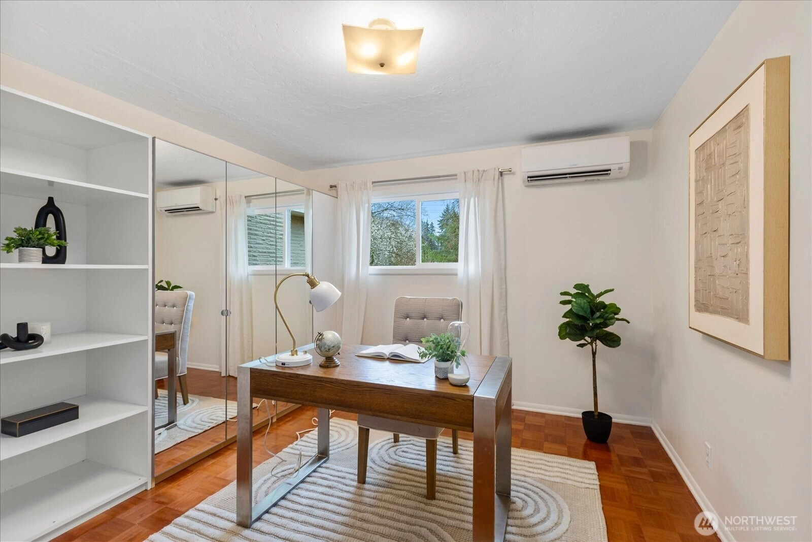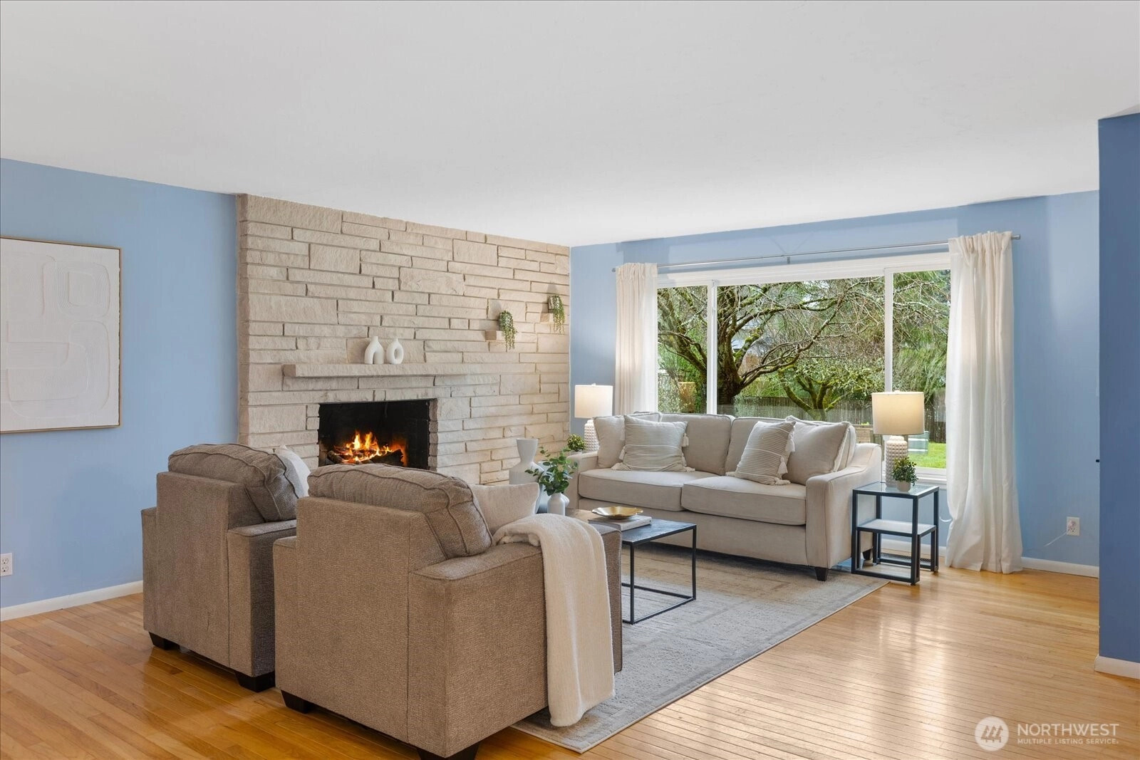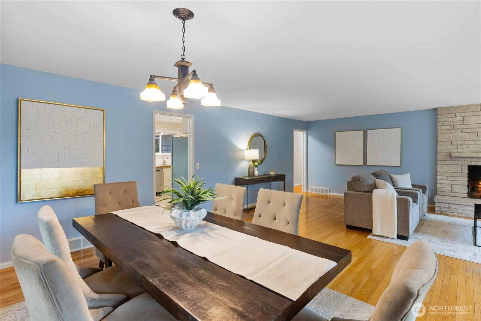 Tucked back off of a quiet street, this mid-century modern rambler offers space, privacy, and endless possibility. Set on a huge, 18,000sqft fully fenced lot surrounded by fruit trees, flowering shrubs and edible berries. This home is filled with natural light and serene views from every window. Spacious living and dining areas center around a cozy wood-burning fireplace—ideal for gathering or quiet evenings in. The refreshed kitchen features new LVT flooring, all new appliances, and space for a breakfast nook overlooking the peaceful patio and visiting wildlife. Enjoy year-round comfort with new mini-splits throughout providing efficient heating and cooling from room to room. Newly installed TPO (Thermoplastic Polyolefin) roof complete with added insulation for peace of mind. With its NR3 zoning, the expansive lot offers exciting DADU or future build potential (buyer to verify). Large shop/studio with electric heat and a two-car garage add versatility for hobbies, storage, or creative space. Conveniently located near sought-after Boeing Creek Park and Sunset Park and within the Shoreline School District. A rare opportunity to live, expand, and create your vision.
