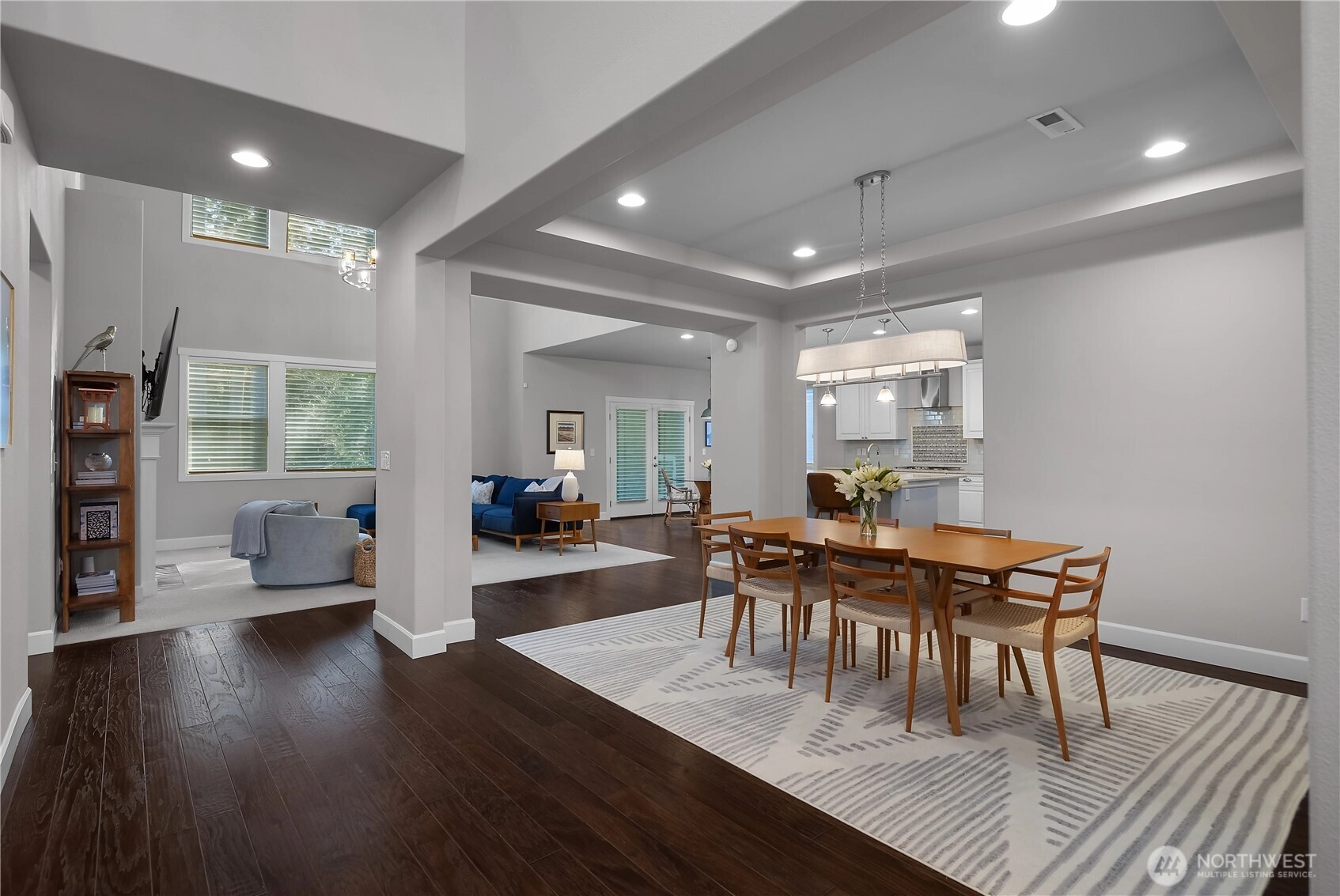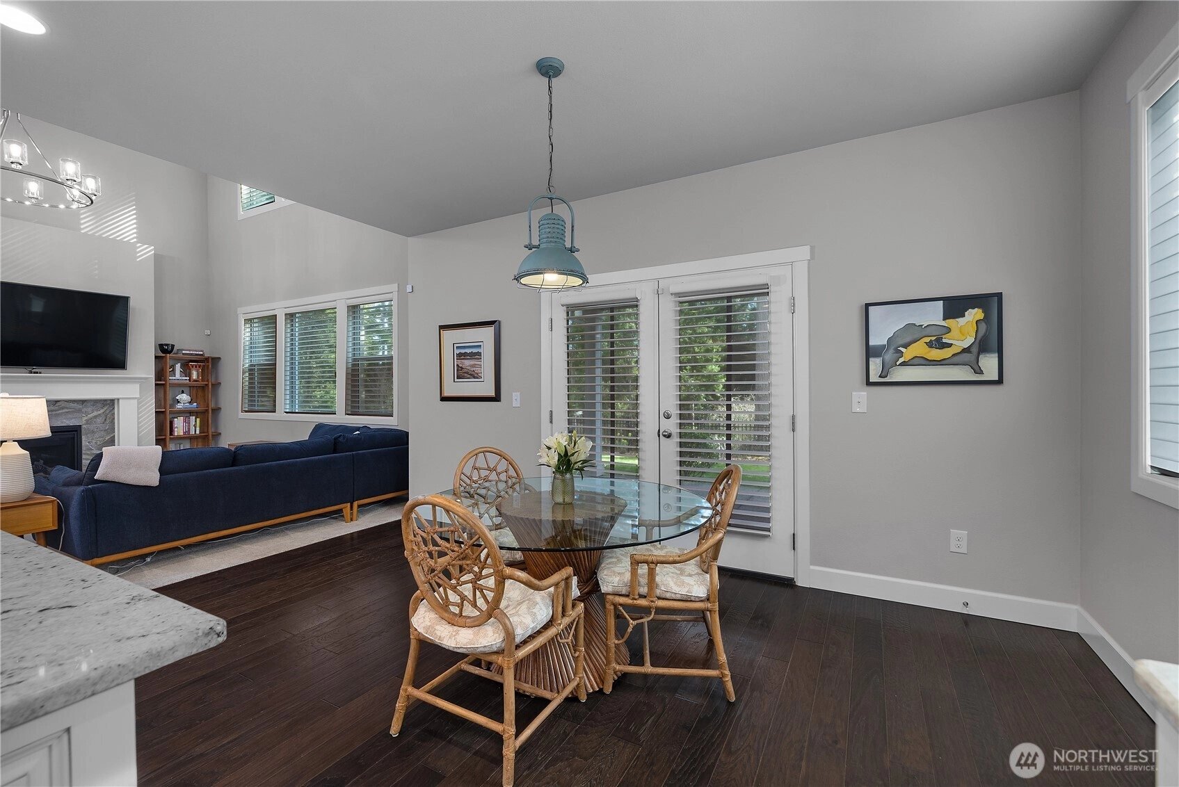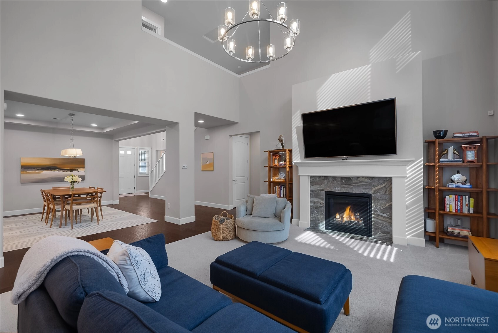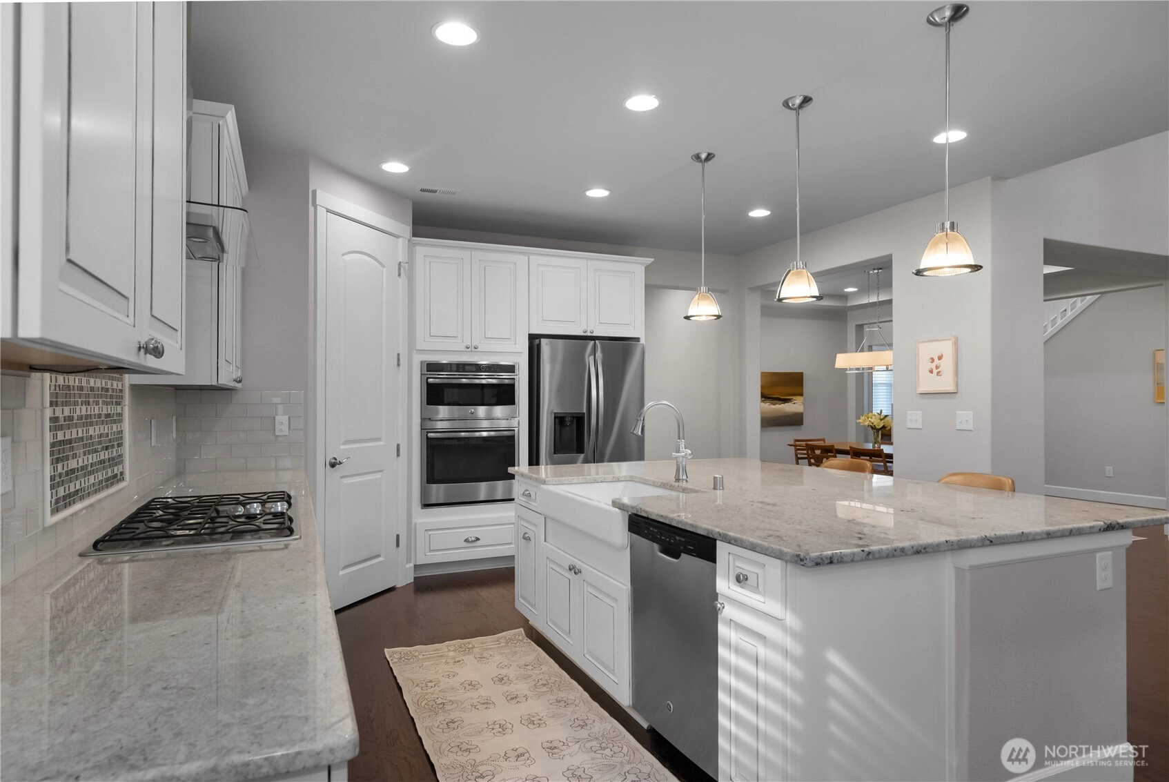 Beautifully appointed home featuring a sought-after main-floor primary suite, ideally situated on a scenic golf course lot at the end of a charming cul-de-sac. This impressive floor plan features gorgeous wood floors, a dramatic two-story entry and great room with gas fireplace, spacious dining room, and large main-floor office. The chef’s kitchen offers stainless steel appliances, farm sink, granite counters, pantry, and abundant cabinetry. The luxurious primary suite boasts a spa-like bath with soaking tub and custom walk-in closet. Upstairs includes three generous bedrooms and a full bath. Enjoy year-round outdoor living on the covered patio with gas fireplace, fully fenced backyard, and serene golf course views. Additional highlights include A/C, sprinkler system, high-end window coverings, and included appliances. Close to I-5, Shopping, Golf Course, and JBLM. Welcome Home!