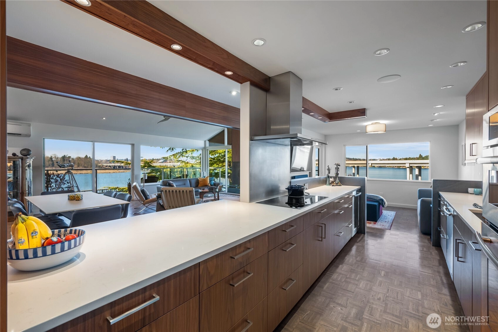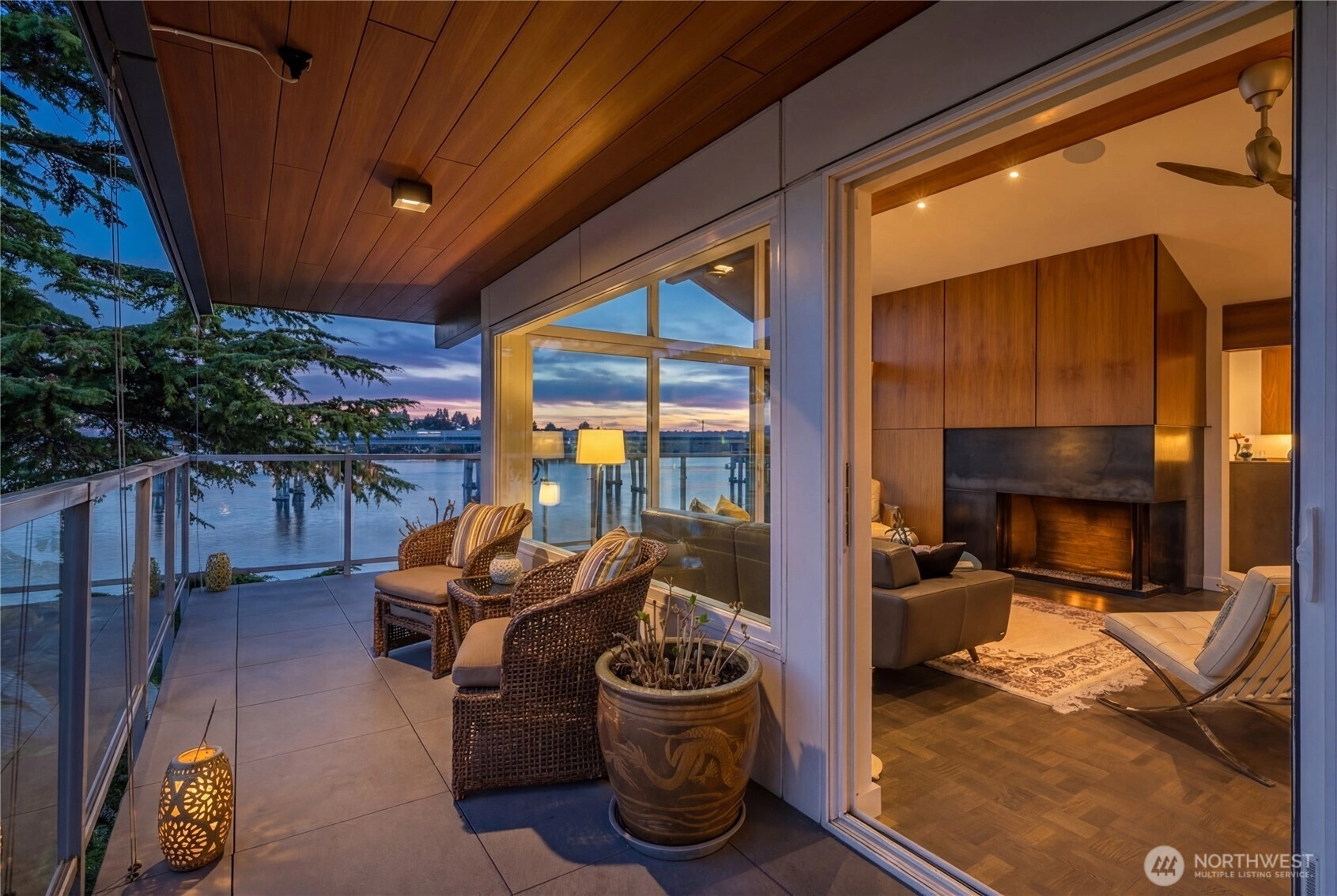 This is the home you’ve been waiting for; a large Mid-Century condo sitting on the edge of Lake Washington with north and west water, and sunset views from every window. From the oversized windows and the wrap-around deck you will experience eagles, herons, kayakers, boaters, and crew shells gliding by on a daily basis. You will be impressed by the fully-remodeled home with generous use of rich woods, original parquet floors and waxed steel details. An exquisite kitchen opens to the dining and living rooms, and also to the relaxing lounge, a perfect place to start and end your day. Every detail has been considered, including adding additional insulation to keep the home always comfortable. State of the art lighting throughout. Mini-splits keep the house cool on warmer days. The office has water views and frosted sliding doors that open to the living room. The Primary Suite is tailored and elegant with wood panels, metal trim and floor-to-ceiling drapes; very Mad Men. Bathrooms with heated floors and Robern cabinets. Multiple closets and a well designed kitchen provide a copious amount of storage. Plus an additional storage closet just steps from the front door. Community features a seasonal pool, a dock for your boat, an exercise room, plus bike & kayak storage, and a gated garage parking. Enjoy Madison Park beach, restaurants, shops and much more. Appreciate easy access to the freeway, downtown and the University of WA. Waterfront living at its best.
