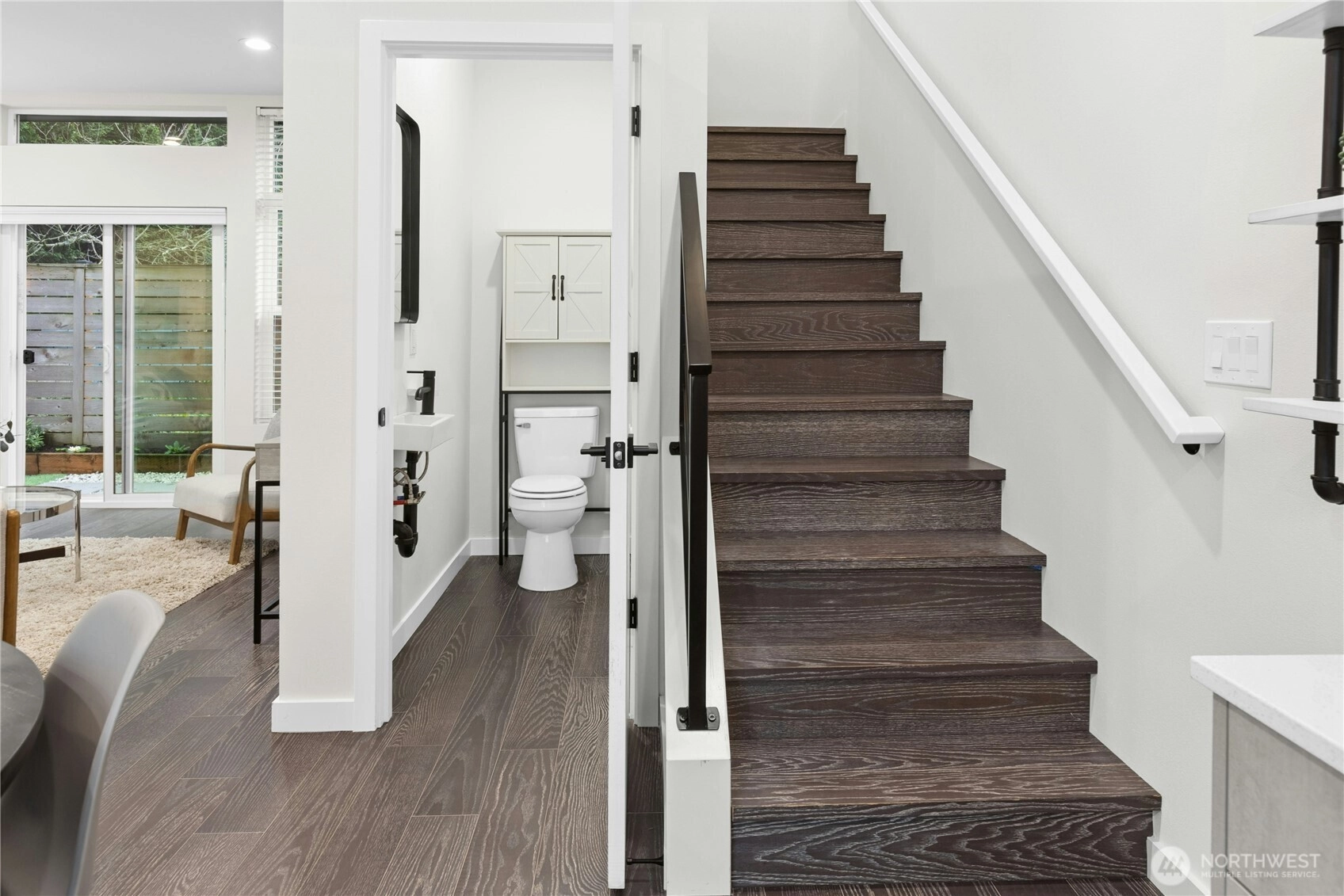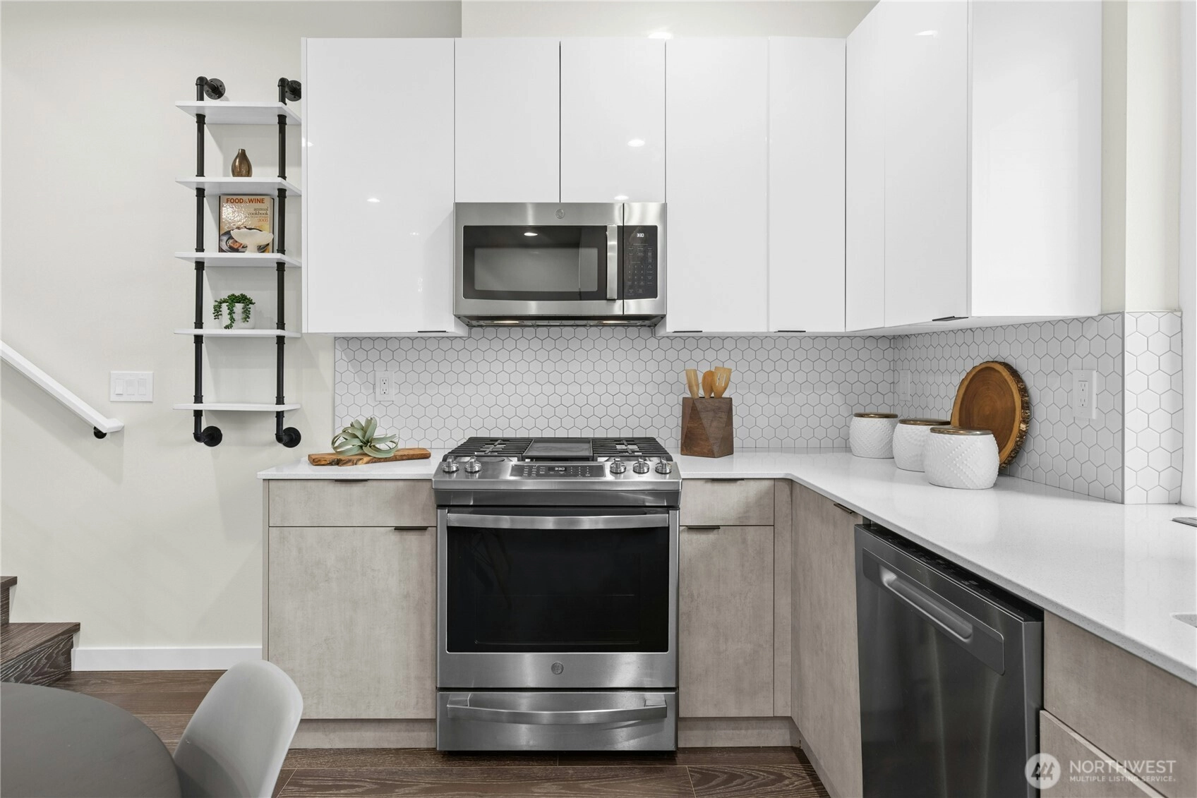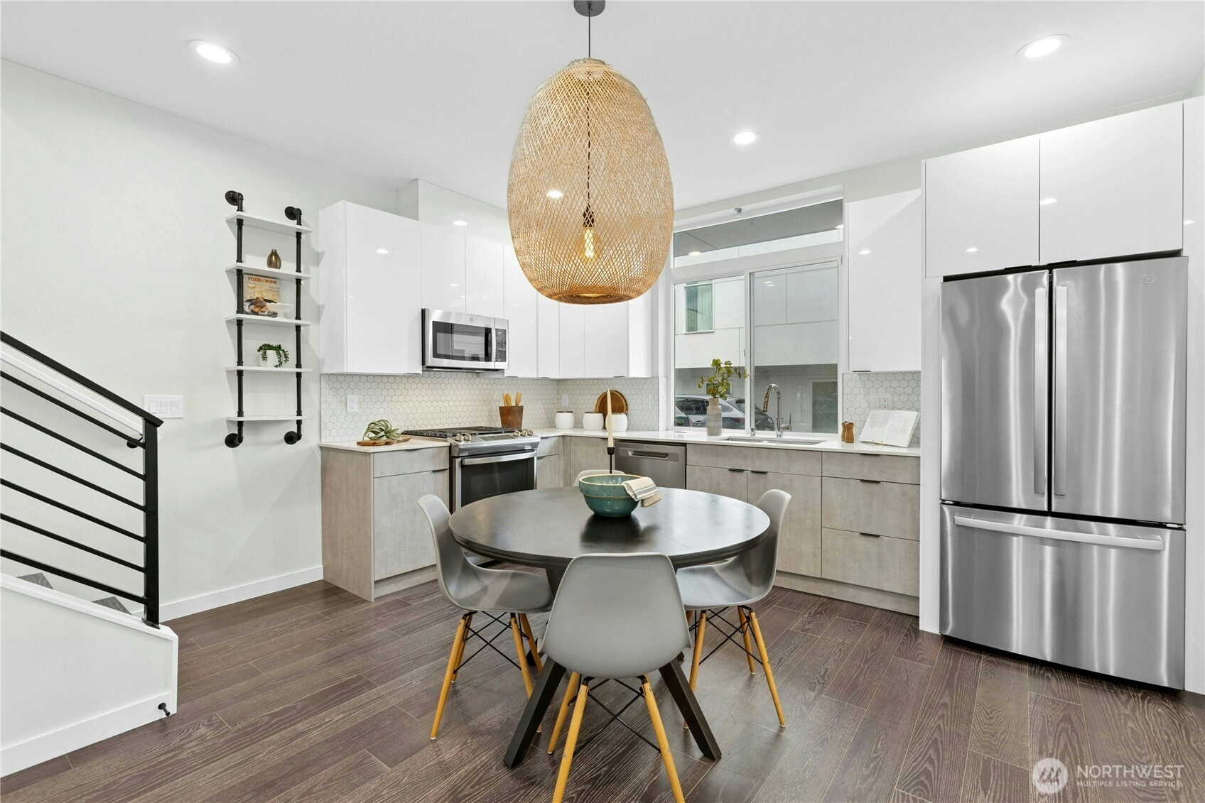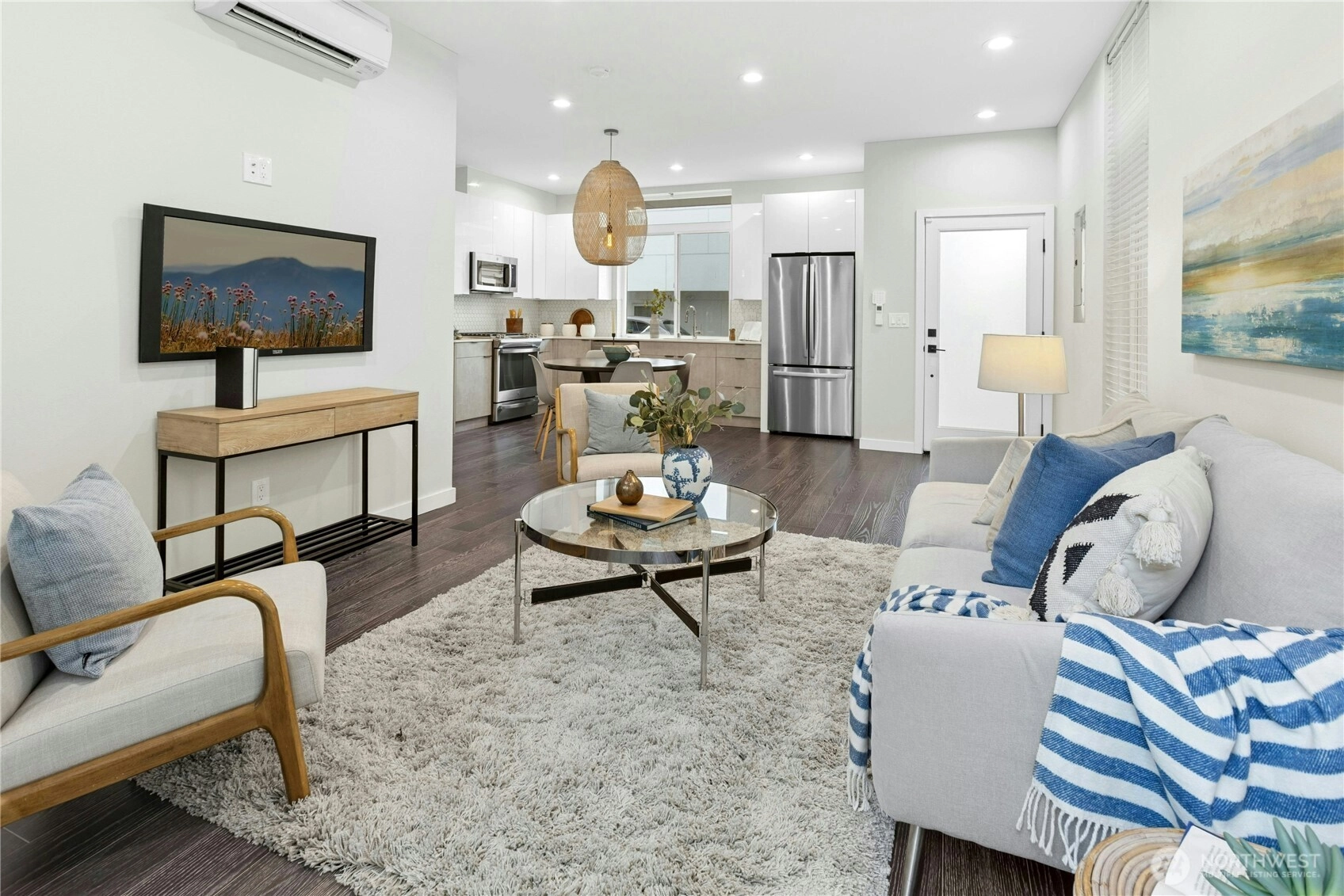 Enjoy modern living in the heart of Ballard! With only one shared wall and no HOA, this thoughtfully designed 4-bedroom, 2.5-bath home offers the perfect blend of privacy, smart functionality, and seamless indoor-outdoor living. The light-filled entry level features rich engineered hardwood floors and an open layout designed for connection. A flexible living and dining area flows into a stunning open kitchen with sleek white cabinetry, stainless steel appliances, a gas cooktop, a pantry with built-in storage for added convenience, and a powder room—all framed by large windows. Step through sliding doors to your private, low-maintenance patio with premium turf, ideal for pets or quiet morning coffee. The two upper levels host four spacious bedrooms, including a serene primary suite with a luxurious ¾ bath and fully finished walk-in closets. An additional full bath and a conveniently located laundry area complete the upper levels. For grand entertaining, head up to the expansive rooftop deck to enjoy the neighborhood atmosphere. Just outside your front door, an EV-ready parking space adds convenience. All this in a prime location with easy access to public transit—steps from world-class restaurants, shops, nightlife, parks, and the Sunday Farmers Market. Pre-inspected.