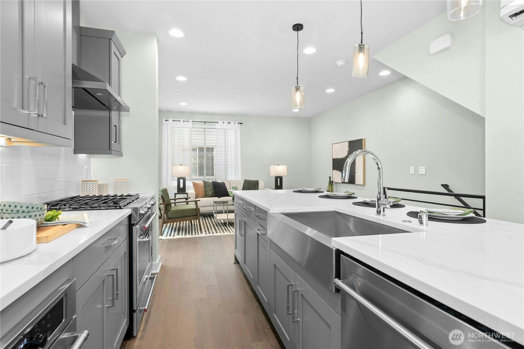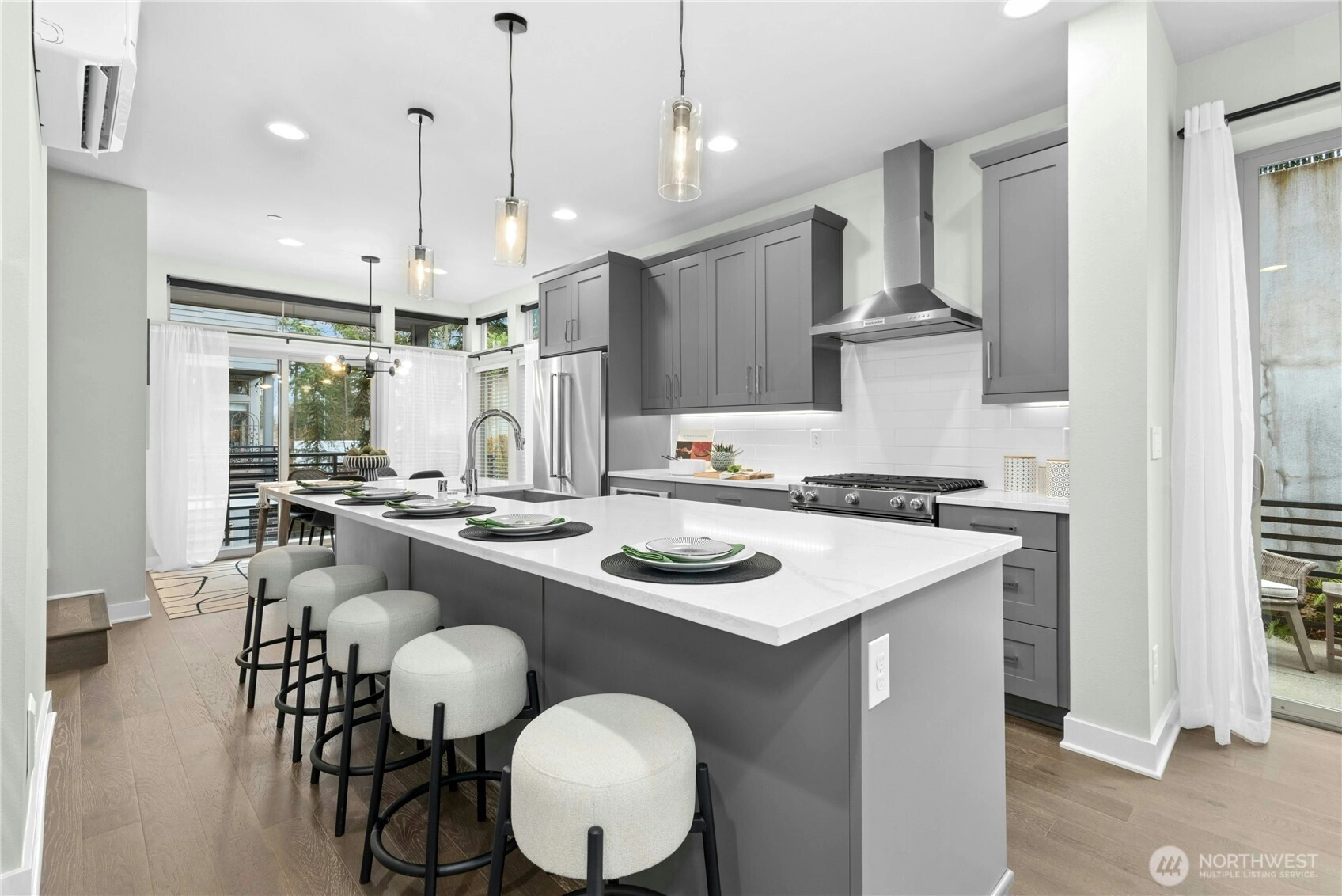 Welcome to Vareze Townhomes in Kirkland! This 2020 Tri Pointe resale offers a small community feel with shared green space, pavilion, and sidewalks, yet just minutes to Totem Lake Village (8 mins), I-405 (2 mins), and Juanita Beach Park (5 mins). Entry level features a tandem 2-car garage with EV charging and flex space perfect for an office or gym. Main level showcases tall ceilings, open-concept living, a large quartz island perfect for entertaining, KitchenAid stainless appliances w/ gas cooking, powder room, and 2 outdoor decks (one covered). Upstairs you’ll find a spacious primary suite with oversized en-suite bath with dual vanities and private water closet, second bedroom en-suite with full bath, and laundry. Mini-splits for year-round comfort! Pet-friendly HOA with no rental cap. Pre-inspected for peace of mind.