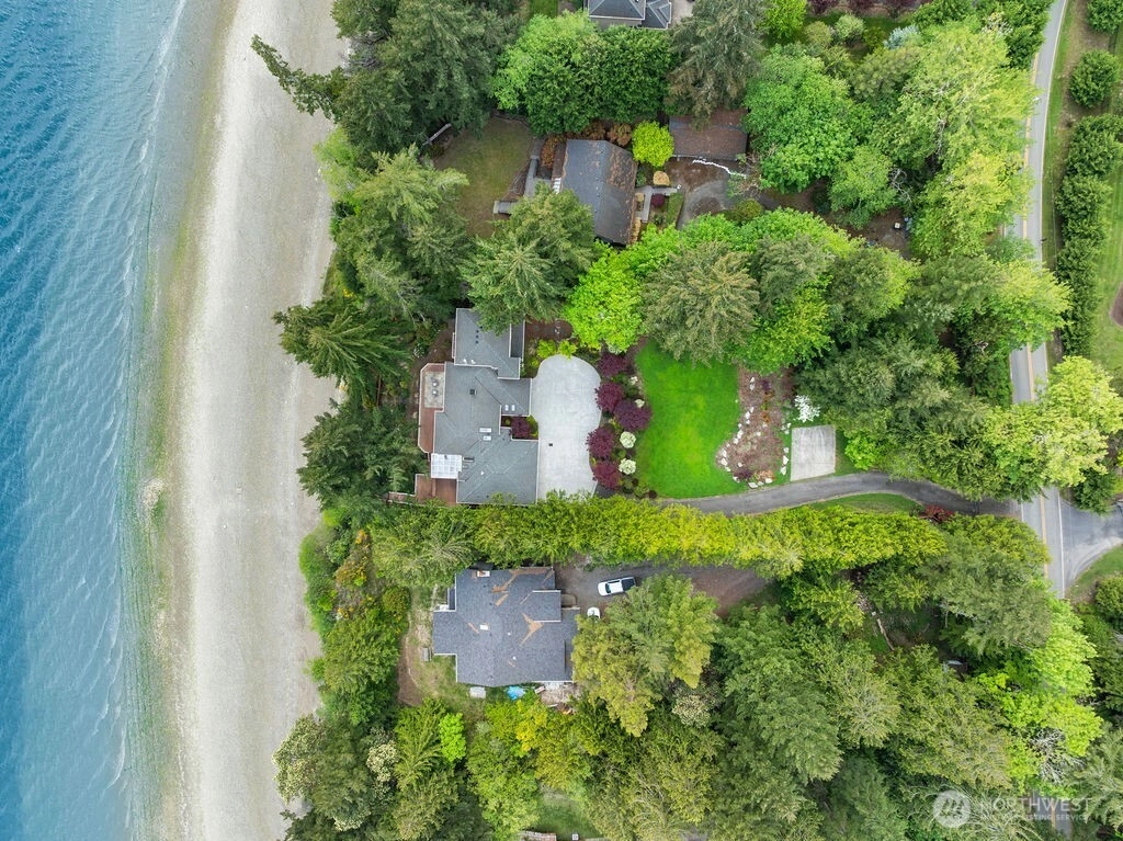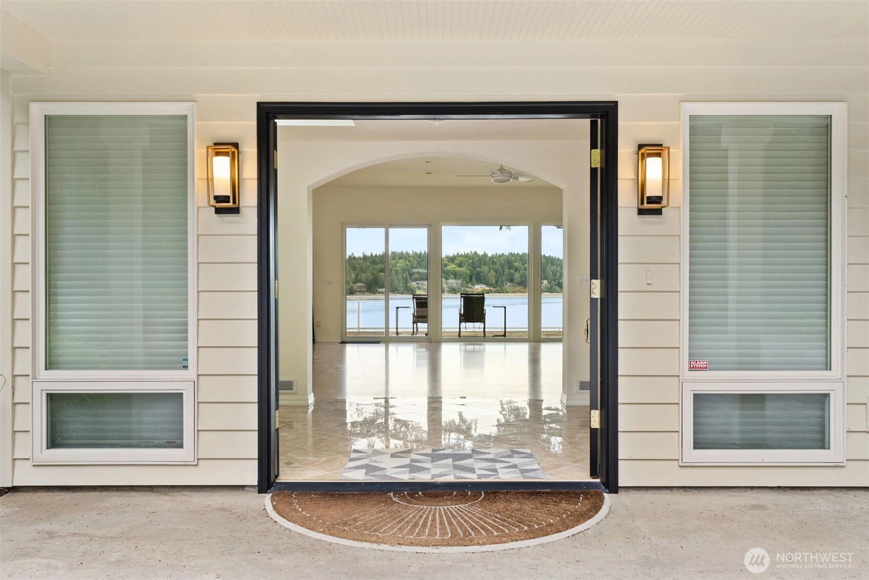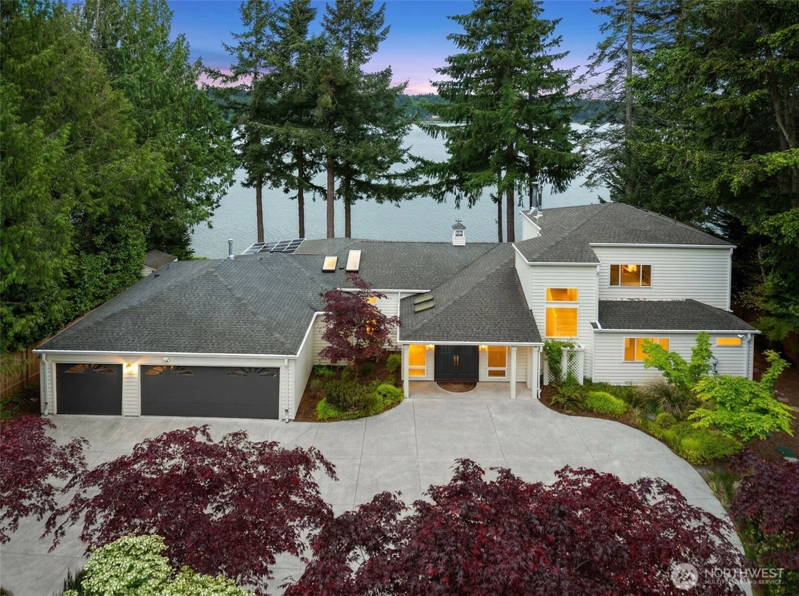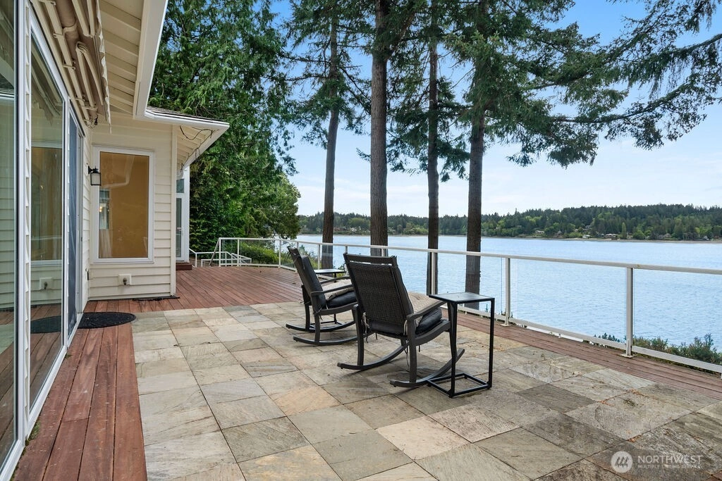 Situated on 119 feet of sought-after Eld Inlet shoreline, this architecturally refined residence delivers sweeping water views from nearly every vantage point. With direct beach access and a private buoy, days on the water come effortlessly. The thoughtfully designed layout offers 3 bedrooms, a flexible bonus room (possible 4th bedroom) with a built-in Murphy bed, a sun-filled solarium, and a generous 3-car garage. Recent updates include a newer roof, updated windows, a new septic system, and a fully fenced, gated approach. Inside, elevated finishes define the space with marble-style and hardwood flooring, custom cabinetry, granite solid surfaces, built-in closet systems, three fireplaces, and air conditioning for year-round comfort. Upper level parking area with concrete pad could be converted to a sports court or room for possible shop. Outdoor living is equally compelling, featuring expansive Trex decking, modern glass railings, and a retractable awning, all set within beautifully enclosed grounds designed for both entertaining and quiet retreat. Wake to tranquil Puget Sound vistas, or step onto your private balcony to begin the day immersed in the natural beauty of true waterfront living.