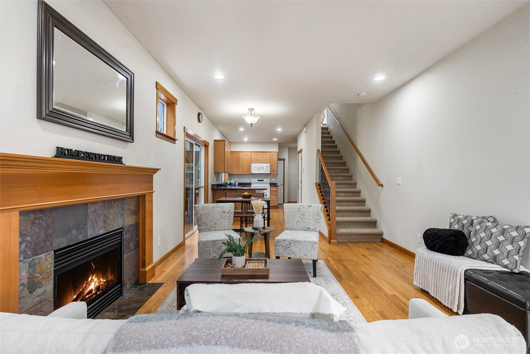 Welcome to this beautiful 3-bedroom + loft/den townhome offering 1,598 square feet, built in 2009 and located in the highly desirable Kassys Crossing community. The main floor features hardwood floors, a cozy gas fireplace, and an inviting open layout perfect for everyday living. The spacious kitchen offers ample cabinet space for storage and functionality. Step outside to the deck—ideal for relaxing or entertaining. Upstairs you'll find spacious bedrooms and a versatile loft/den area perfect for a home office, play area or more. The primary suite includes a 5-piece bathroom and walk-in closet. Additional highlights include a tandem 2-car garage with plenty of storage, low HOA dues, and a well-maintained community. Conveniently located within walking distance to a bus stop and just minutes to grocery stores, restaurants, Boeing, Paine Field Airport, and more. Located in the Edmonds School District. Welcome Home!