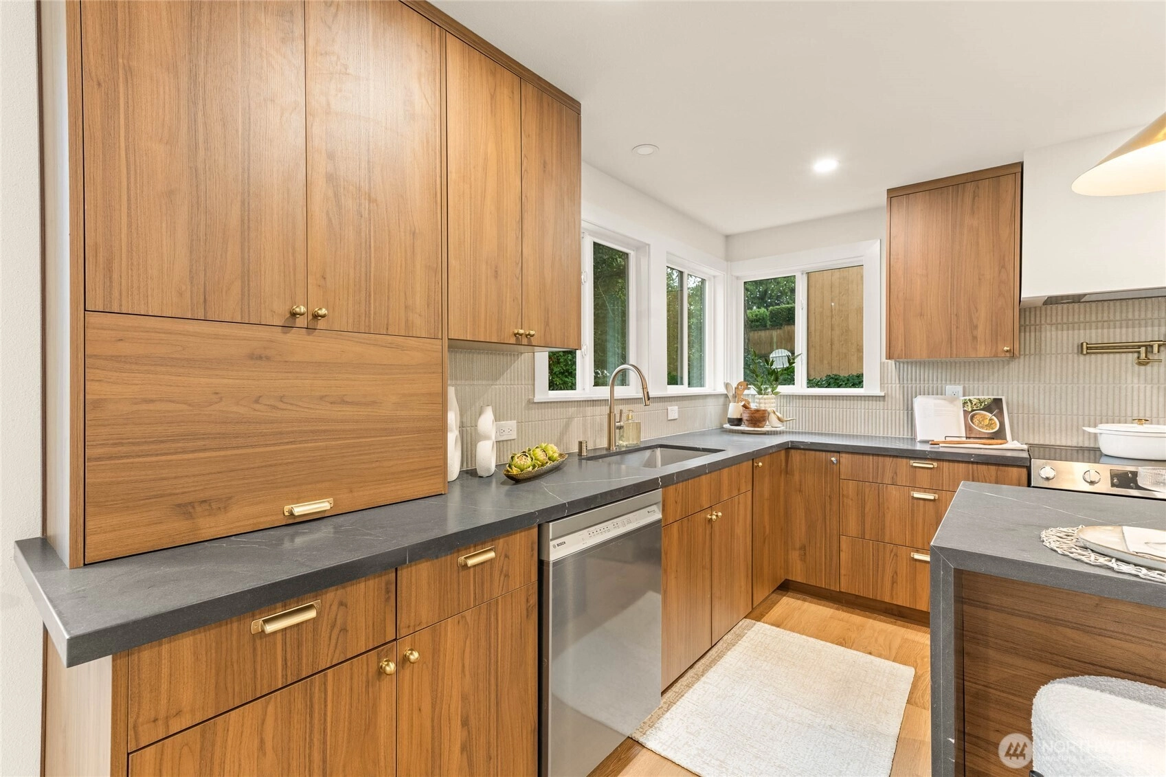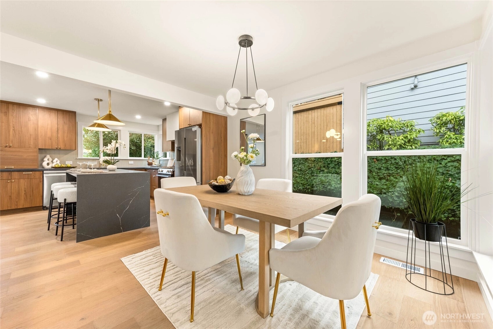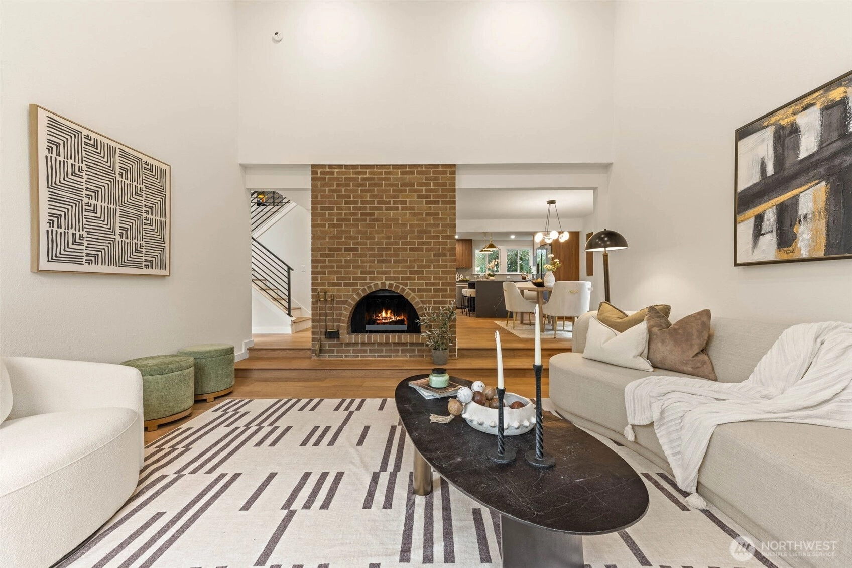 Fully reimagined Mid-Century Modern in the heart of Totem Lake, thoughtfully remodeled while preserving the architectural elements that make this era so enduring - all within the highly regarded Lake Washington School District. Vaulted ceilings and clean architectural lines create an immediate sense of luxury. A restrained material palette of warm wood cabinetry and dark stone surfaces grounds the open living spaces, while Bosch appliances anchor the kitchen in performance and simplicity. A built-in wet bar with wine refrigeration extends the material palette, creating continuity throughout the home. The primary suite unfolds into a spacious five-piece bath conceived as a true retreat: a large-format wet room with dual shower heads, a freestanding soaking tub placed with intention, dual vanities, and a separate water closet. Recent upgrades include a new roof and new windows, reinforcing both performance and longevity. At the center of the home, the original curved fireplace remains untouched — a rare sculptural form that softens the geometry of the space and serves as a striking architectural focal point. It is both art and structure, and the soul of the home. An expansive rear deck extends the living area outdoors, designed to accommodate summer gatherings while maintaining privacy and ease. Architecturally grounded. Warmly modern. A refined Mid-Century residence in one of Kirkland’s most connected neighborhoods.