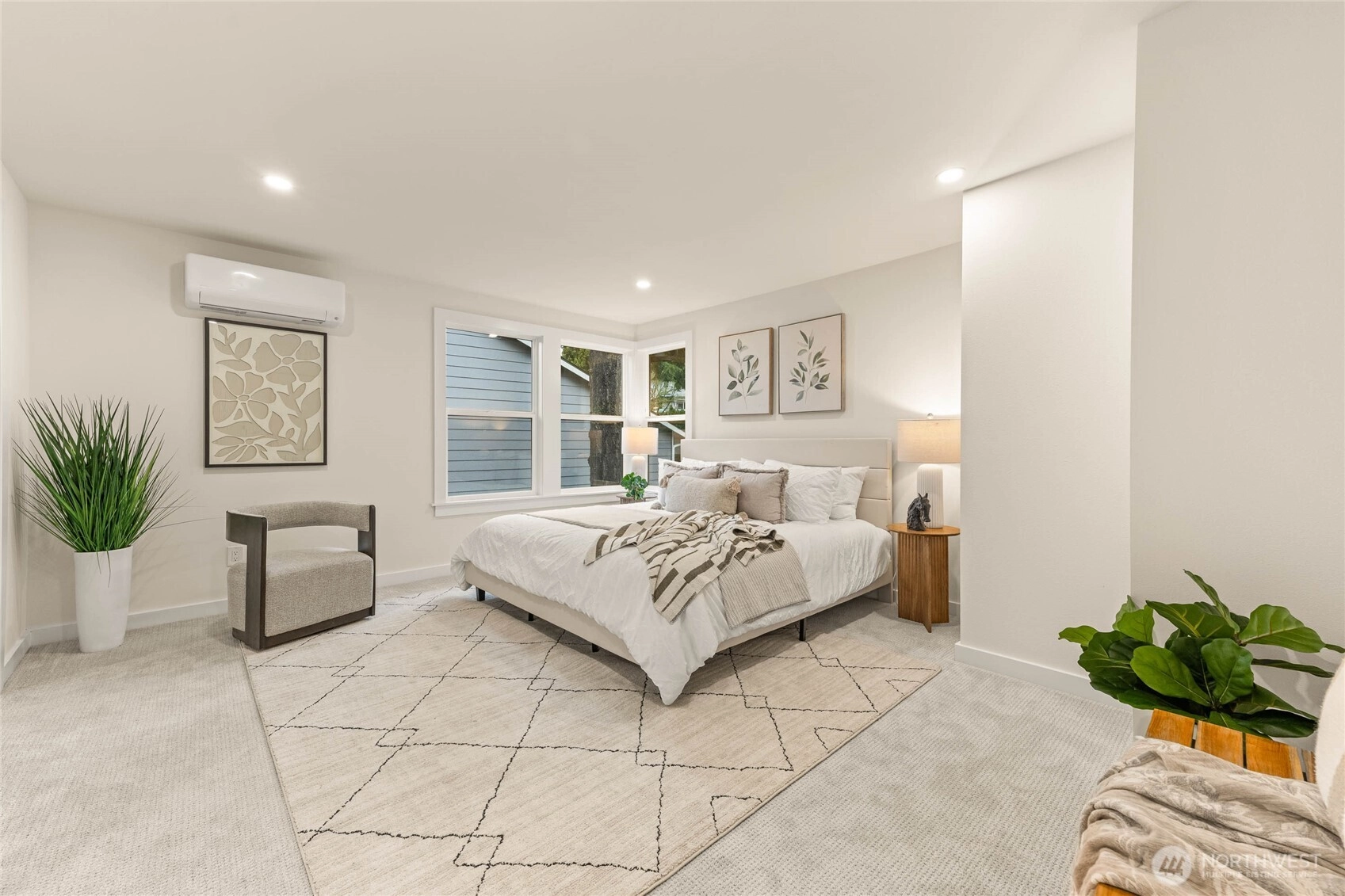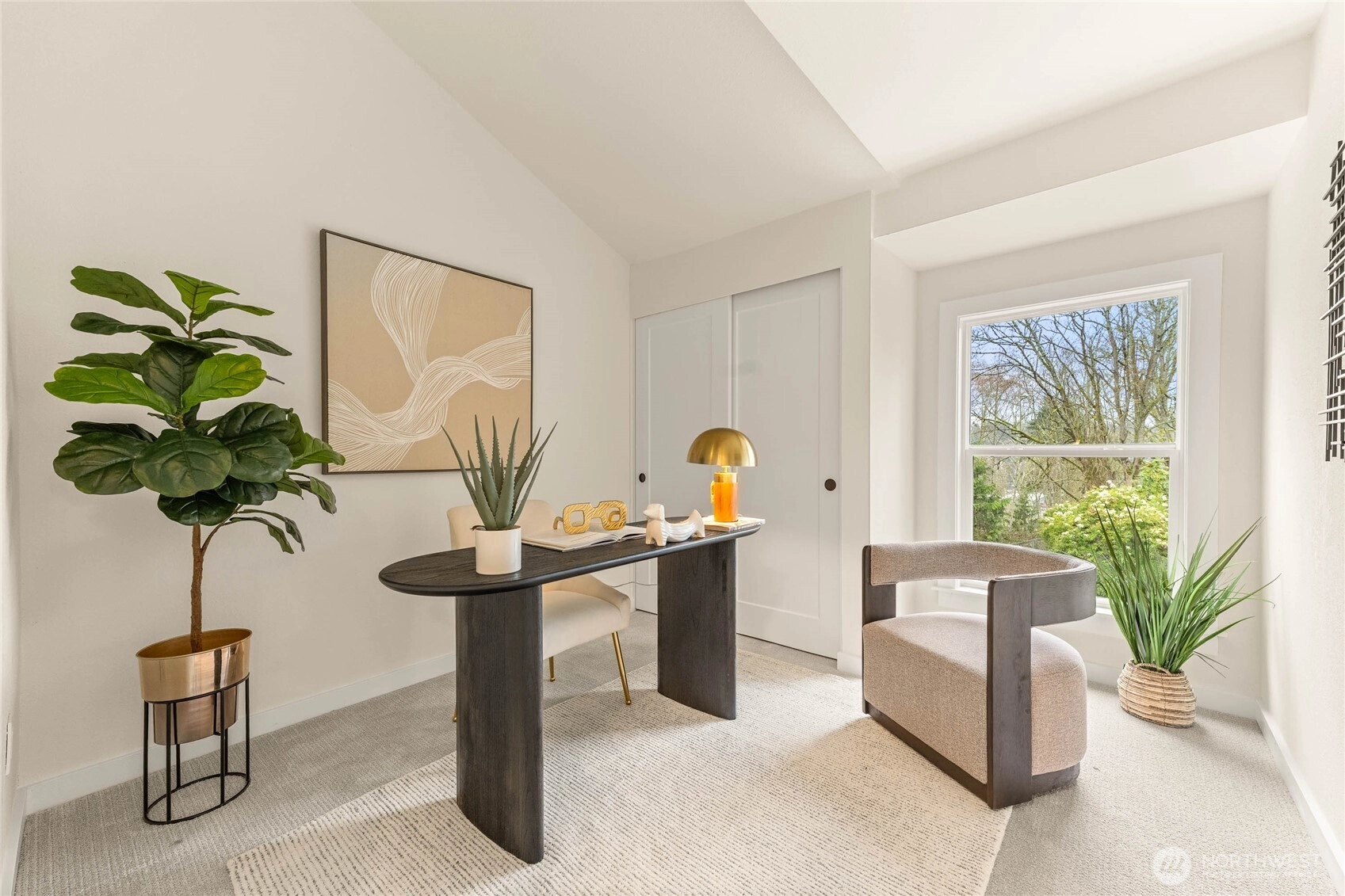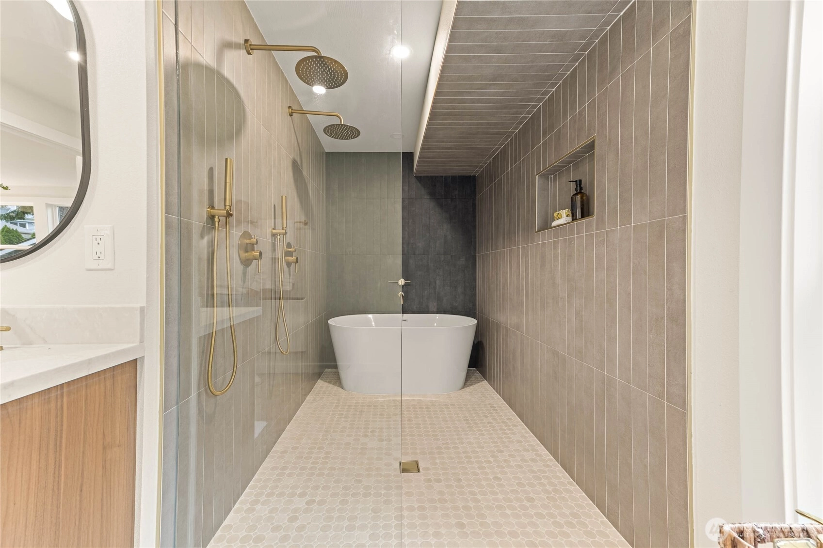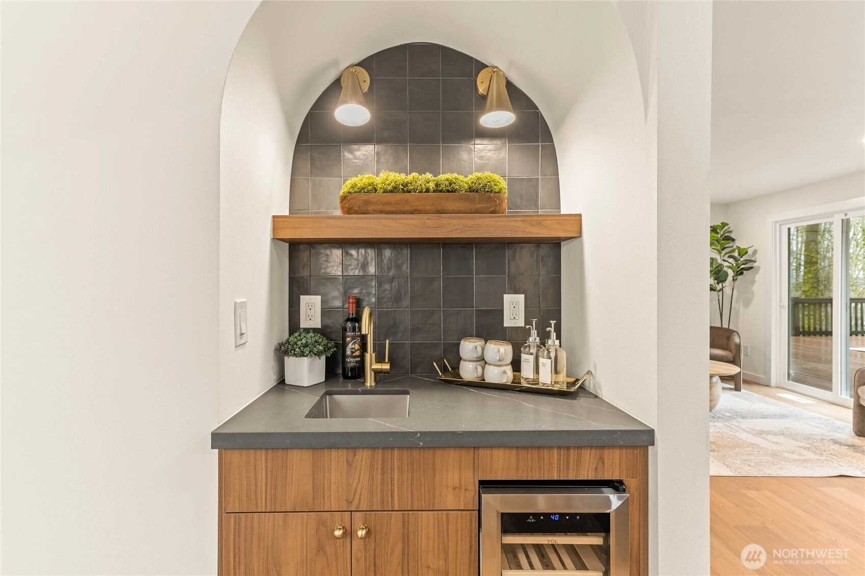 Fully reimagined Mid-Century Modern in the heart of Totem Lake, thoughtfully remodeled while preserving the architectural elements that make this era so enduring - all within the highly regarded Lake Washington School District. Vaulted ceilings and clean architectural lines create an immediate sense of luxury. A restrained material palette of warm wood cabinetry and dark stone surfaces grounds the open living spaces, while Bosch appliances anchor the kitchen in performance and simplicity. A built-in wet bar with wine refrigeration extends the material palette, creating continuity throughout the home. The primary suite unfolds into a spacious five-piece bath conceived as a true retreat: a large-format wet room with dual shower heads, a freestanding soaking tub placed with intention, dual vanities, and a separate water closet. Recent upgrades include a new roof and new windows, reinforcing both performance and longevity. At the center of the home, the original curved fireplace remains untouched — a rare sculptural form that softens the geometry of the space and serves as a striking architectural focal point. It is both art and structure, and the soul of the home. An expansive rear deck extends the living area outdoors, designed to accommodate summer gatherings while maintaining privacy and ease. Architecturally grounded. Warmly modern. A refined Mid-Century residence in one of Kirkland’s most connected neighborhoods.