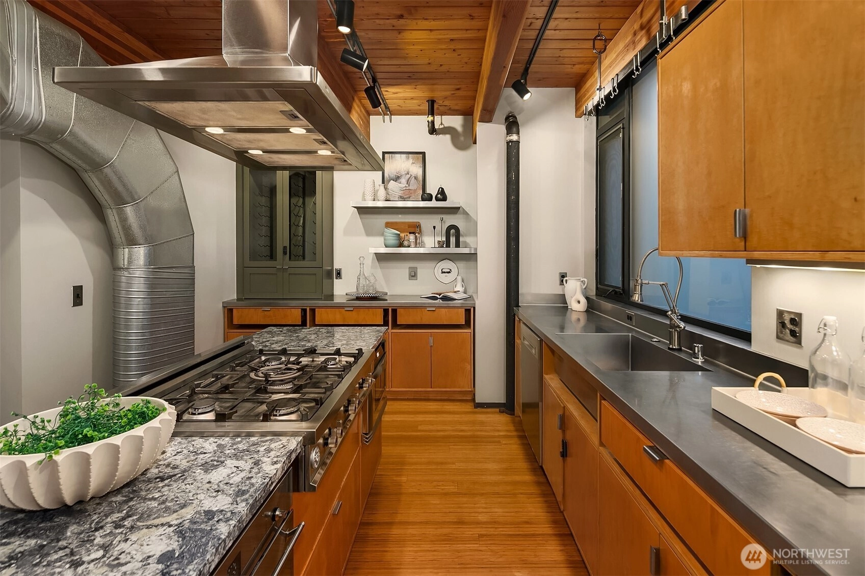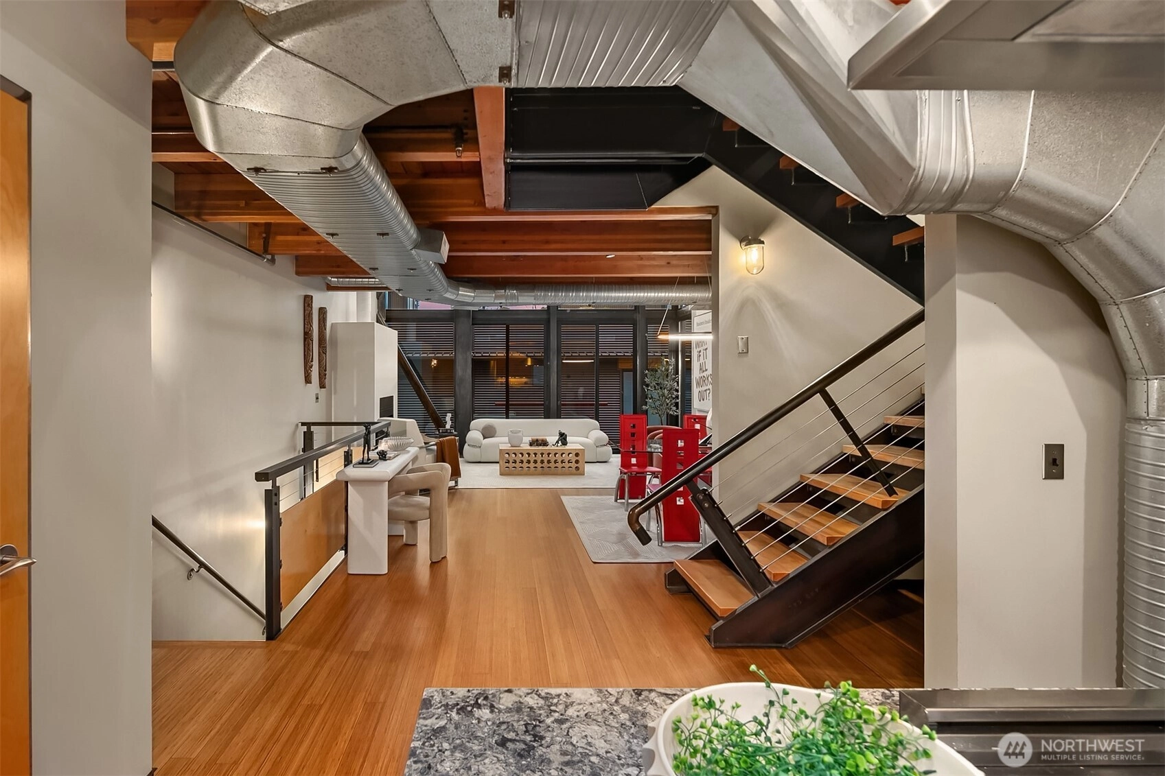 This edgy industrial end unit townhome is sited in an unbeatable location on the Eastside of Queen Anne. Perched above Lake Union and only blocks to South Lake Union & Fremont the in-city central location makes for easy car free commuting to work and play. Features include commercial grade construction, exposed steel cross beams, soaring 25’ ceilings, walls of glass comprising floor to ceiling commercial grade windows, exposed mechanical systems, bamboo floors, maple stairs, a gas fireplace & warm wood beams throughout. Enjoy the panoramic views of Lake Union, the City and Space Needle from the roof top deck at the end of a hard day or weekend relaxing. The gourmet kitchen is made for entertaining with Pental quartz counters & appliances by Bertazzoni, Bosch, Liebherr and Smeg. A Lofted Primary suite & two ensuite bedrooms make a 3 bedroom/3.5 bath home. Concrete, wood panels, metal siding and a cross braced steel frame make up the exterior of The Block condominiums. This home is located at the SW corner of the Boutique 6-unit complex and shares only one wall. Attached large, private 2 car garage of 341sf approx will accommodate your vehicle and storage needs. Your systems include a new heat pump in 2025 providing air conditioning, a new roof in approx 2015, & a tankless on demand hot water heater. HOA dues include building maintenance, water, sewer, garbage, insurance & reserves. Pre-inspected for your convenience.