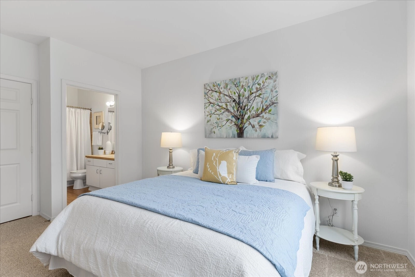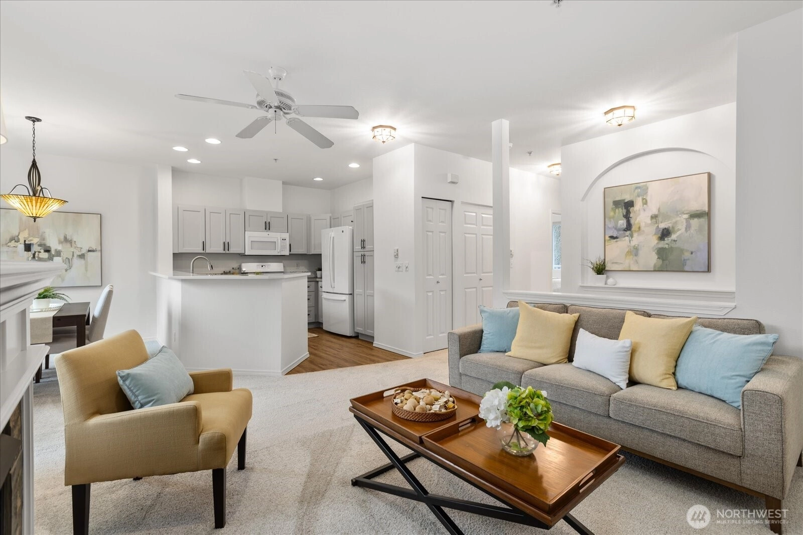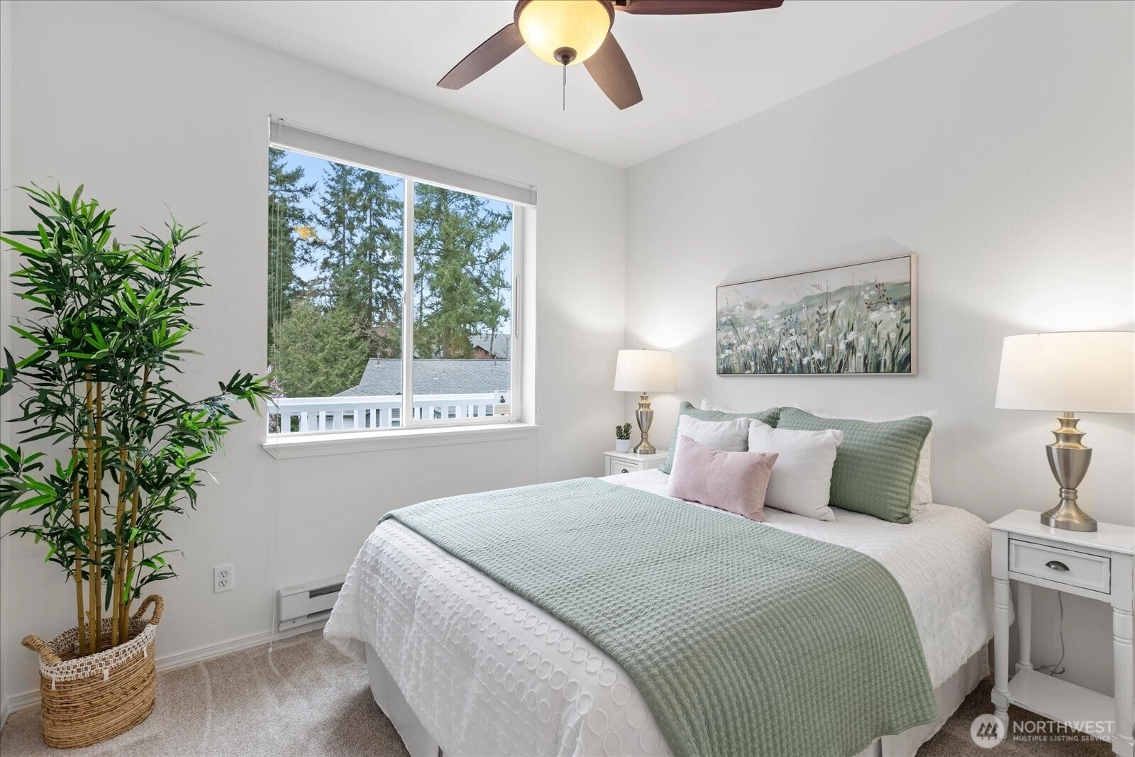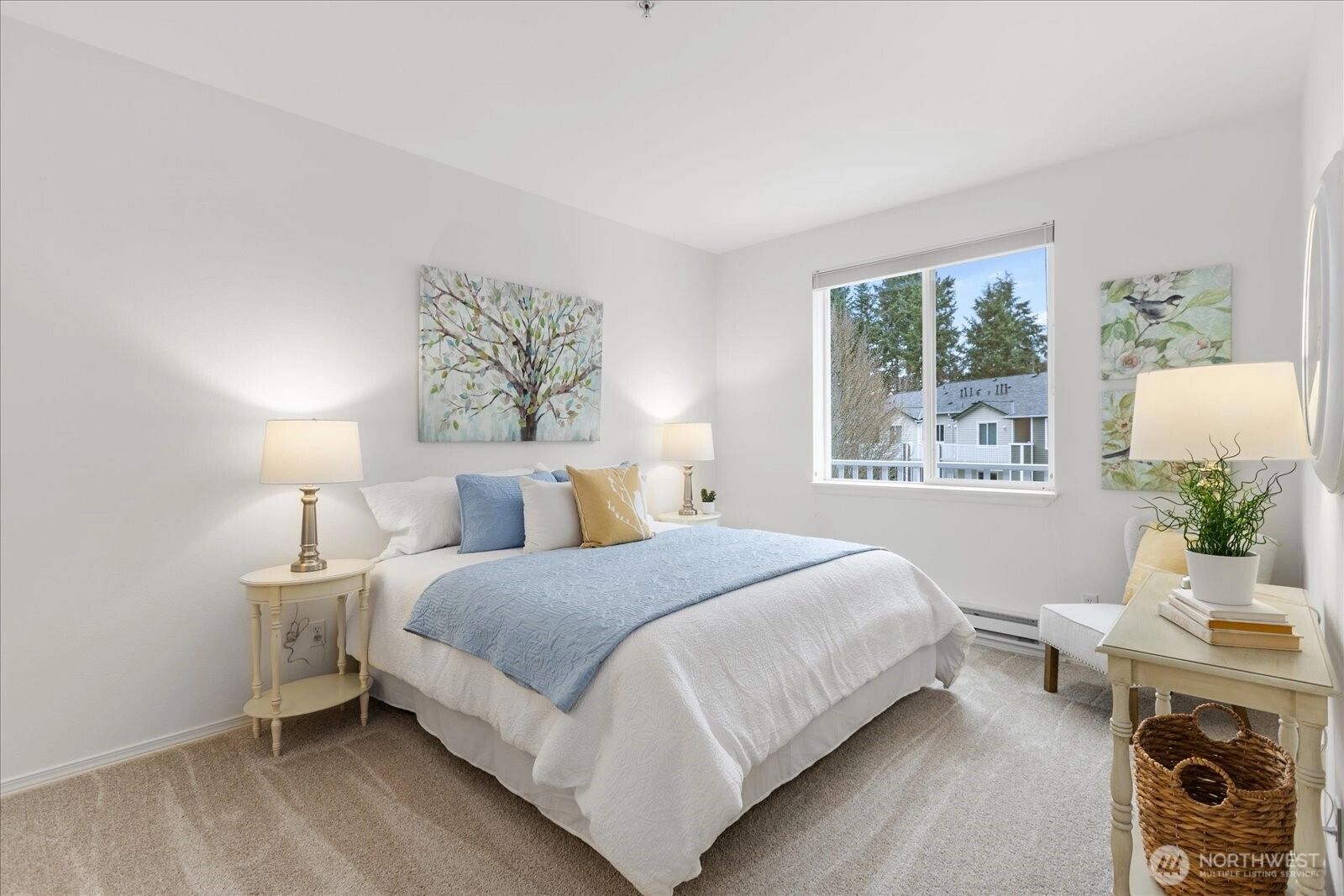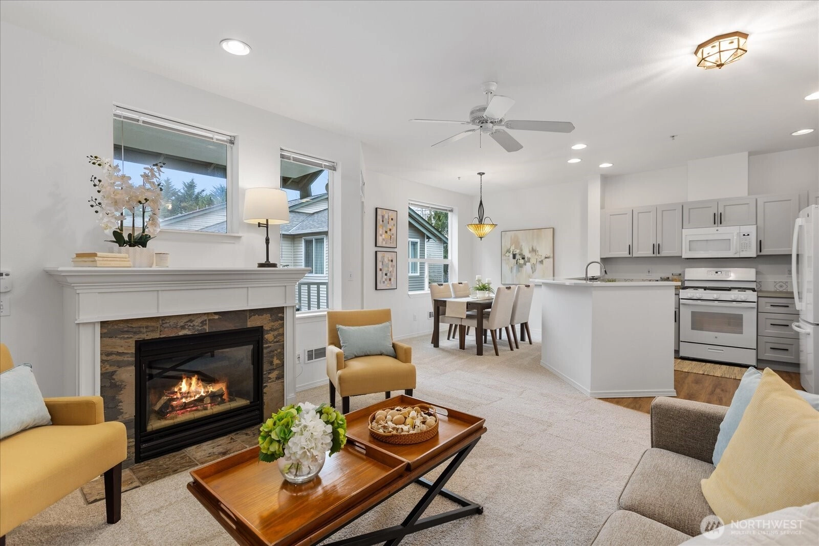 Pristine 2 bedroom, 2 bath condo home in the quiet gated community of Heritage at Deer Creek. The top floor vantage with outlook to wetland reserve enjoys a level of privacy & tranquility rarely found in condo living, while 9 ft. ceilings and oversized windows fill the home with natural light. Inviting, open layout offers the space and versatility to host game nights or dinner parties, and also feels just right for quiet, cozy nights by the fire. Whether you prefer microwave dinners or home baking, the kitchen with generous prep space and pullout storage will meet your needs. The covered deck, a lovely spot to enjoy the afternoon sun while birdwatching, extends your living space in rain or shine. Primary suite with full bathroom and walk-in-closet is a welcome retreat, and 2nd bedroom adjacent to bathroom with step in shower compliments the floorplan. New carpet & paint throughout provides a fresh, turnkey start. Dedicated, covered carport is conveniently located near the stairwell. Abundant visitor parking adds to the ease of entertaining, whether hosting at home or spreading out in the HOA cabana with large outdoor patio. Ideal location for commute with proximity to Hwy 99, I5, Boeing, Park & Ride, and upside potential with future light rail stations anticipated nearby. Pet friendly complex. Mukilteo schools!