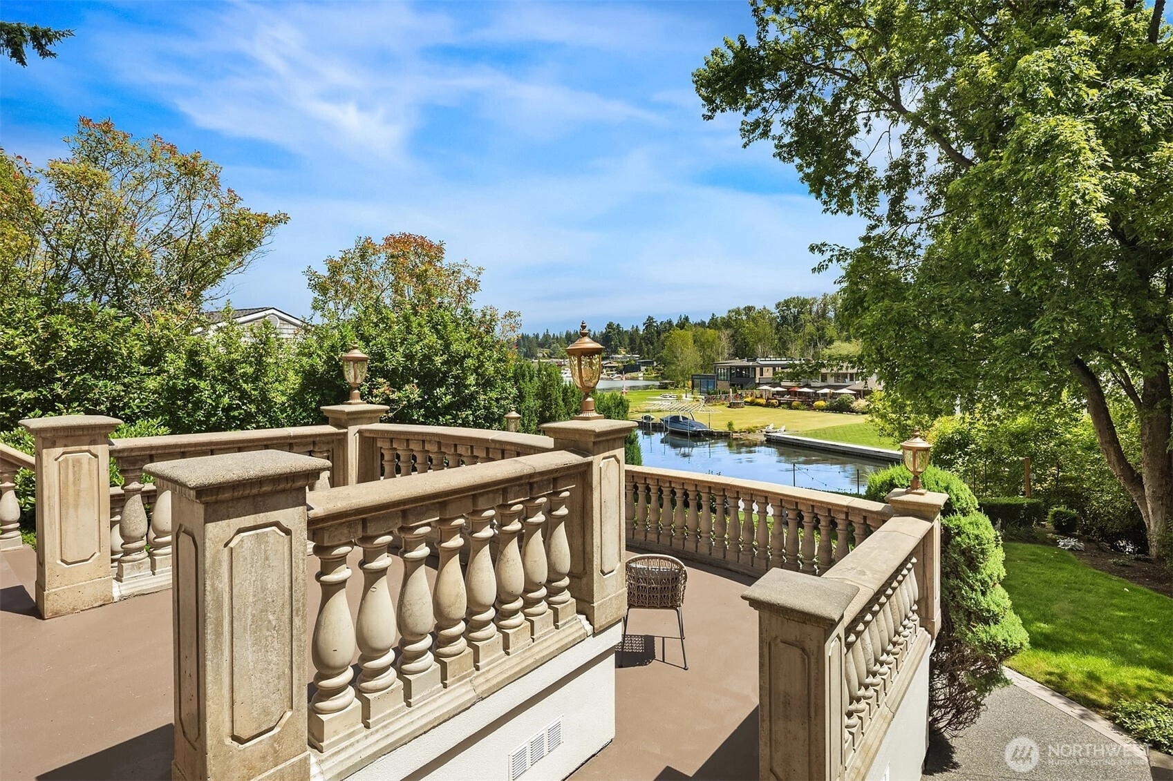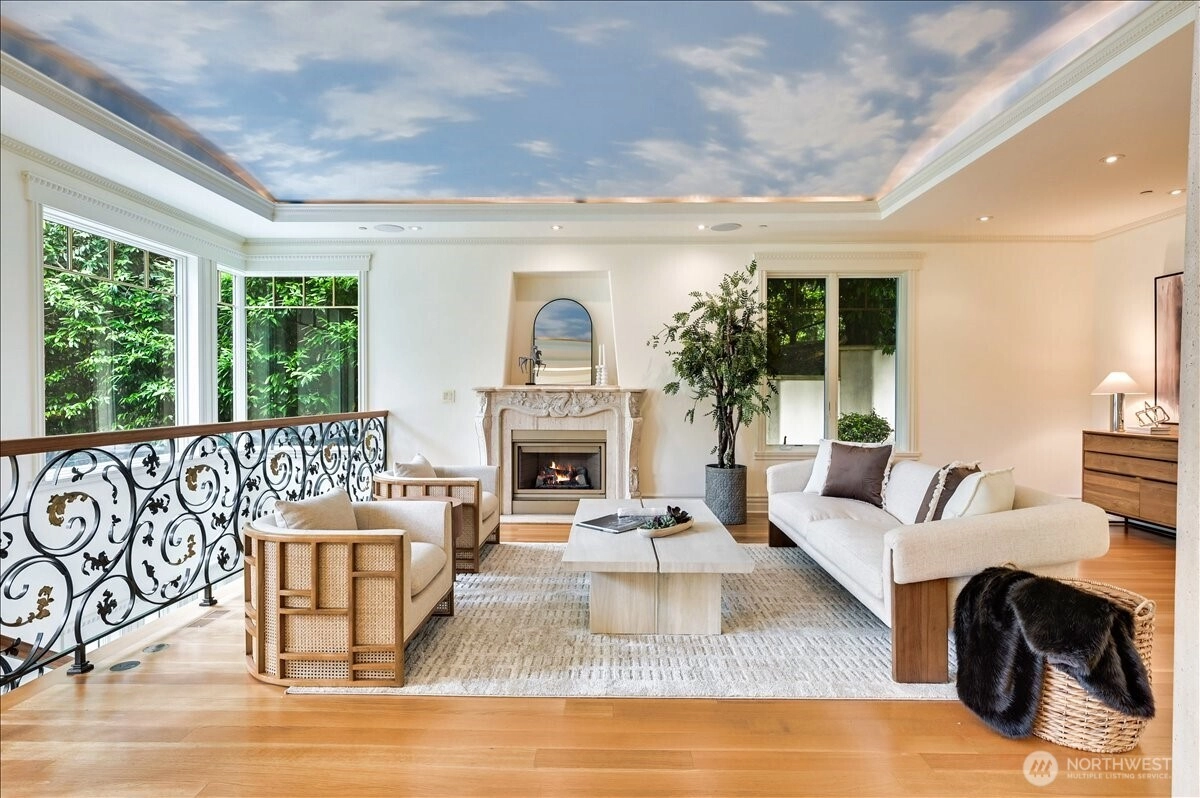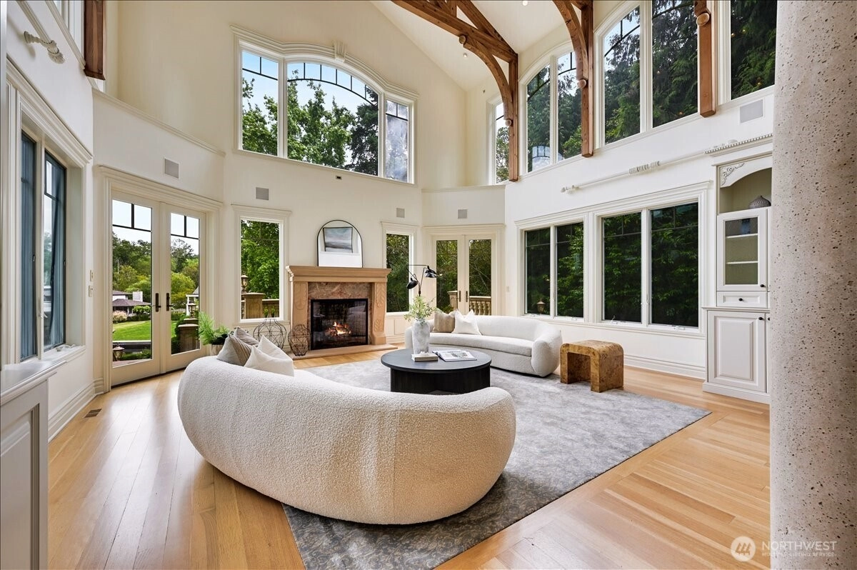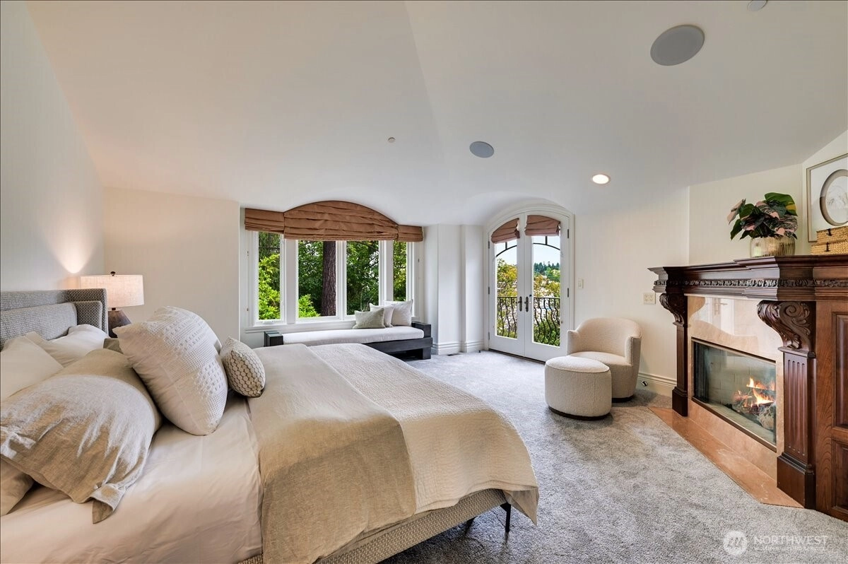 A distinctive gated estate in one of the nation’s most coveted neighborhoods. This Mediterranean-style residence features cathedral ceilings, Italian columns, and French doors opening to serene patios and a 200-ft dock with year-round moorage. Gorgeous wrought iron railings, crystal chandeliers, and a whole-house sound system add to the refined ambiance. Each bedroom is an ensuite. Downstairs offers relaxation with a wine cellar, spa, cold bar and terraces. Chef’s kitchen is outfitted with brand-name appliances. Curved design flows through the lush, landscaped grounds of this Lake Washington shore house. Mature trees, vibrant blooms, and curated shrubs welcome visits from blue herons and bald eagles. Fountain, BBQ island, firepit, dog run.