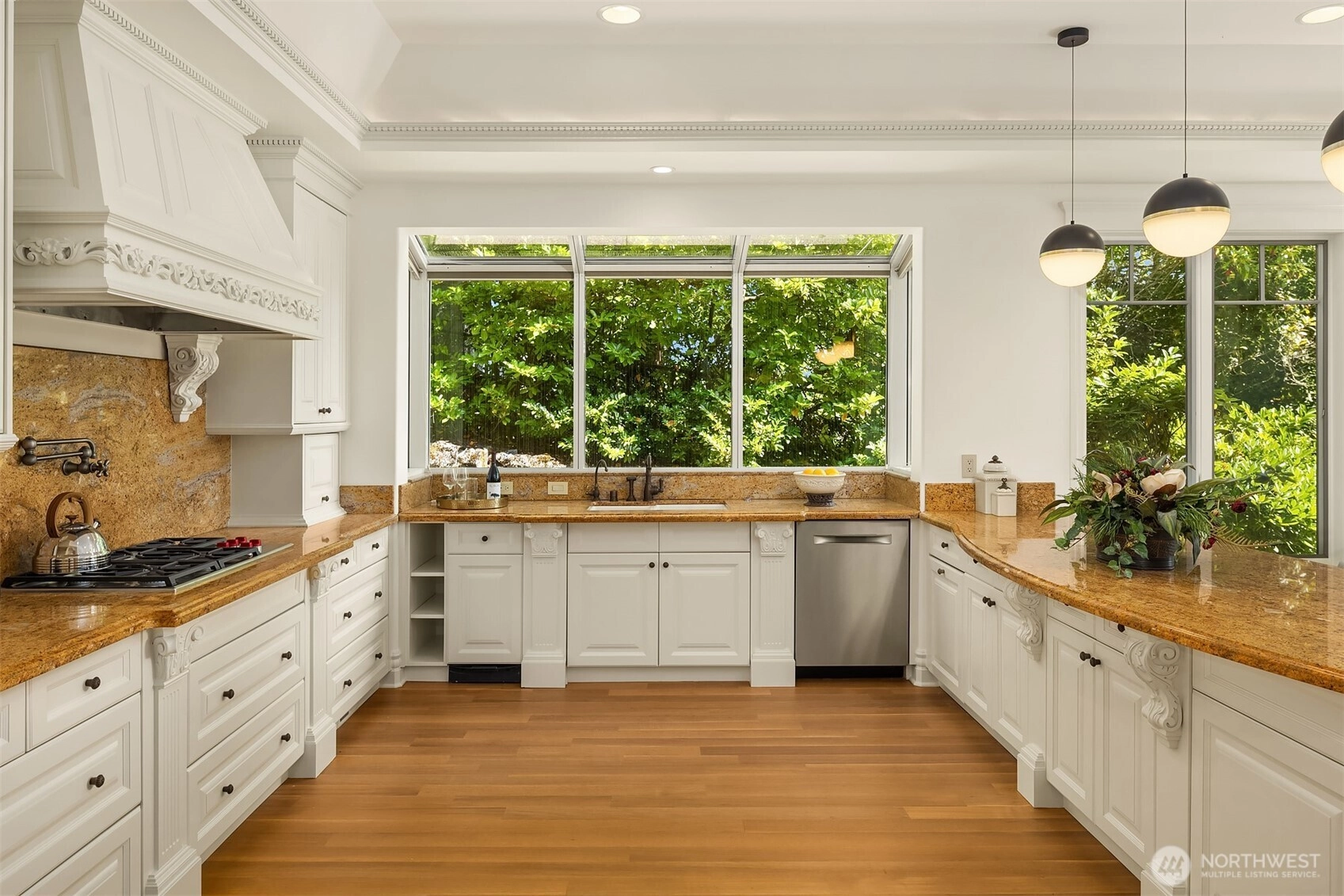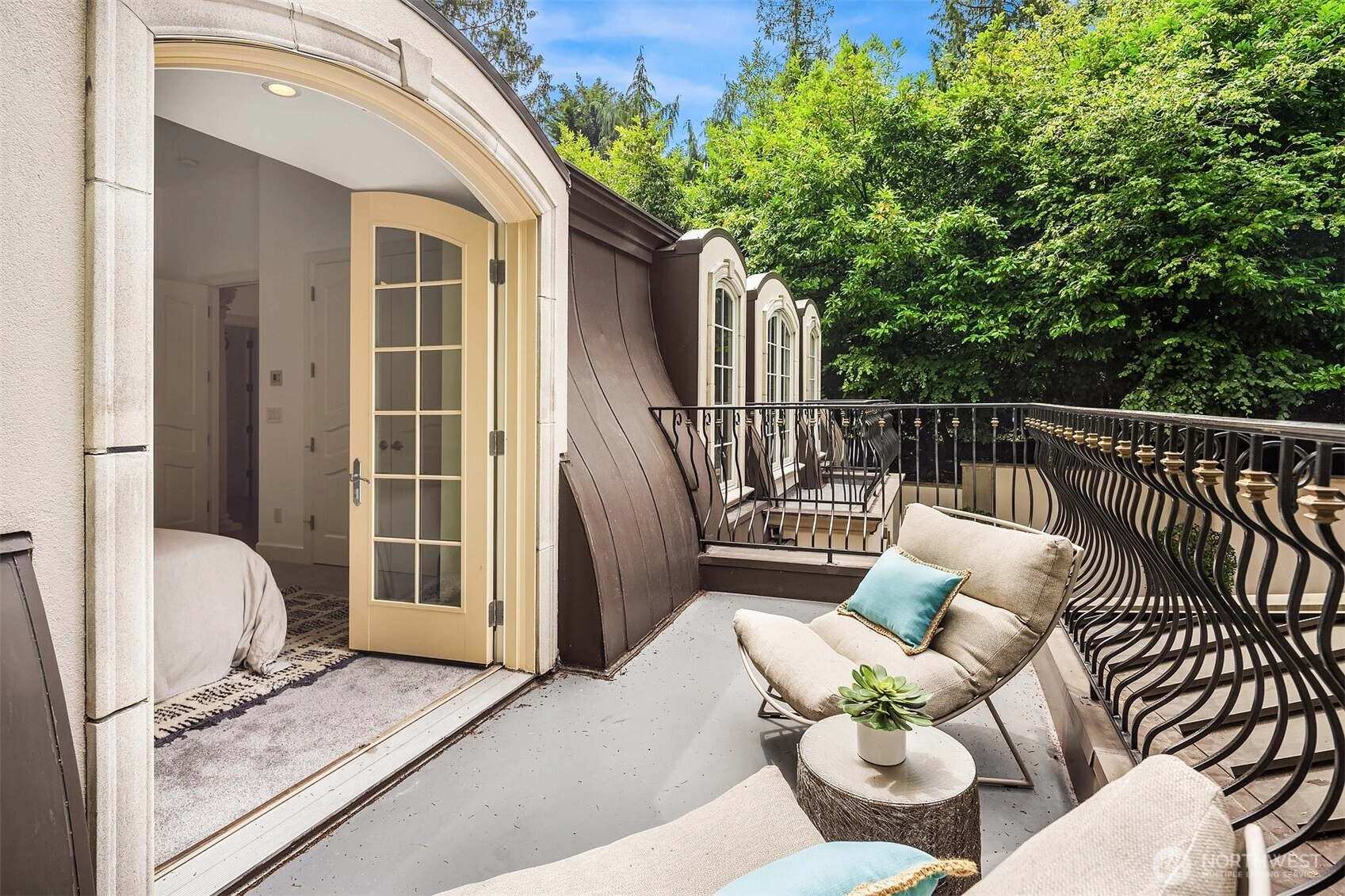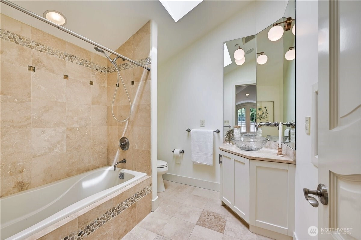 A distinctive gated estate in one of the nation’s most coveted neighborhoods. This Mediterranean-style residence features cathedral ceilings, Italian columns, and French doors opening to serene patios and a 200-ft dock with year-round moorage. Gorgeous wrought iron railings, crystal chandeliers, and a whole-house sound system add to the refined ambiance. Each bedroom is an ensuite. Downstairs offers relaxation with a wine cellar, spa, cold bar and terraces. Chef’s kitchen is outfitted with brand-name appliances. Curved design flows through the lush, landscaped grounds of this Lake Washington shore house. Mature trees, vibrant blooms, and curated shrubs welcome visits from blue herons and bald eagles. Fountain, BBQ island, firepit, dog run.