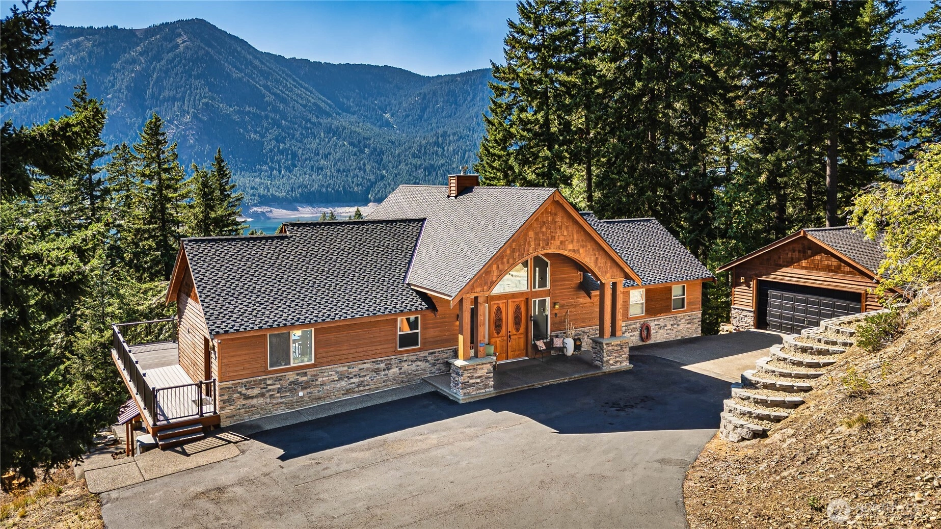 A unique gem! This custom luxury home with views of Lake Cle Elum in desirable Ridge View Estates has too many special features to list (see the attached docs/pics for more). Custom carved front doors lead into an impressive great room with soaring cathedral ceilings, custom chandeliers, a double-sided gas fireplace, and incredible views of the lake. Open floorplan with a large, beautiful kitchen & primary bedroom suite on the main floor with french doors to the wraparound deck. Downstairs has a large family/rec room, 3 bdrms., 2 full baths, & office. Views of the lake from every room! Generator & all appliances incl. Paved driveway, garage, new roof, deck, carpet & so many upgrades. Snowmobile through garage & direct access to trails.