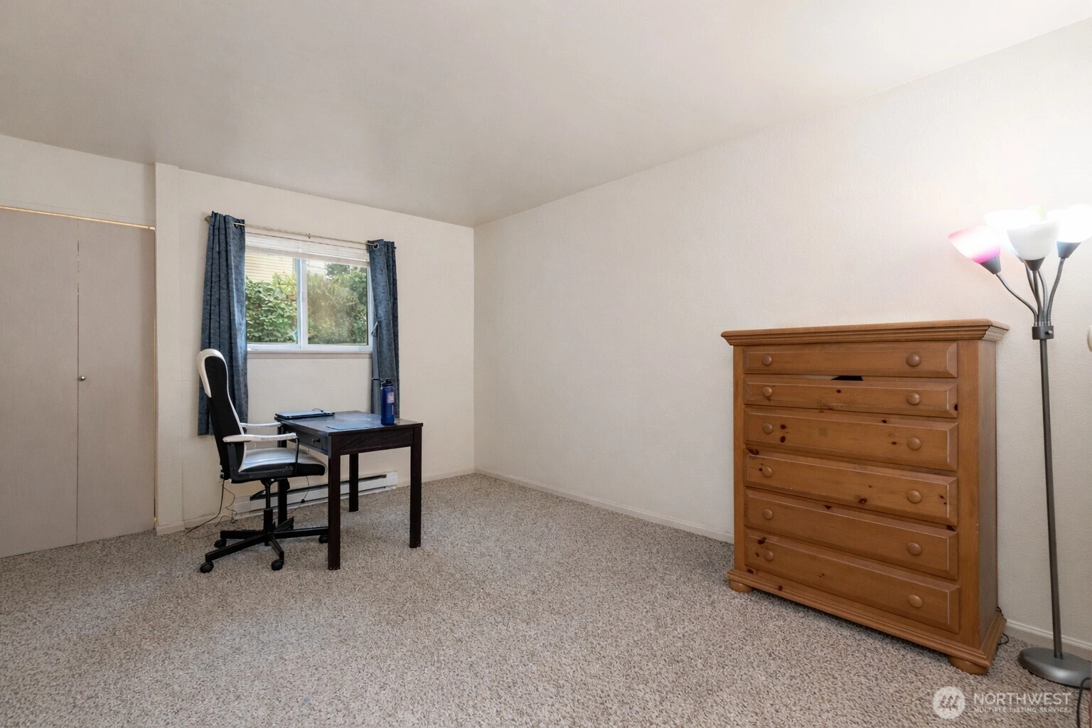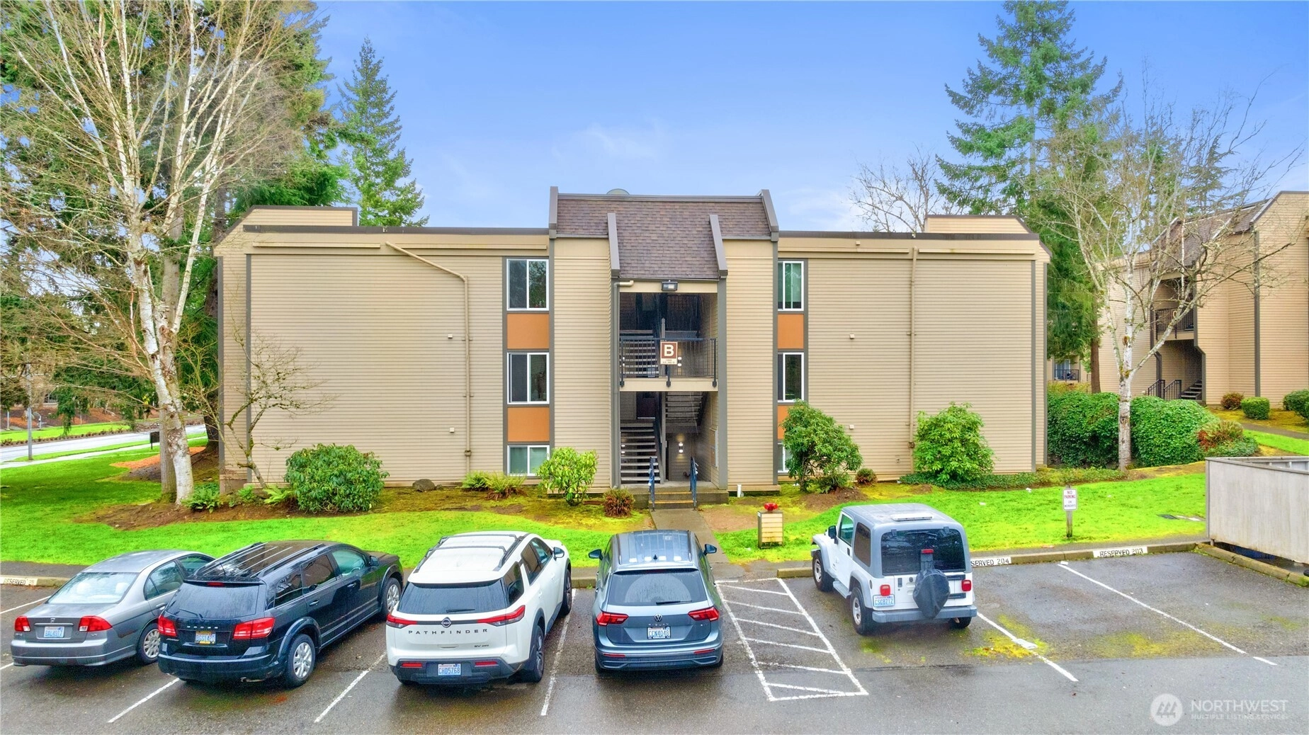 Prime location! Remodeled ground level unit 2 bedroom 1 bath. Convenient Bellevue Manor complex across the street from Microsoft. This home has abundant closet space and an open concept layout. There is a dedicated storage unit (4x6) in the hallway as well. Spacious and welcoming kitchen counter naturally extends into dining and living area. Sleek kitchen and bath finishes. Two sizable and functional rooms with carpet. Security door to building w/intercom. New exterior siding. Next door to Goldsmith Neighborhood Park for walking trails. Community offers ample guest parking, outdoor pool and sport court. Close to shopping, freeway, light rail station, bus lines, Pro Club, etc. No rental cap. Ideal for first time buyers or investors seeking strong rental potentials. Videos and pictures are virtually staged.