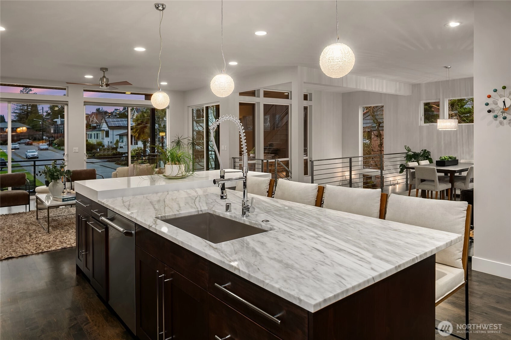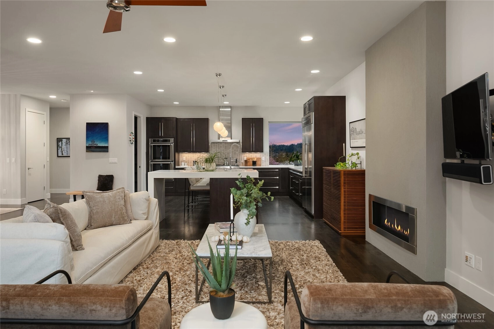 Views! Views! And, more Views! A rare opportunity to own a home with sweeping Puget Sound views. Commanding one of Sunset Hill’s most coveted settings, this residence captures panoramic vistas from Mt. Rainier to Whidbey Island, spanning Shilshole Marina, Puget Sound, and the Olympic Mountains—an unforgettable backdrop from sunrise to sunset. Built in 2013 and meticulously maintained, the home was designed to embrace light, volume, and surrounding beauty. The reverse living floor plan crowns the home with an expansive great room, soaring ceilings, and a dramatic wall of glass slider windows. A refined chef’s kitchen with professional-grade appliances anchors the entertaining level and opens to a covered deck for year-round outdoor living. Imagine quiet mornings with coffee and soft water views, and evenings on the rooftop deck as the sun melts into the horizon. Four bedrooms, four baths, an office, and a bonus room offer flexibility for modern living. The serene primary suite features a beautifully appointed en suite and access to a private backyard. The lower level offers guest quarters, a spacious rec room, and bonus room, with the guest suite and rec room opening to a secluded patio and backyard + garden. A masterclass in understated elegance and Northwest luxury, this home pairs intentional design with one of Seattle’s most extraordinary views and natural backdrops.