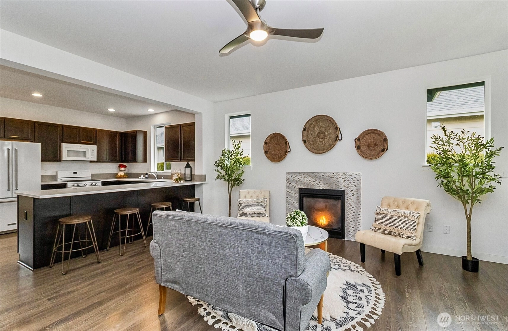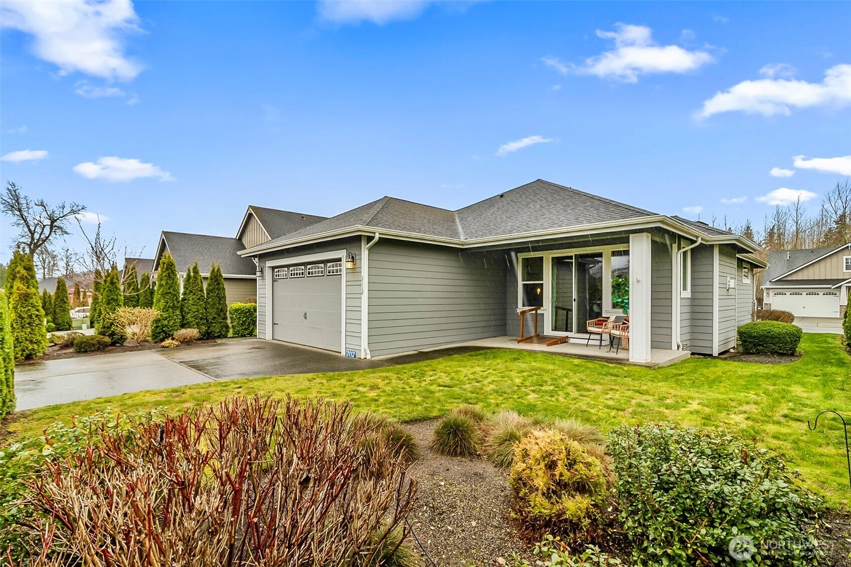 Discover effortless single-level living in the highly sought-after Highland Greens Community! Built in 2016, this beautifully designed 1,717 sq. ft. Rambler offers 3 bedrooms & 2 baths in a bright, open-concept layout that’s both spacious and inviting. Thoughtfully designed w/ wheelchair-accessible back entry & convenient front & alley access, this home combines comfort & functionality. Luxury vinyl plank flooring flows throughout the main living areas, highlighted by a cozy gas fireplace that anchors the expansive great room. The kitchen is a true centerpiece, featuring abundant counter space, seamless flow into the great room, & a separate dining area—perfect for entertaining or everyday living. The private primary suite is a relaxing retreat with a generous walk-in closet & an en-suite bath. Large windows fill the home w/ natural light, enhancing the open feel & showcasing the lovely landscaping outside. Step onto the covered patio & take in peaceful mountain views—an ideal spot for morning coffee or evening relaxation. Located in a quiet, private neighborhood w/ clubhouse amenities, small park, walking trails. This move-in ready home is just minutes from restaurants, schools, & shopping, offering the perfect blend of tranquility & convenience. Low-maintenance, beautifully maintained, & thoughtfully laid out—this Highland Greens gem is ready to welcome you home!