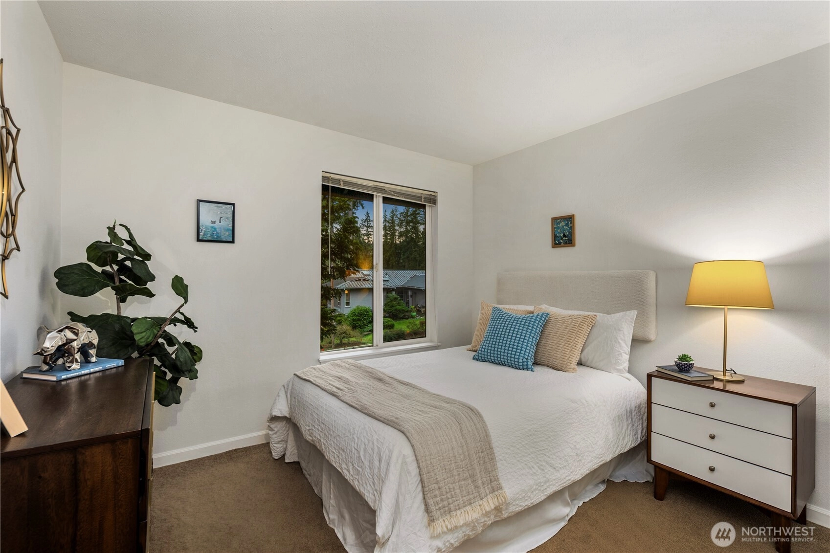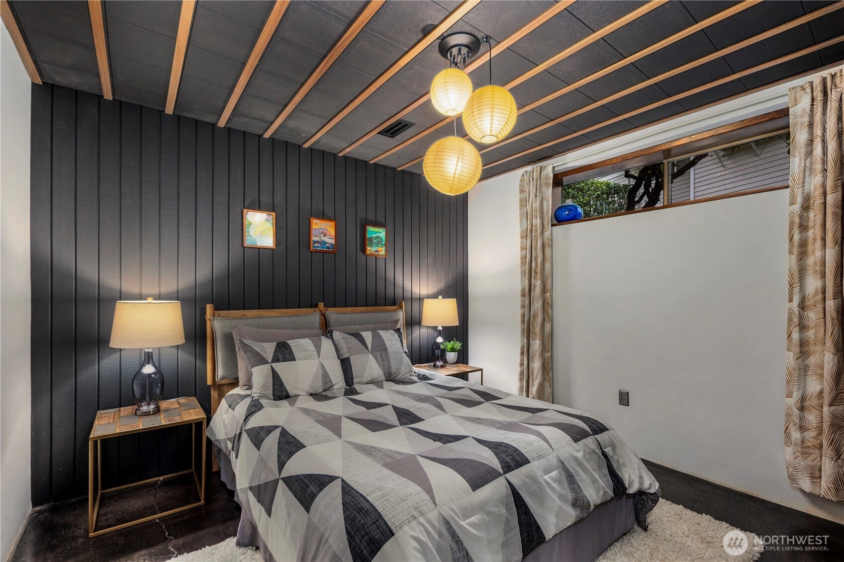 Beautifully updated NW Contemporary nestled in Crestwood Park, this thoughtfully upgraded 4 bedroom, 2.5 bath home blends warm architectural character w modern upgrades. A stunning vaulted cedar ceiling anchors the main living space while expansive windows & hardwood floors create a bright, inviting interior. The remodeled kitchen pairs style & function w quartz countertops, refined cabinetry, updated lighting, stainless steel appliances & a pull-out pantry offering ample storage. It opens to an expansive, custom rebuilt deck w pergola & lighting. Outdoor spaces have been reimagined w upgraded hardscaping & fire pit, creating a private setting for relaxing, gathering or play. Spacious primary suite offers a peaceful retreat complemented by a beautifully remodeled bath w dual vanities, contemporary brass fixtures & sleek glass shower. Two additional bedrooms upstairs & a stunning remodeled guest bath provide comfortable accommodations for residents or guests. Lower level offers flexibility w a potential 4th bedroom & office or guest room, plus an expansive entertainment space featuring polished concrete floors, custom slat-wood accents, a fireplace & fantastic home theater setup including a 125” screen, projector, surround sound wiring & blackout blinds. Dual heating & cooling systems keep you comfortable year round: a new efficient heat pump (heat & A/C) + a new backup furnace. Wonderful neighborhood w nearby walking & biking trails. Top rated Bellevue schools.