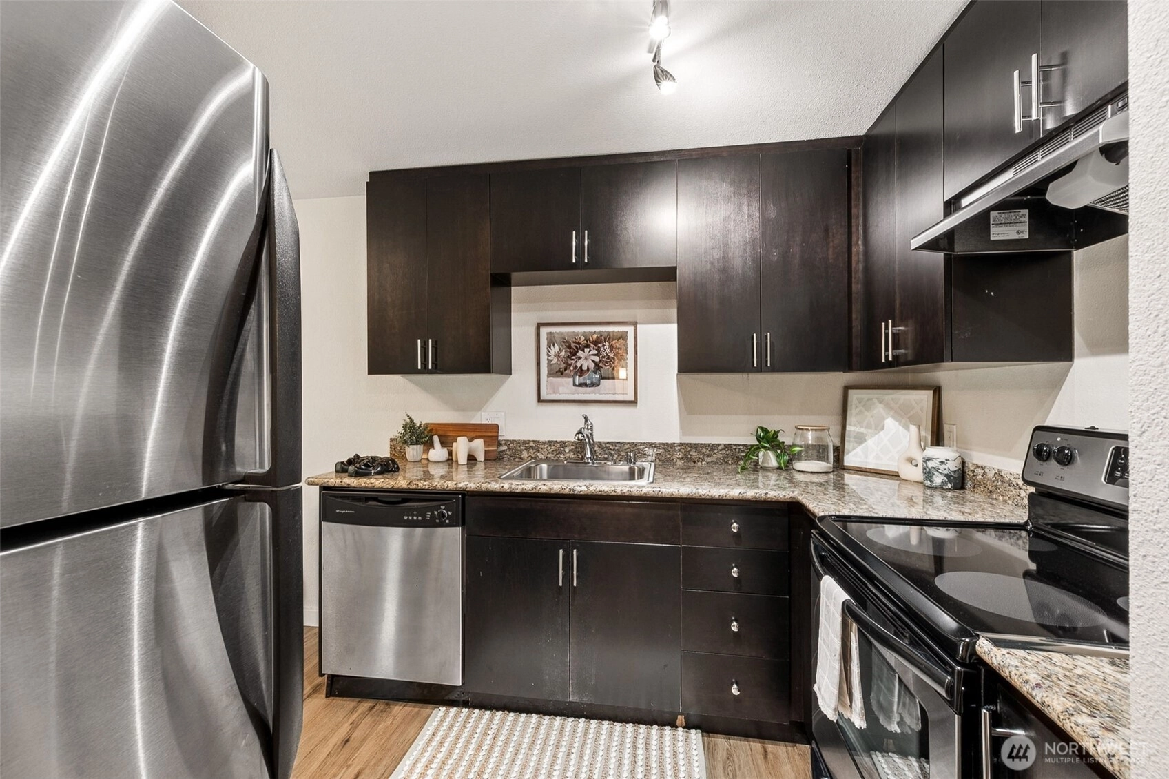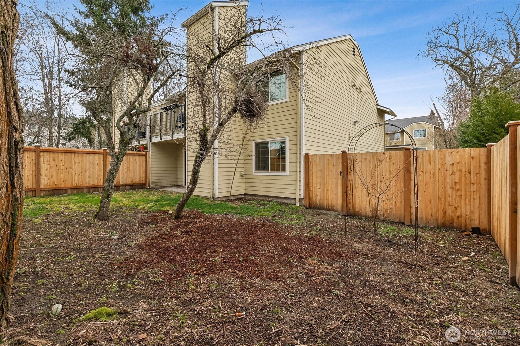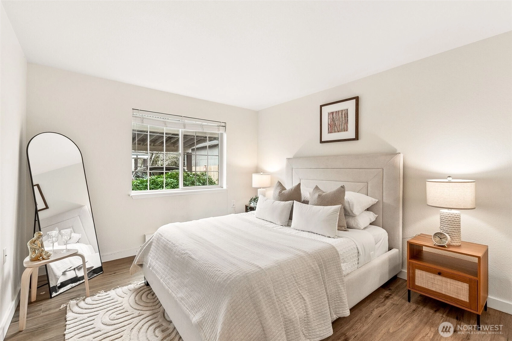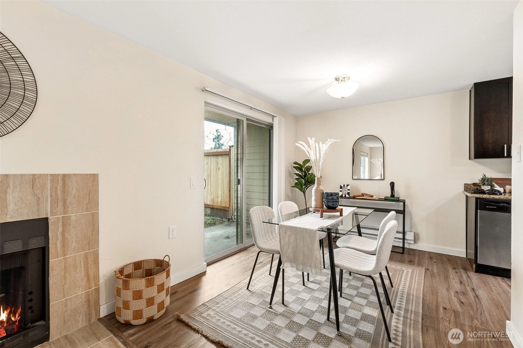 Charming ground-floor end-unit 2-bedroom, 1-bath condo offering single-level living with an open-concept design. Light-filled living room features a cozy wood-burning fireplace, a large window, and sliding door access to a private patio that leads to an ample, fully fenced private backyard area—a rare outdoor space for a condo. The spacious layout includes a large dining area adjacent to the kitchen that features granite counters, dark cabinetry, and stainless steel appliances. The primary bedroom offers generous closet space; the second bedroom is ideal for guests or can be made into the perfect home office. Neutral paint tones, brand new luxury vinyl plank flooring throughout, and abundant natural light. Designated carport parking included to make parking a breeze. Convenient access to bus lines to downtown Seattle, mere blocks away from all your Westwood Village shopping, and all the nearby restaurants. Low-maintenance grounds and easy outdoor access make this perfect for relaxed living.