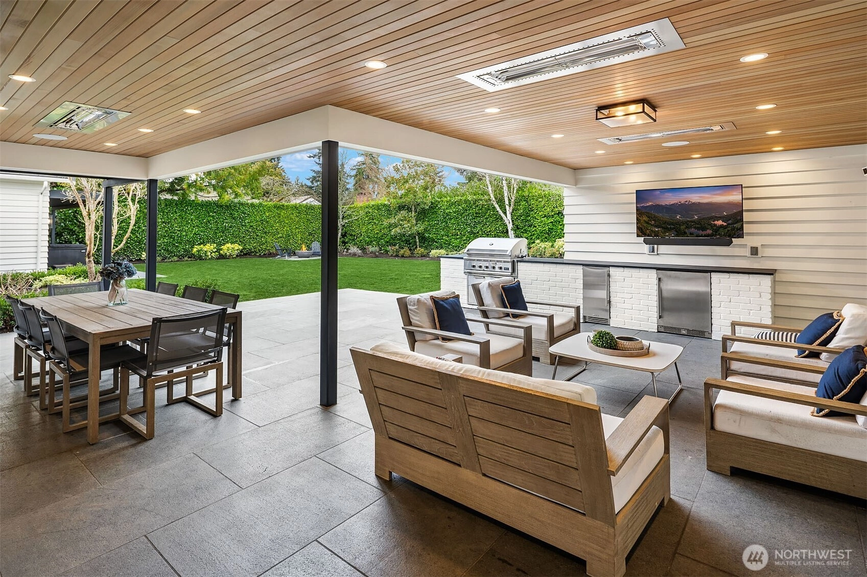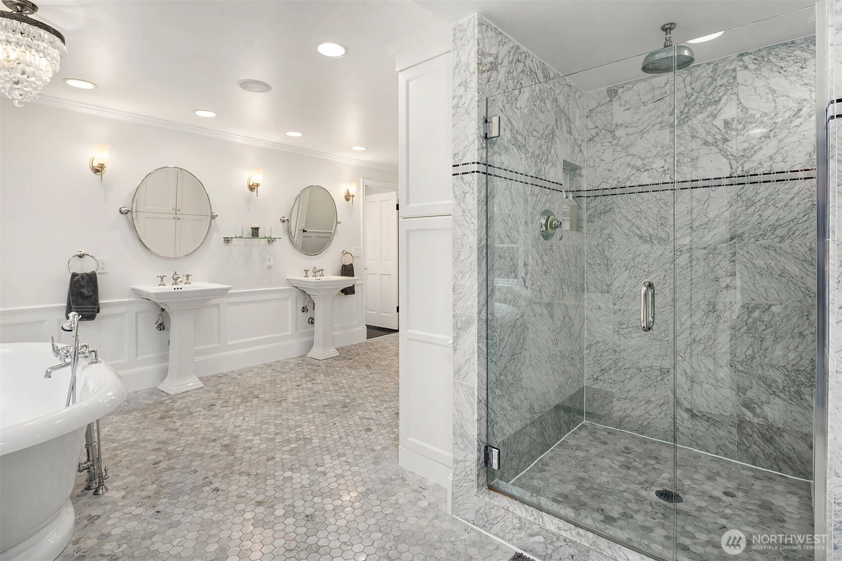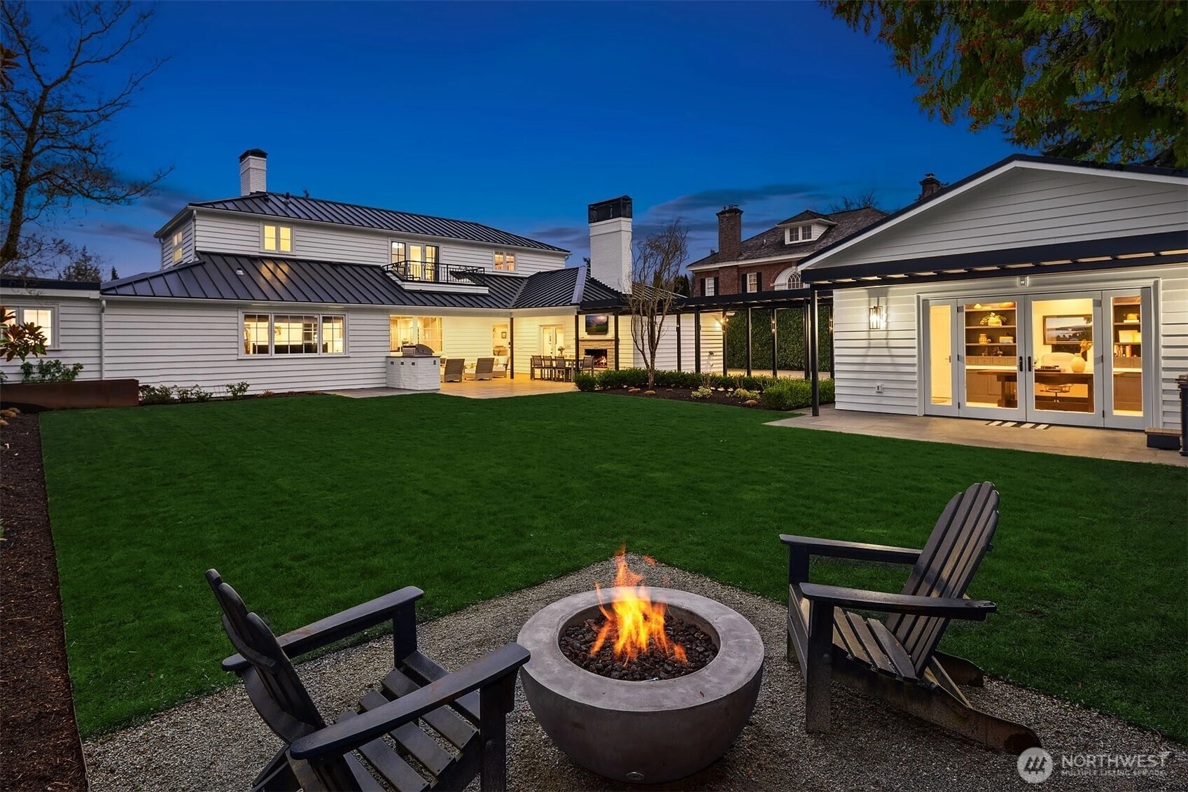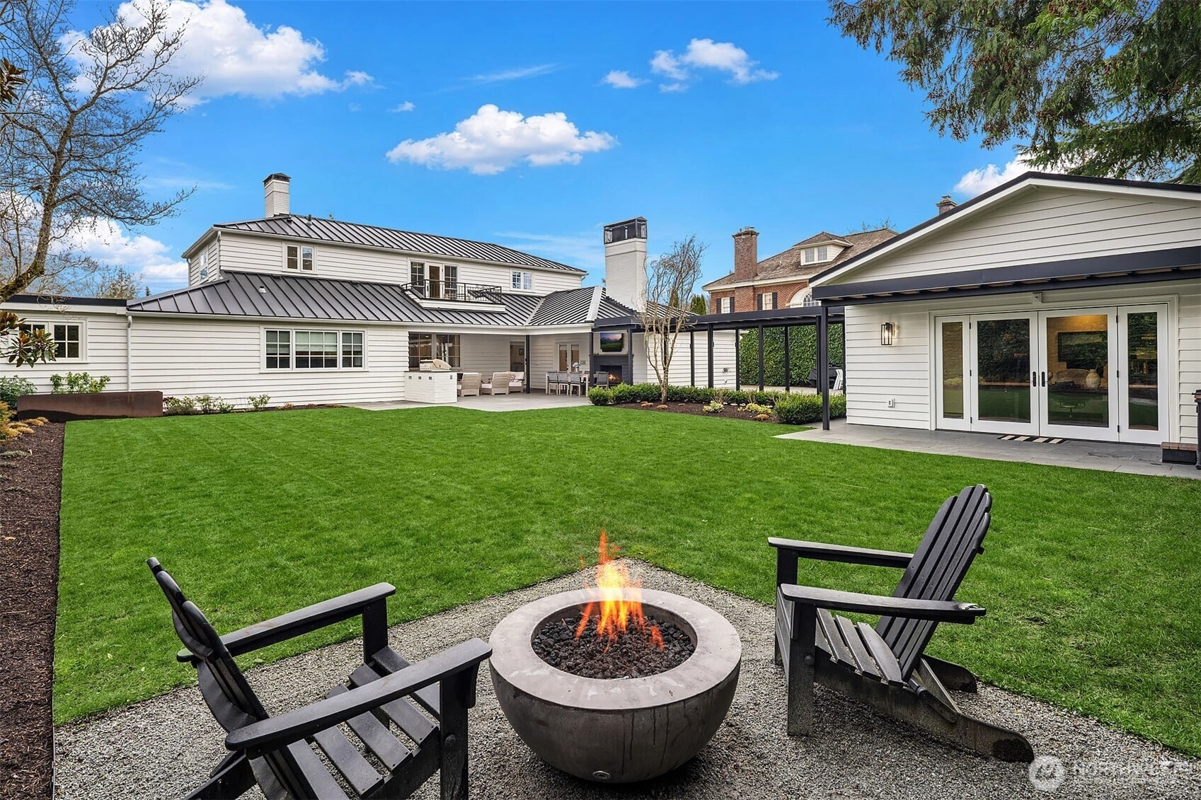 A rare opportunity in the coveted Broadmoor community. This 1940 residence by noted architect William Bain has undergone a masterful transformation, blending timeless architecture with today’s finest upgrades and Pasadena-style indoor-outdoor flow. Behind a private gated entry framed by lush new landscaping, the home offers true one-level living across an expansive main floor. East-facing, light-filled living and dining spaces flow seamlessly over oak hardwood floors to a professional-grade kitchen with Wolf range, Sub-Zero refrigerator, marble island, wine fridge, and walk-in pantry. Two main-level bedrooms include a serene primary suite with walk-in closet and elegant bath. Upstairs, a library landing wrapped in built-in bookshelves leads to two additional bedrooms connected by a Jack-and-Jill bath, one with a private balcony. The finished lower level offers a media room, wine room, laundry, and new bathroom. The main-level flows outside through a covered terrace with cedar ceiling, heaters, A/V, DCS barbecue and outdoor kitchen overlooking the expansive lawn and fire pit. The adjacent 3-car garage and flex space, integrated via breezeway, provide a home office or guest suite with French doors to the lawn. Exhaustive infrastructure upgrades—new roof, siding, electrical, A/C, plumbing and sewer—ensure complete peace of mind and long-term value in this meticulously re-imagined Broadmoor estate.