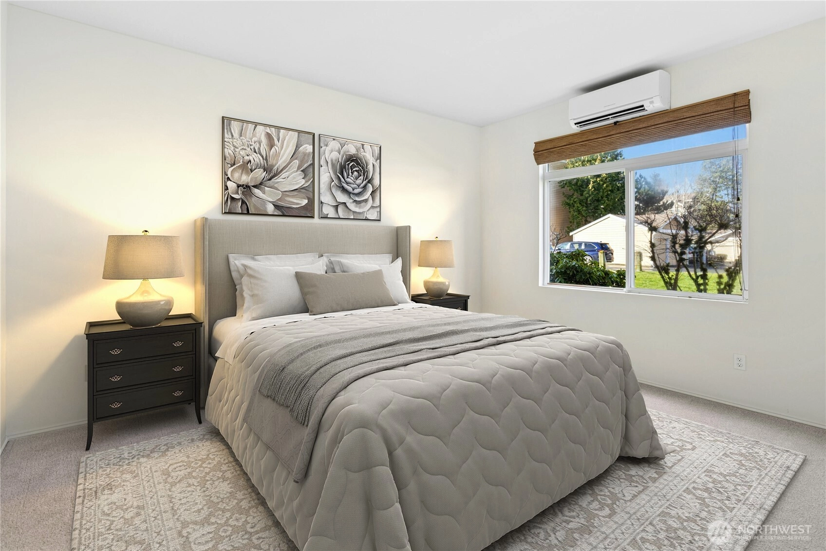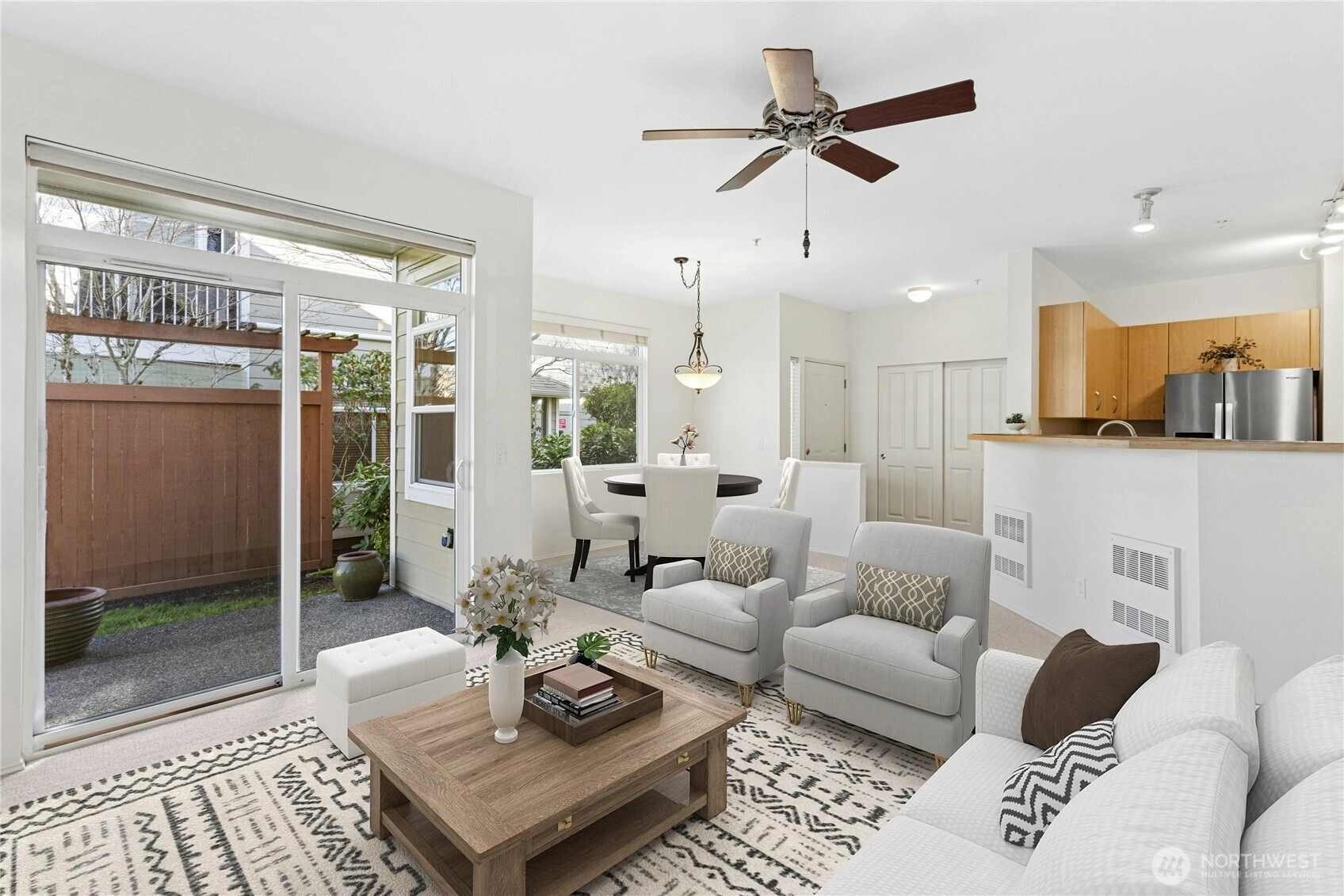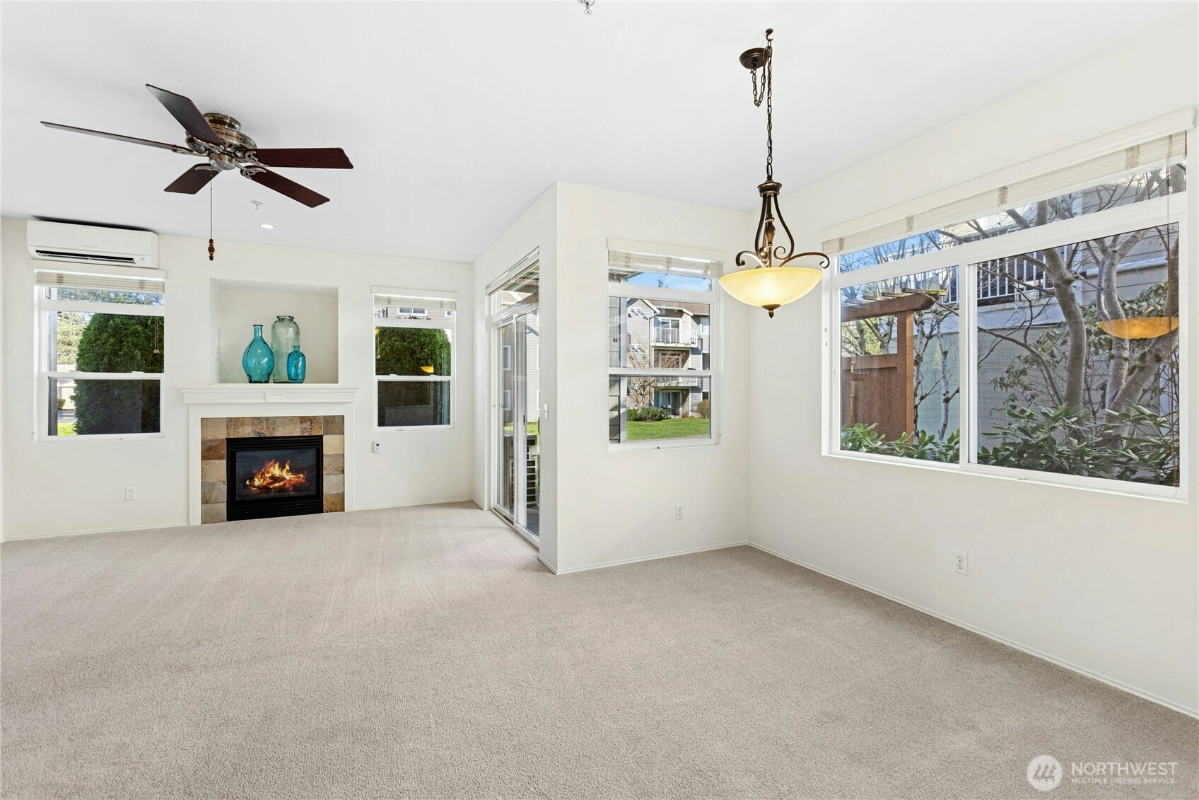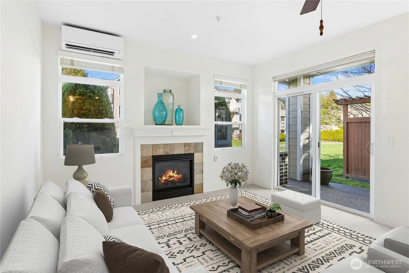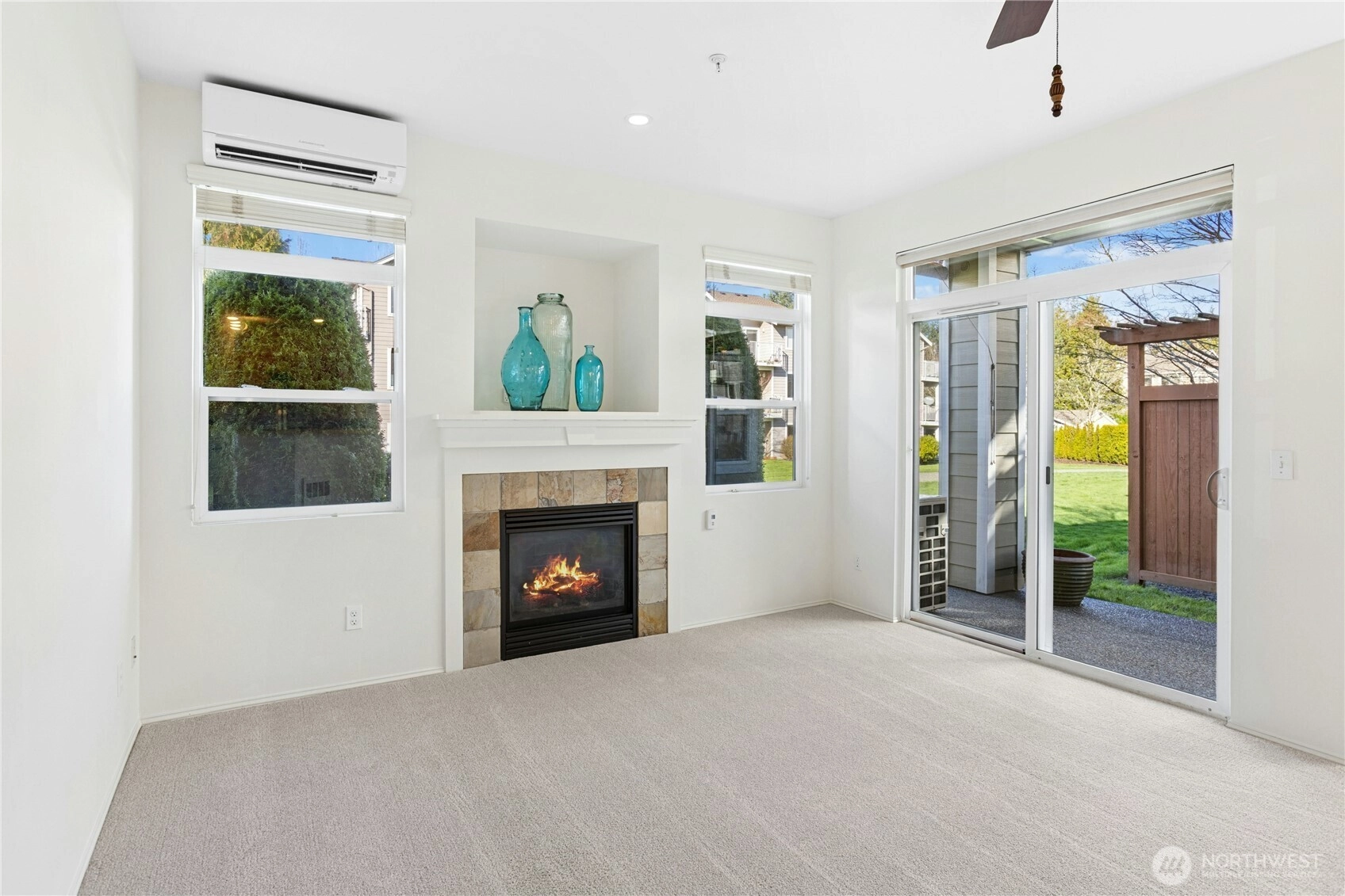 Fresh, bright, and move-in ready ground-level condo in the desirable Cameray community. Fully repainted with brand new carpeting in 2023, this home feels clean, updated, and welcoming from the moment you step inside. The spacious living and dining area features a cozy gas fireplace, ceiling fan, and large sliding glass door that opens to the rear patio. The patio walks directly onto the well-maintained grassy common area, offering an open, park-like setting. Mature landscaping creates a comfortable sense of separation from neighboring buildings. The kitchen includes stainless steel appliances, generous counter space, a pantry, updated lighting, and durable vinyl plank flooring. The primary bedroom offers a large walk-in closet. The home features 2-inch wood blinds in every room, with additional blackout shades in both bedrooms for enhanced comfort and light control. For year-round comfort, there are two ductless heating and air conditioning mini-split units, one in the living area and one in the primary bedroom. A full-sized washer and dryer are conveniently located in the utility room. Additional highlights include a large garage with extra storage space and a second reserved parking spot in the driveway. Residents enjoy access to the community clubhouse, swimming pool, spa, and fitness room. HOA dues include water, sewer, and garbage. Conveniently located near award winning schools, parks, trails, beaches, shopping, public transportation and commuting lanes.