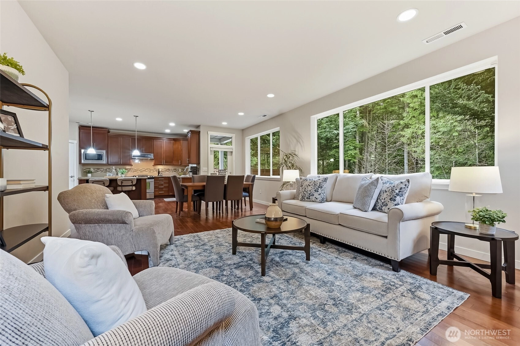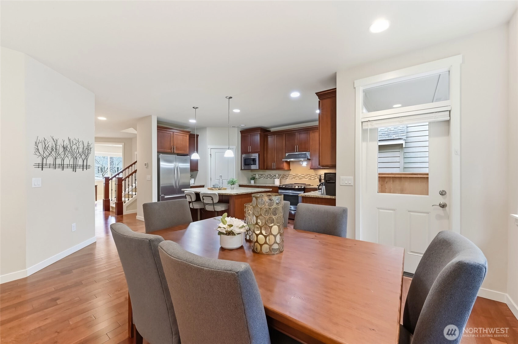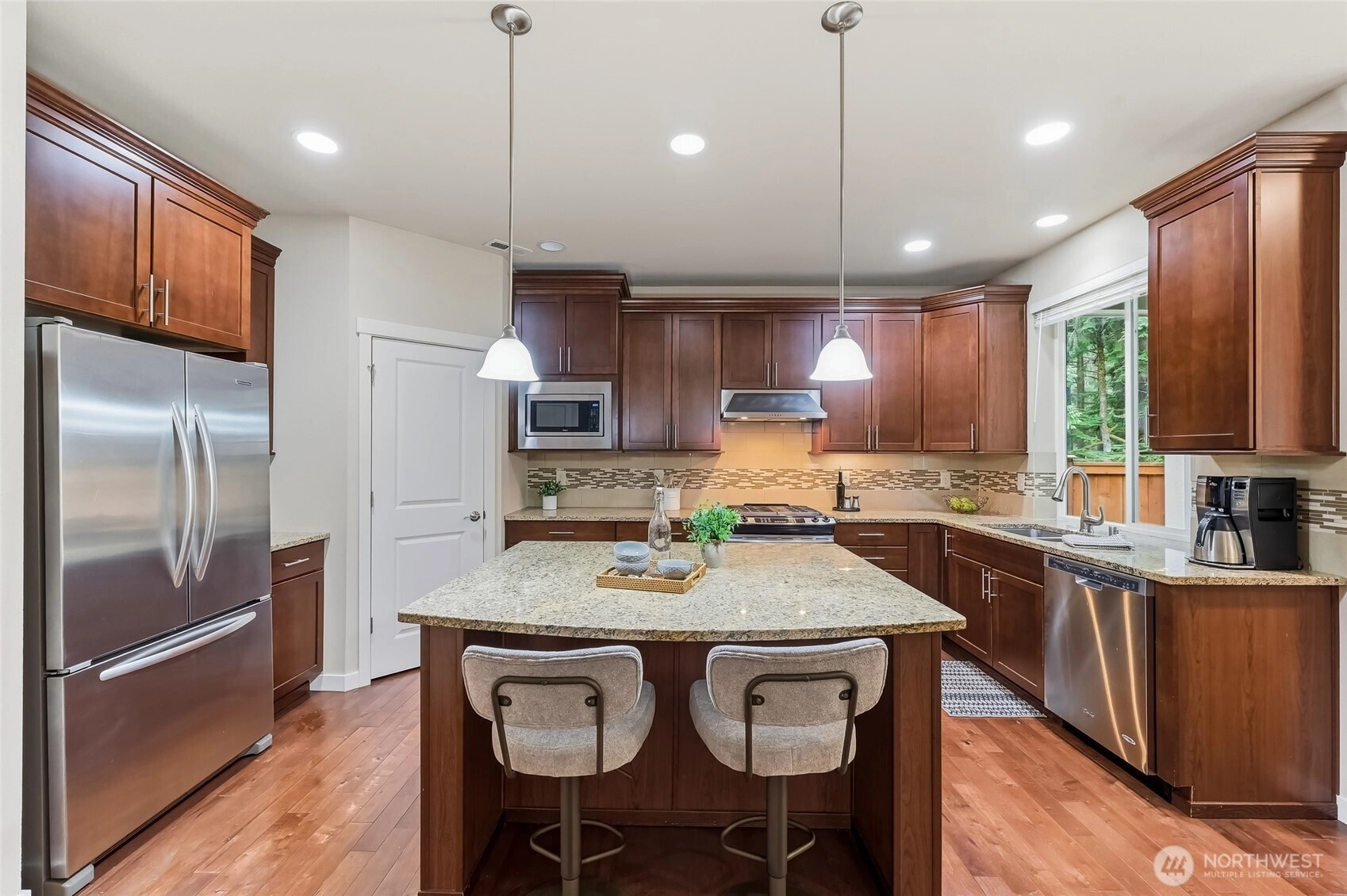 Nestled into a quiet, private setting within the highly regarded Redmond Ridge, this stunning 4-bedroom, 2.5-bath home offers a peaceful retreat in one of the Eastside's most sought-after master-planned communities. Thoughtfully designed streetscapes, mature landscaping, and nearby parks create an inviting neighborhood feel — while this particular homesite feels especially secluded and serene as it backs to a greenbelt. Inside, a spacious, light-filled floor plan and stylish finishes make this home truly move-in ready. The elegant kitchen features slab countertops, appealing cabinetry, stainless steel appliances, and a walk-in pantry — all opening to comfortable living and dining areas primed for everyday living and entertaining. Heading upstairs past the wrought-iron banisters awaits generous bedrooms, a bonus room, and a luxurious 5-piece primary bath. A handy upstairs laundry room limits your trips up and down stairs and keeps your "steps" on the beautiful surrounding trails. "Step" outside and enjoy easy access to Bristol Park, neighborhood trails, QFC, tennis courts, sports fields, and Microsoft commuter bus stops — plus convenient connections to Redmond, Bellevue, Kirkland, and major Eastside employers. Prestigious Lake Washington School District serves this address. Private, peaceful, and remarkably rare.