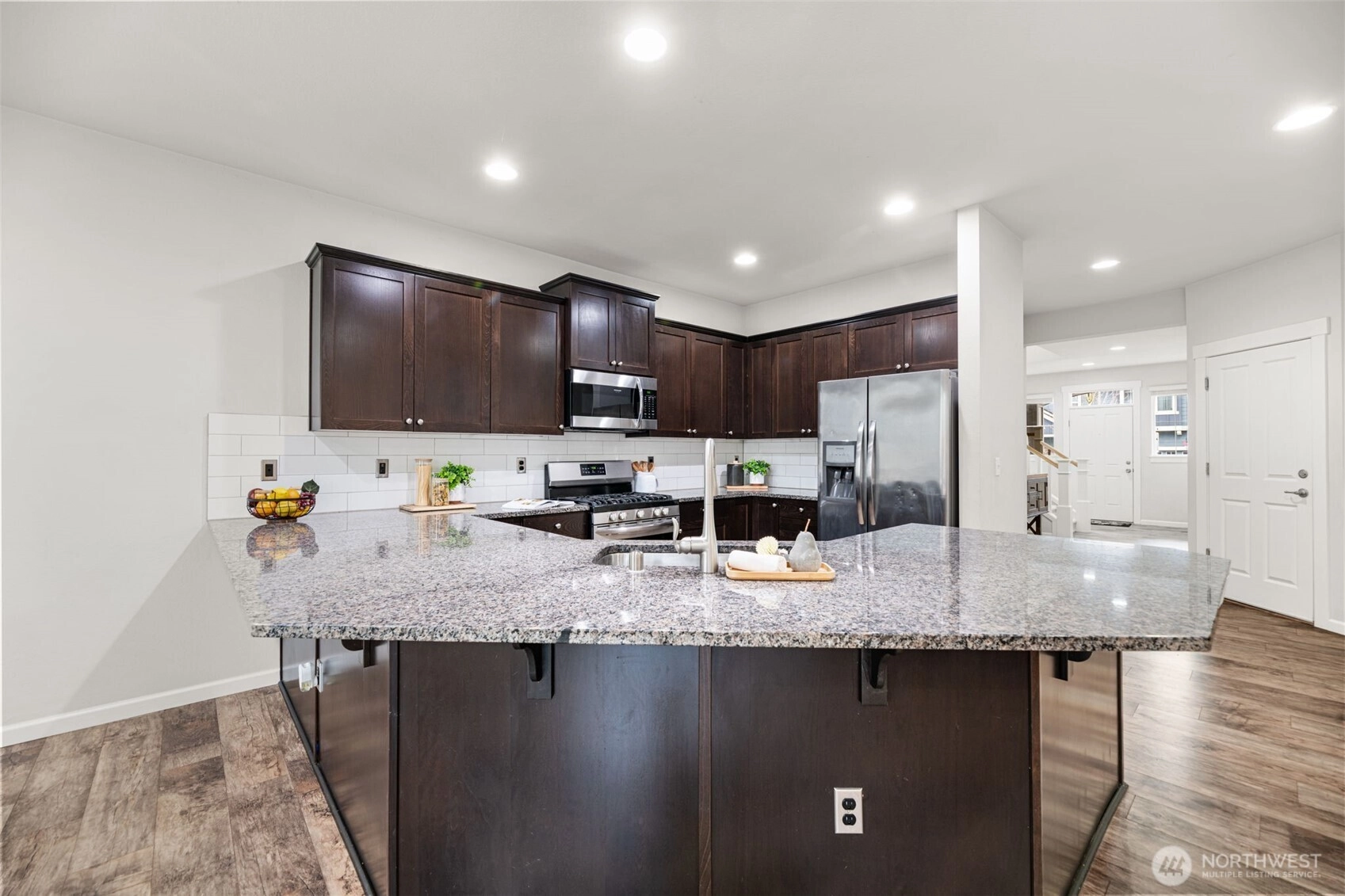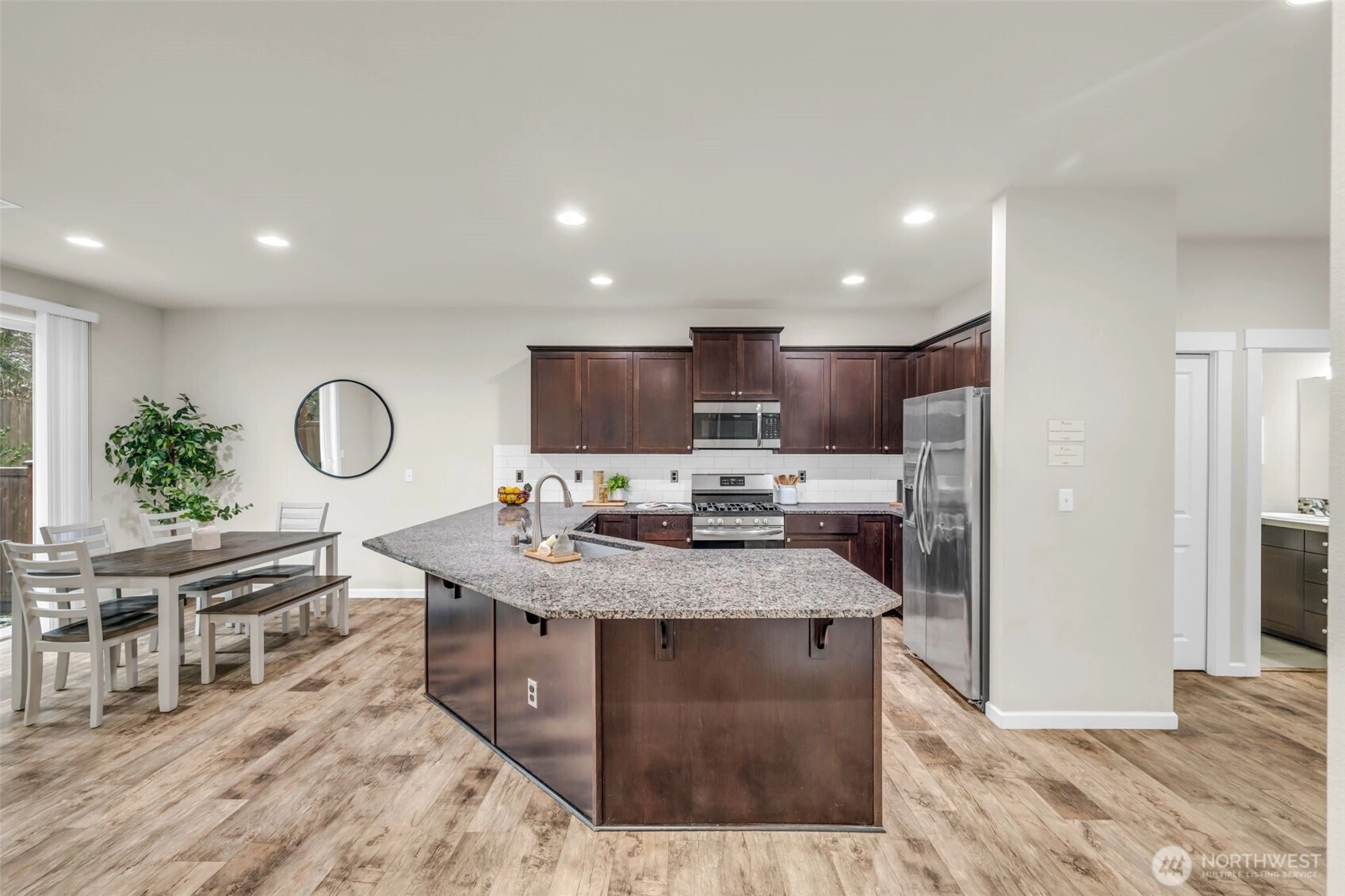 Welcome to this stunning 5-bedroom, 2.75 bath home in the highly sought after Maple Rock community of Lake Stevens! Designed for modern living, this spacious home features an open concept floor plan filled with natural light and stylish finishes throughout. The chef’s kitchen is the heart of the home, boasting expansive counter space with bar seating, stainless steel appliances, and abundant cabinetry, perfect for entertaining. The inviting living room features a cozy gas fireplace and flows seamlessly into the dining area with easy access to the back patio, ideal for indoor-outdoor living. A convenient main level bedroom and bath provide excellent flexibility for guests, multi-generational living, or a home office. Upstairs, retreat to the primary suite complete with two walk-in closets and a spa-inspired bath. Three additional bedrooms, utility room, and a spacious bonus room offer endless possibilities for media, play, or work from home space. Ideally located near parks, shopping, dining, and top-rated Lake Stevens schools, this home truly has it all.