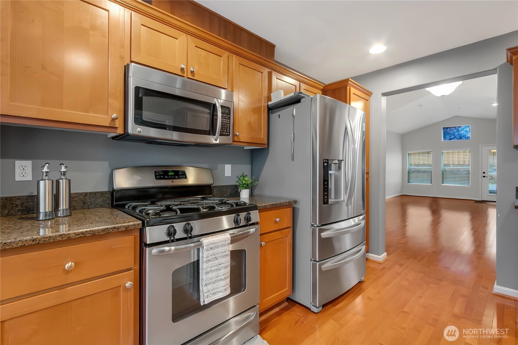Welcome Home to this 3-bedroom, 2.5-bathroom condominium in the sought after gated community of Madera in Lakeland Hills. This end unit condo has tons of privacy. The main floor has a large, well-lit living space with a cozy gas fireplace and hardwood floors with a door that opens to the back patio with plenty of room for outdoor entertaining and a raised garden area. The kitchen has stainless steel appliances, granite counters and a cozy eating nook with windows on all sides. Main level primary suite with 5-piece bathroom and large walk-in closet. Upstairs is a great flex space with many possibilities! 2 additional bedrooms with an additional full bath. 2 car attached garage with storage area. Close to shops, restaurants and walking trails. Just minutes from Lake Tapps. HOA dues cover exterior maintenance, roof, siding, lawn care, water and sewer.