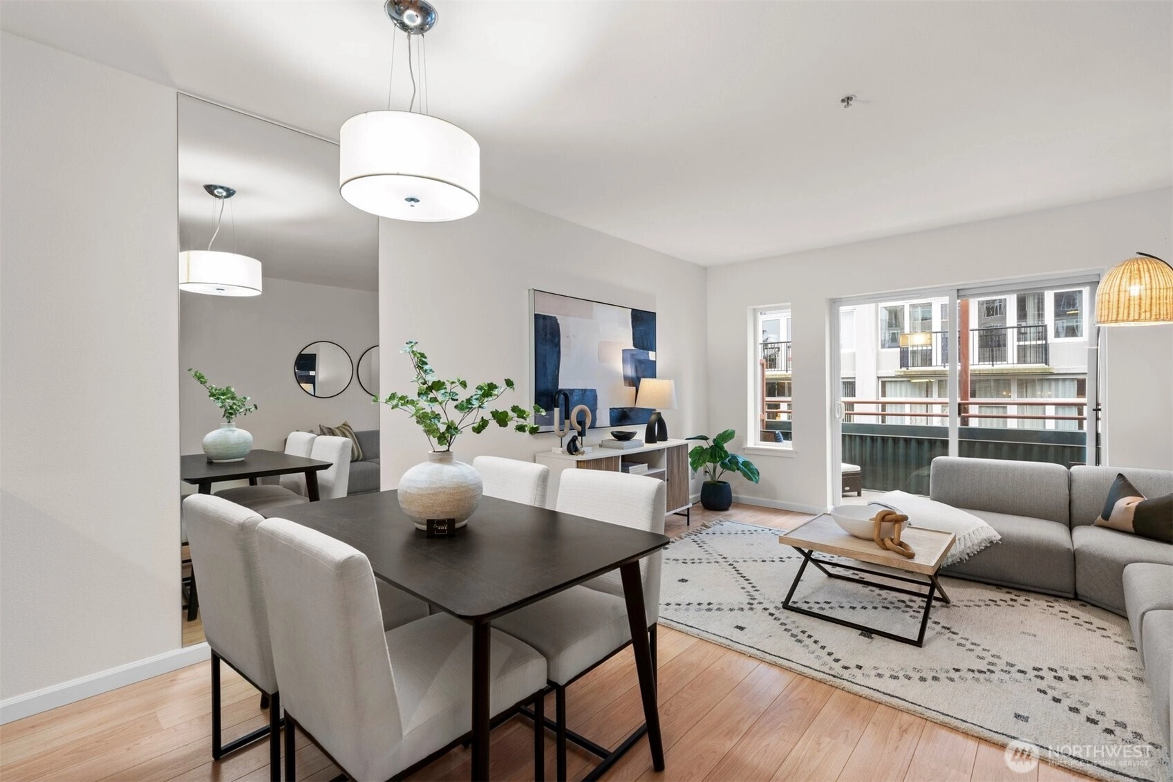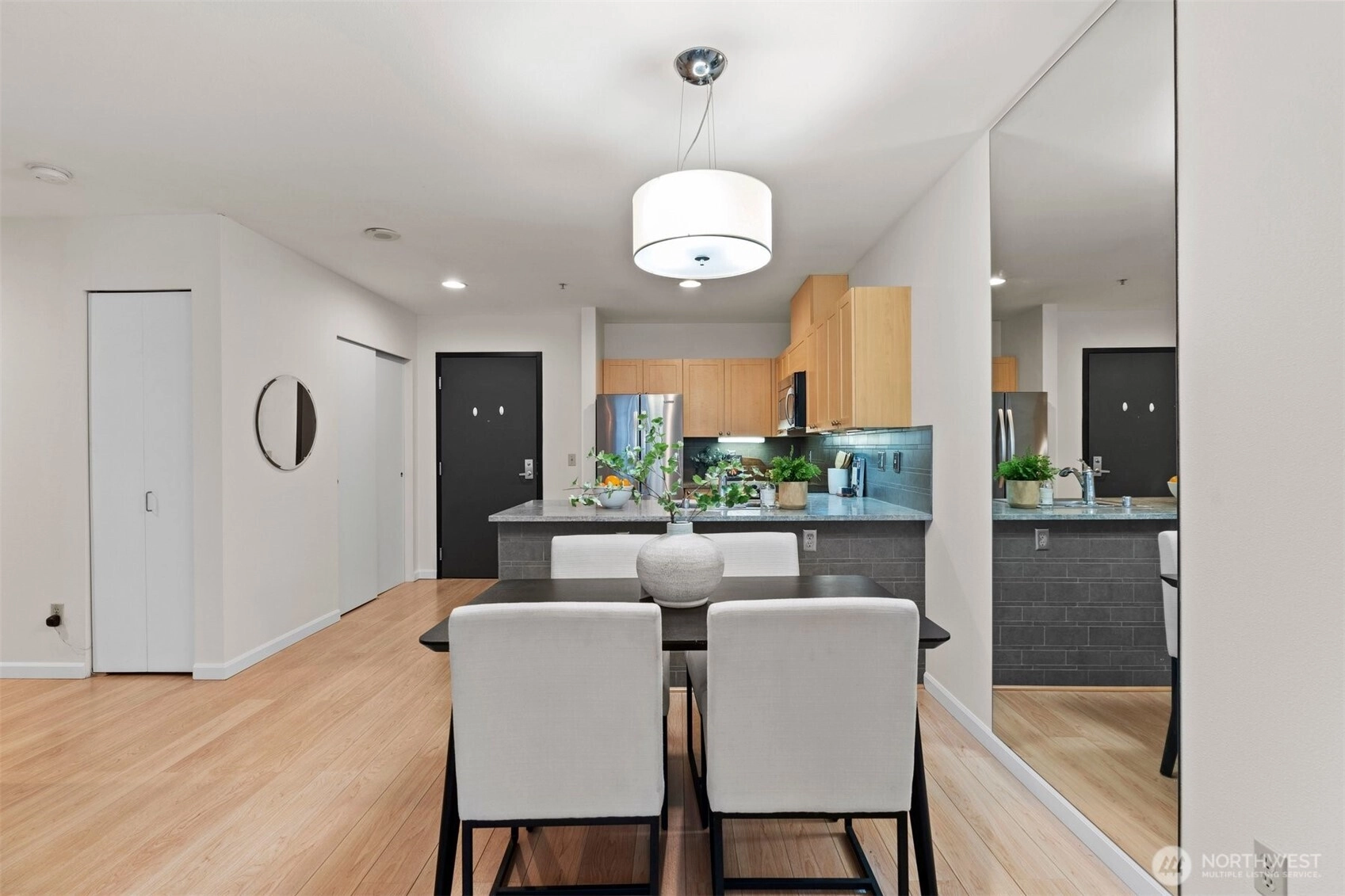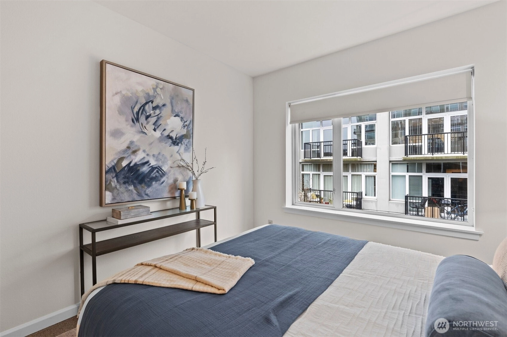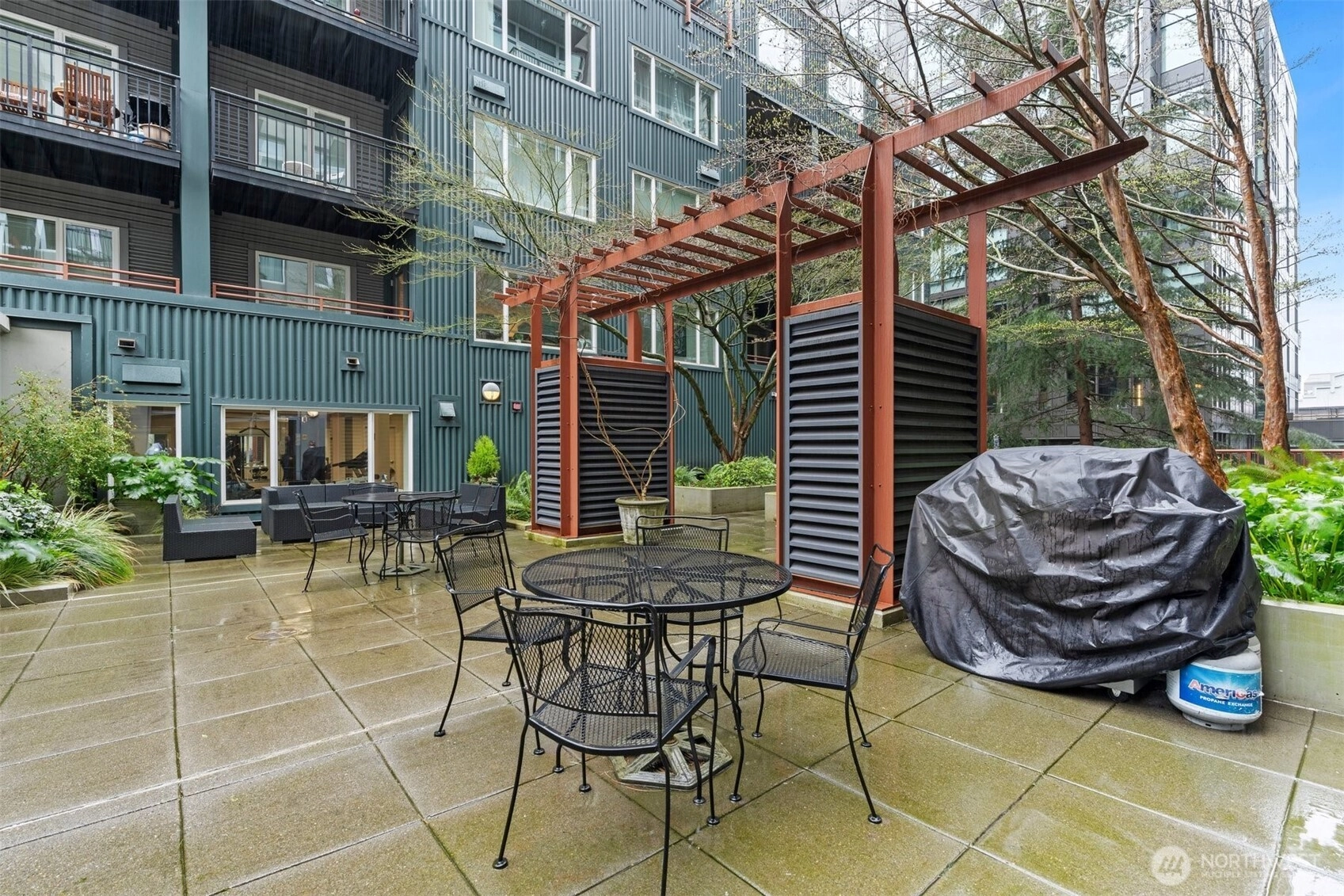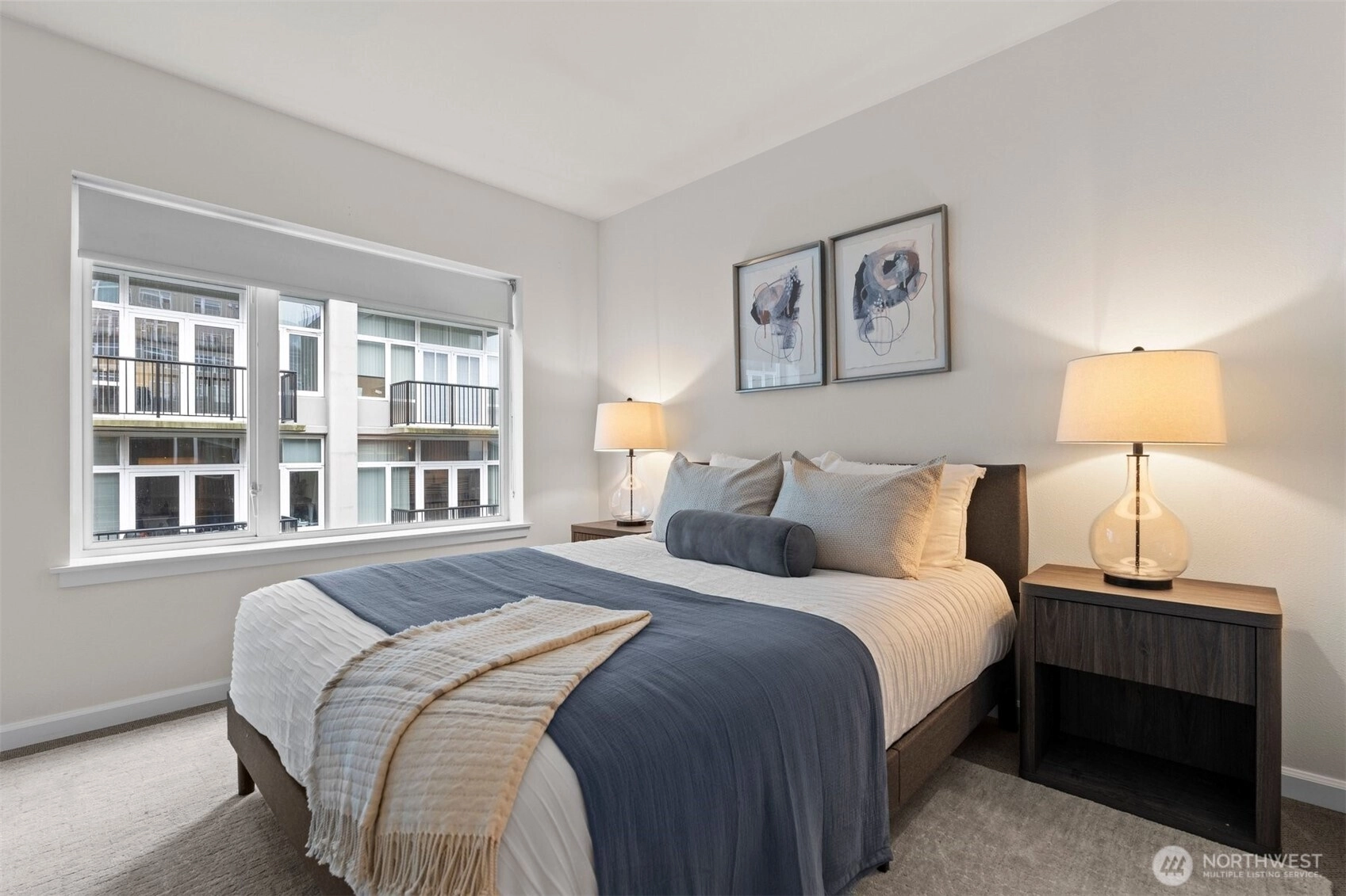 Top-floor spacious one-bedroom with a private balcony set back from the street, overlooking peaceful green space. The sun-filled living area features large windows, a slider to the balcony, and freshly painted interior—creating a bright, open feel. The updated kitchen offers quartz counters, stainless appliances, and an extra-large peninsula perfect for additional prep space or hosting friends.Additional highlights include a clever custom cloffice for Zoom calls or working from home, stackable washer/dryer, and a full bath with modern finishes. Includes covered, secured parking with EV station and your storage unit conveniently located across from your front door. Pet-friendly building with concierge, gym, guest suite, and a strong HOA with no rental cap. This quieter pocket of Belltown feels comfortably residential where you can get to know your neighbors and is an easy walk to the Waterfront, Sculpture Park, Pike Place Market, and the Elliott Bay Trail. The 95 Walk Score makes for the ultimate urban lifestyle.