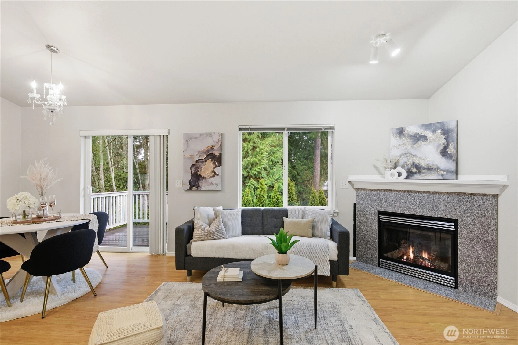 Welcome to the peaceful comfort of this home in a privately gated community of just 18 homes. Situated on a corner lot, the flexible layout offers 2 bedrooms, 1 bath, kitchenette, and bonus space on the main level—ideal for MIL living, guests, or house-hack potential. Upstairs features bright, vaulted living spaces with a spacious kitchen and eating area, open living and dining areas, and a cozy family room with gas fireplace—perfect for everyday living and entertaining. Step onto the private balcony with composite decking to relax and unwind. This level also includes an additional bedroom and a primary suite with a walk-in closet featuring a built-in closet system and a bathroom with new LVP flooring. Recent updates include NEW carpet, NEW furnace with 10-year warranty, 2022 roof with 20-year warranty, and 2020 water heater. Extra finished room off the 2-car garage adds flexibility. HOA covers gate and landscaping. Conveniently located near parks, trails, beaches, Boeing, Paine Field Airport, and easy access to Hwy 99, I-5, and 405. Located in the award-winning Mukilteo School District.