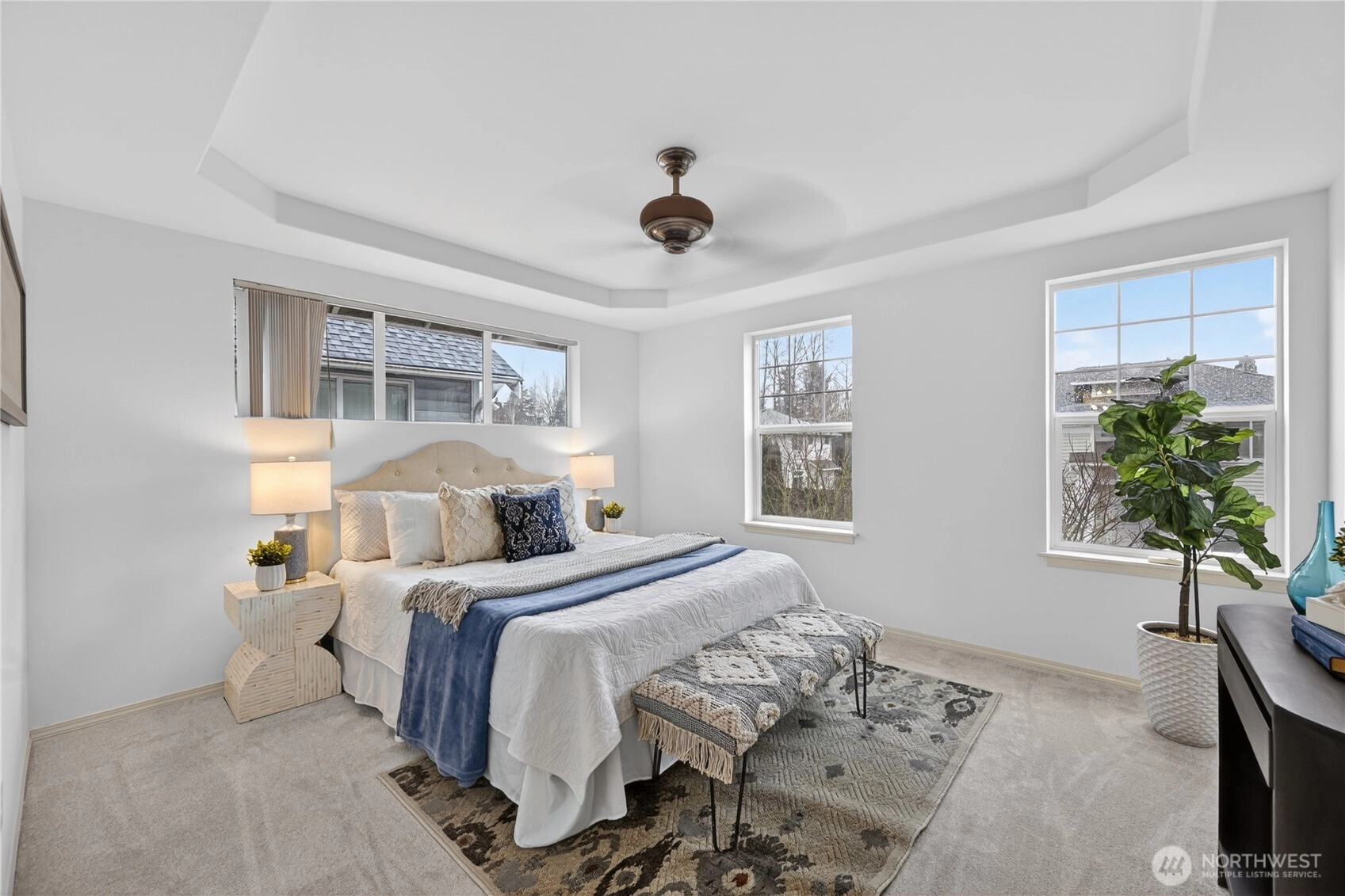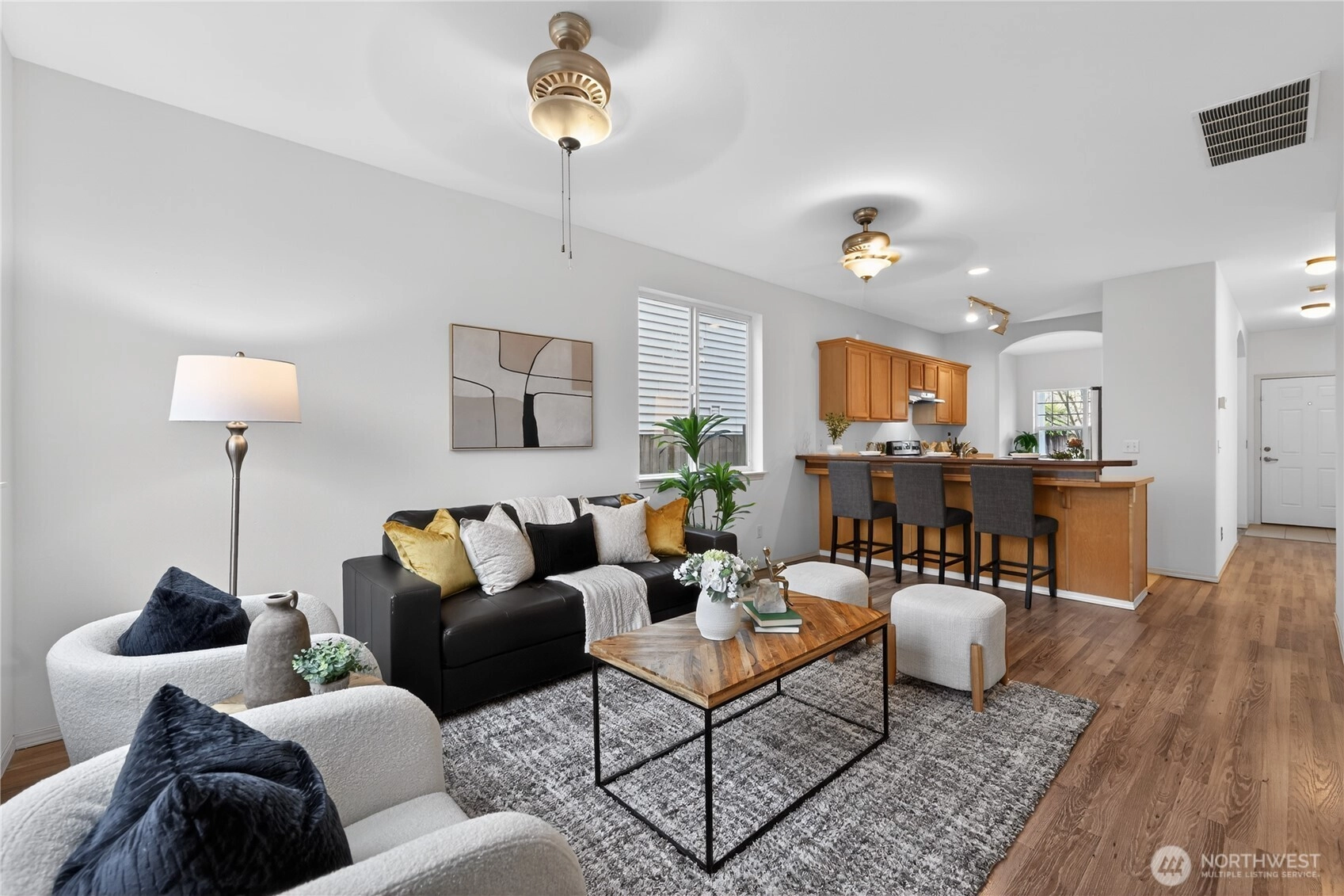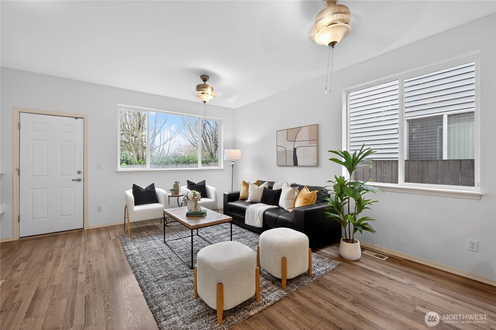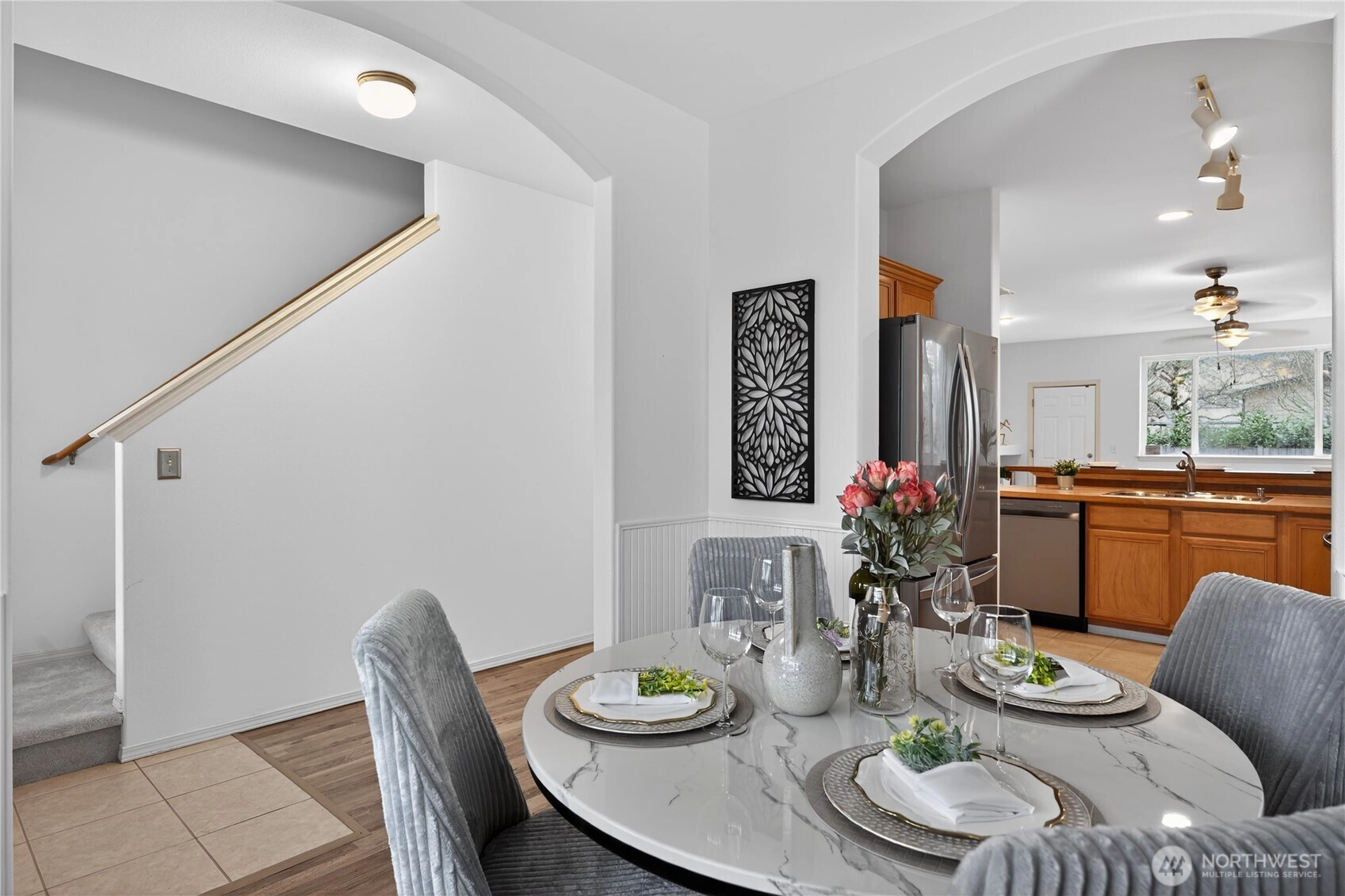 Located in a sought-after community, this beautifully renovated home combines comfort, style, and functionality. Spacious living areas feature high ceilings, a cozy gas fireplace, elegant archways, and gleaming floors, creating a bright and inviting atmosphere. The polished kitchen offers a breakfast bar, stainless steel appliances, ample cabinetry, and flows seamlessly into the living room—perfect for entertaining and everyday living. Upstairs, the generous primary suite boasts a luxurious 5-piece bath and walk-in closet. Additional bedrooms with brand-new carpet and a full bath provide flexible space for guests, home offices, or hobbies. The tandem two-car garage offers plenty of room for vehicles and storage. Enjoy the patio and fully fenced backyard backing to a school, offering privacy and a safe space for pets. Recent upgrades include fresh interior paint, a new water heater, stainless steel appliances, and the brand-new carpet, making this home truly move-in ready. Conveniently located near neighborhood parks, shopping, dining, and with quick access to I-5.