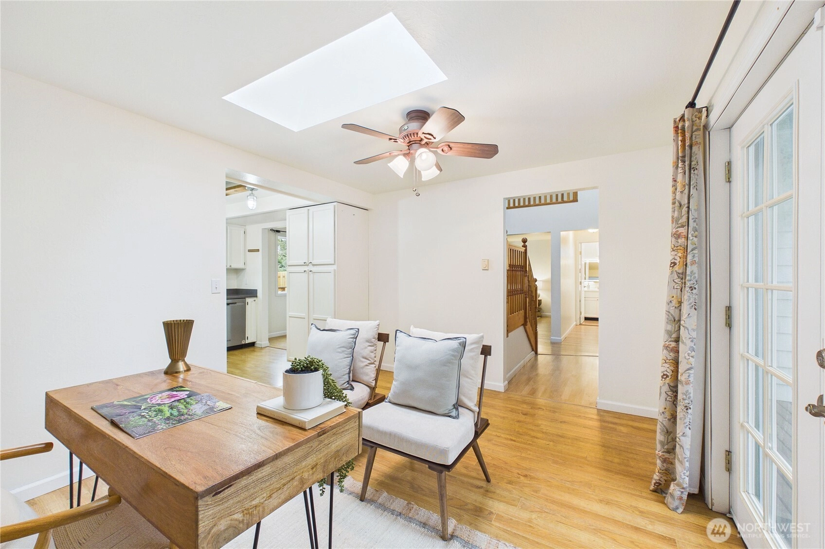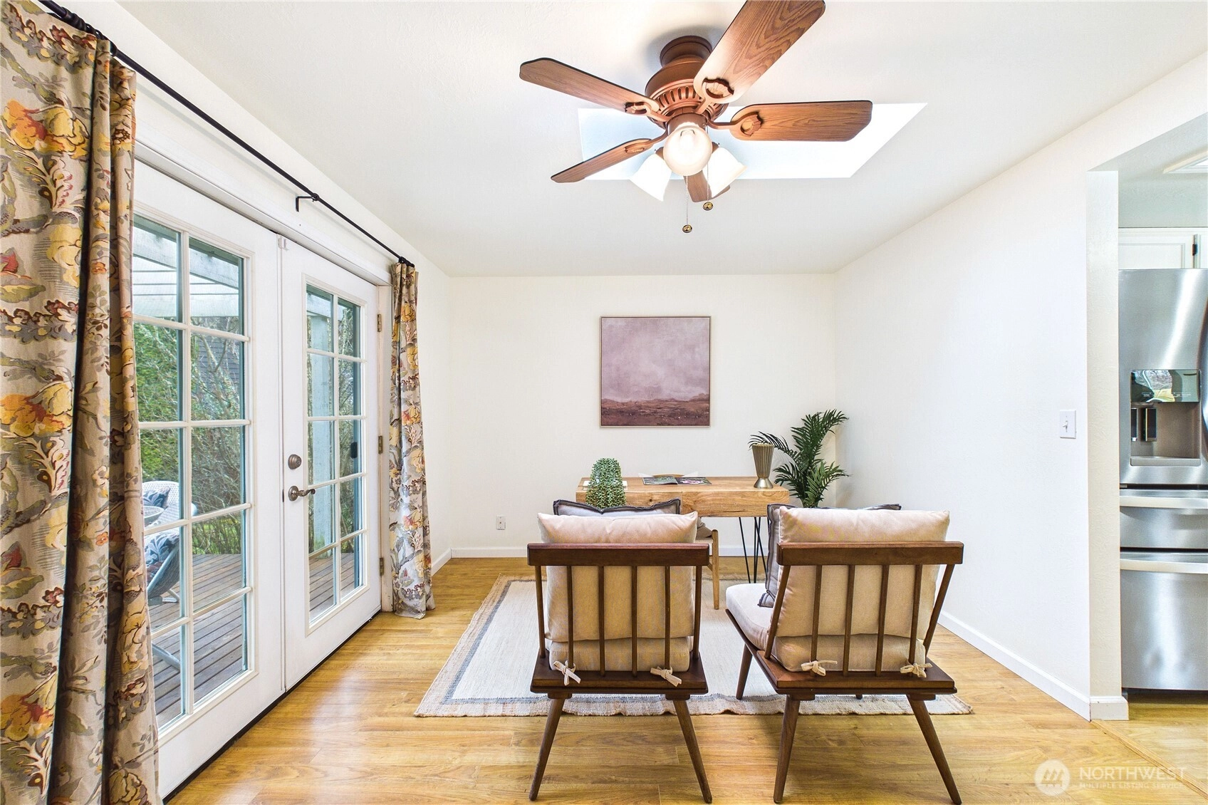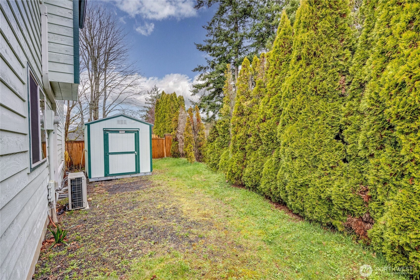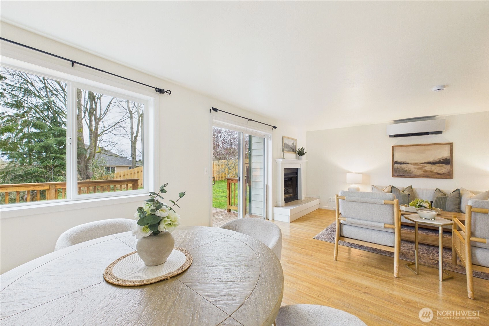 Welcome to the highly sought after neighborhood of Poulsbo Gardens. Offering space, flexibility, and a hard-to-find large lot. 3 bedrooms, 2.5 baths, this home is situated on a level .23 acre lot, and a peek-a-boo view of the Olympics! Ideally located, close to NK schools, and Historic Downtown Poulsbo. The interior has been freshly painted, creating a bright and move-in ready feel. The main level features a vaulted entry with skylight, comfortable living & dining spaces, plus mini-split Heating, and A/C for year-round comfort. Wood burning fireplace for those chilly evenings. Bonus room off the kitchen, with French doors that open to the front entry deck, perfect as a home office, or perhaps creative space. Durable laminate flooring. Stainless appliances in the kitchen. Laundry is conveniently tucked into a closet on the main floor (Washer & Dryer stay!) Upstairs, the spacious primary bedroom with ensuite, features a custom tiled tub/shower, and newer sink vanity with tiled backsplash. Mini-split for heating/cooling. Bedrooms 2 & 3 share a full bath, off the hallway. This home truly offers both location and livability. The fully fenced backyard provides room to garden, play, or relax outdoors, retractable awning on the back deck. Two-car garage, and additional storage shed. As an added bonus, the 95" television currently in the home, stays! A great opportunity for buyers seeking a comfortable home with room to make it their own in a desirable Poulsbo location.