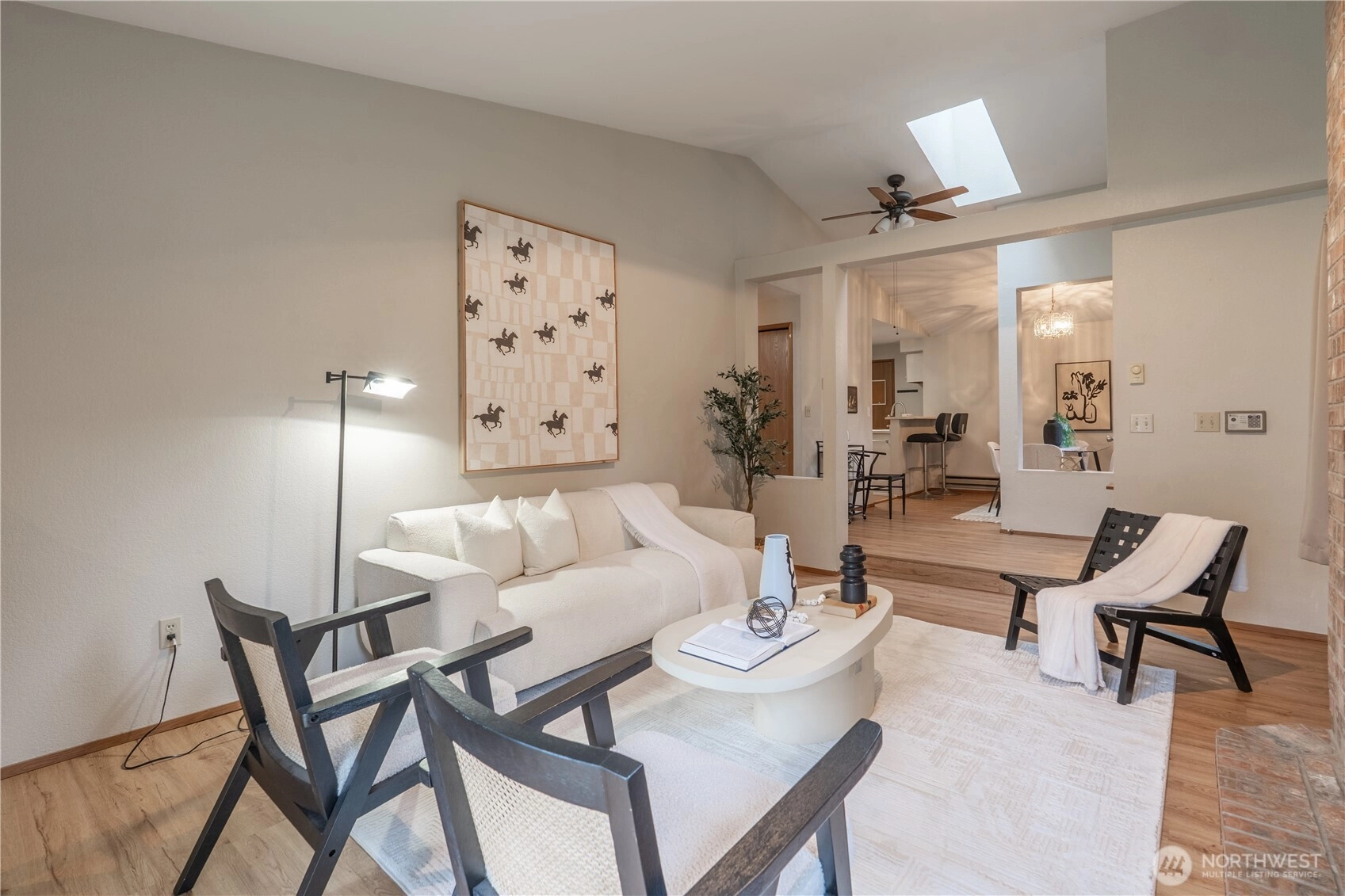 Quaint, Clean and cared for rambler style townhome in the desirable Riverwood community. Light, bright, and inviting, this home offers 2 bedrooms PLUS a versatile den/3rd bedroom that is perfect for working from home or guest space. Vaulted ceilings and skylights create an airy feel, while the sunken living room centers around a cozy gas fireplace. Newer vinyl plank flooring offers an updated feel throughout. The dine-in kitchen features stainless steel appliances with gas cooking, ample cabinetry and breakfast bar adjacent to the dining and living spaces. A sliding door opens to the patio and a rare, large fenced backyard—ideal for relaxing, gardening, or entertaining. Additional highlights include newer roof, a spacious 2-car garage with storage and community RV parking. HOA covers water, landscaping, and common maintenance for easy and convenient living. Centrally located near Downtown Orting and Downtown Sumner with local trails, parks, shopping, dining, and great schools. Welcome home!
