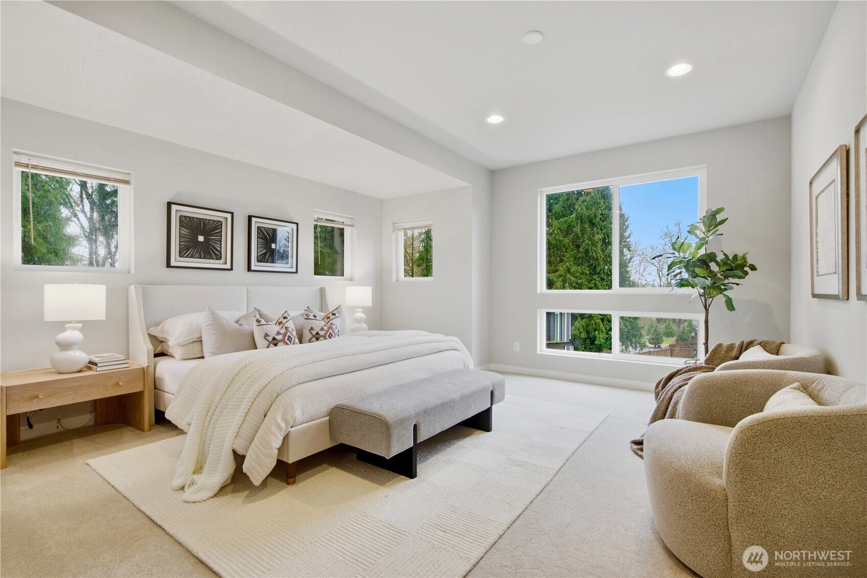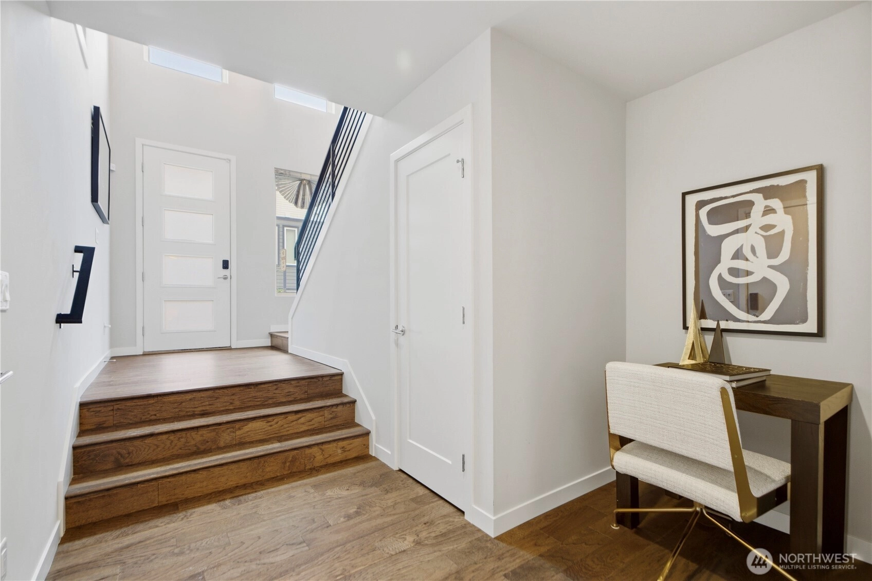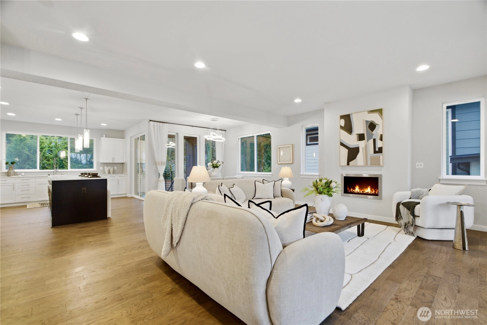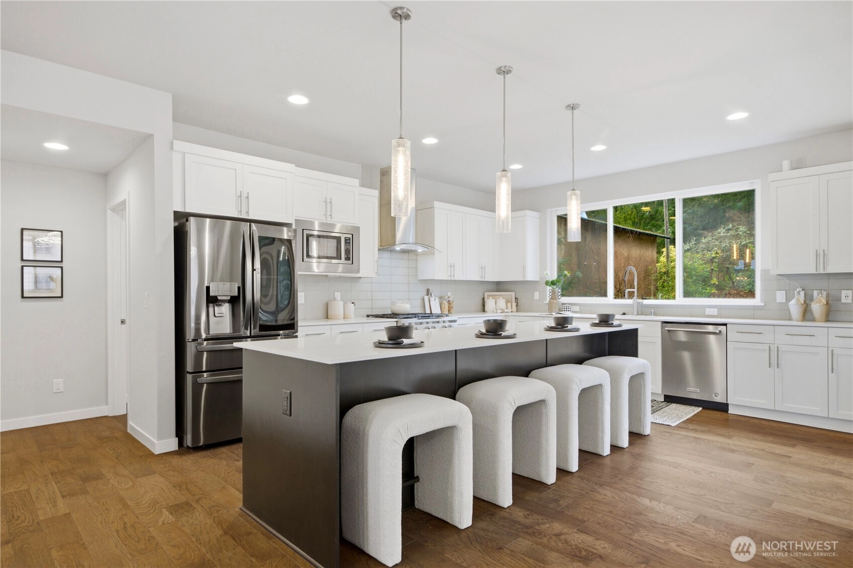 West-facing with territorial views, this light-filled Northwest contemporary sits in Newcastle’s desirable Taylor Ridge community. Soaring ceilings and walls of windows bring in abundant natural light, highlighting hardwood floors, modern metal railings, and a cozy gas fireplace in the open great room. The chef’s kitchen centers around a huge island with generous storage, crisp white cabinetry, white quartz counters, and KitchenAid appliances. Upstairs features a spacious primary suite with French doors, a 5-piece bath, and walk-in closet, along with two additional bedrooms and a convenient laundry room with utility sink. The lower level offers flexible living space with a bonus room, 4th bedroom, and ¾ bath—ideal for guests or multi-generational living. Enjoy two decks, one plumbed for gas, plus a fully fenced backyard. HOA covers exterior and yard maintenance. Minutes to trails, Newcastle Elementary, shopping, and top-rated Issaquah schools. Pre-inspected, and move-in ready.