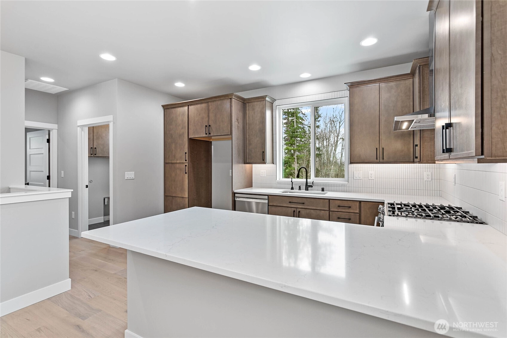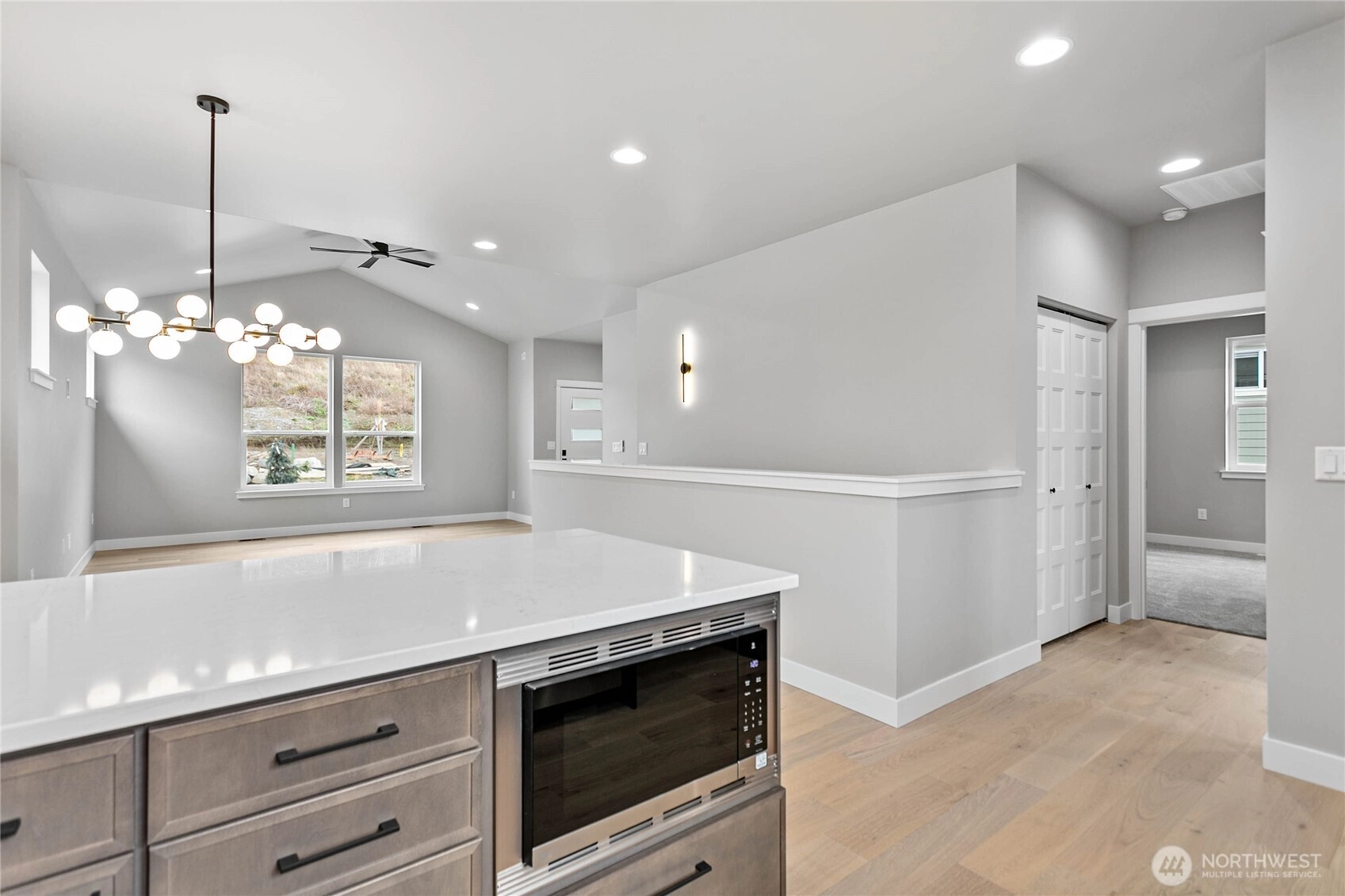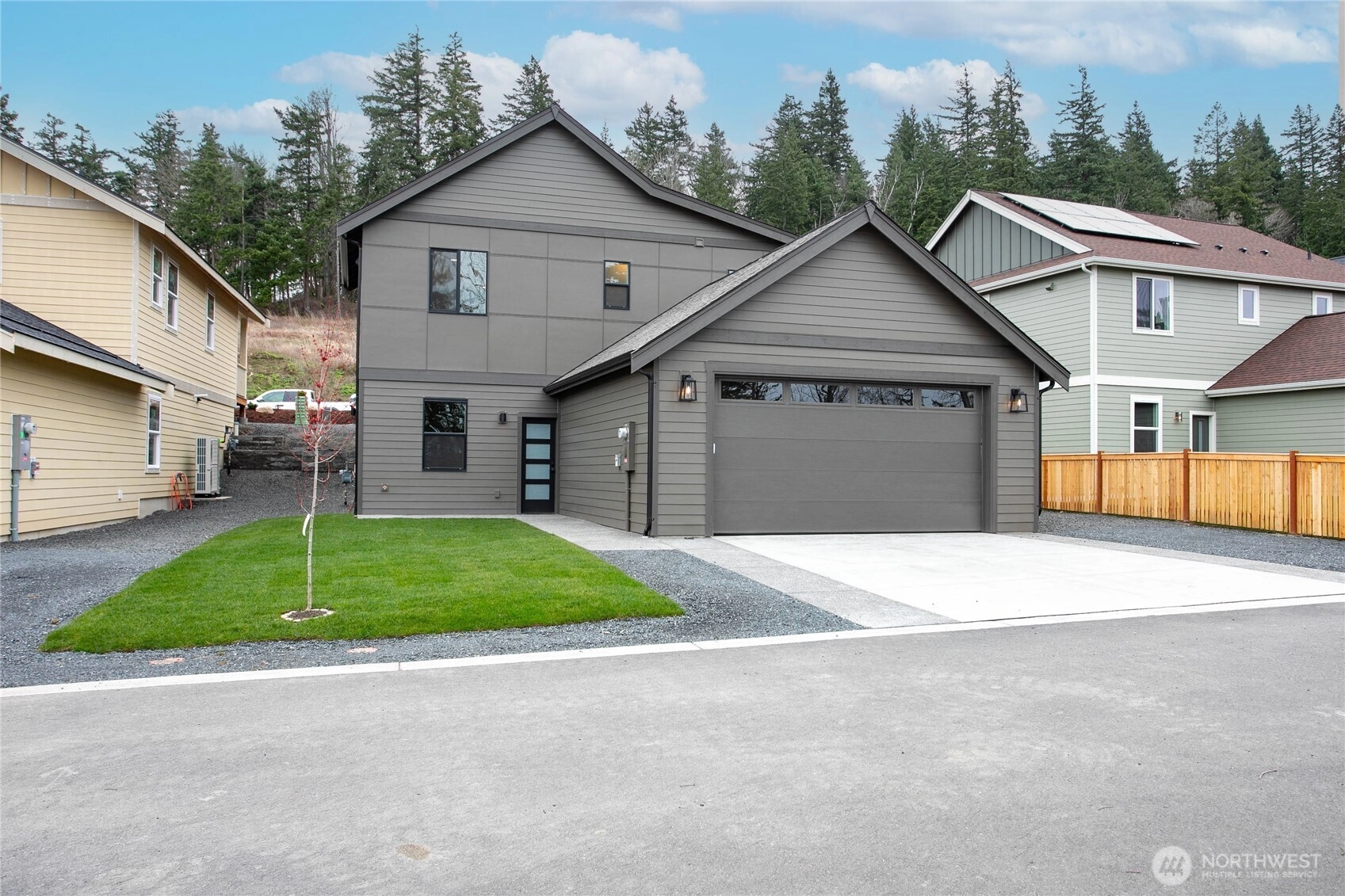 Thoughtfully designed new construction by Alliance Properties. This bright home lays out almost like a rambler, with everything you would need on one level (laundry, great room, kitchen, office). Kitchen featuring a large quartz peninsula, custom tiled back-splash with tile work wrapping the window, on-demand hot water tap, upgraded hood, and natural gas cook top. Main floor primary bedroom boasts a custom tiled shower, double under-mount sinks, large walk-in closet, and high tech cabling. There are an additional two bedrooms and shared bath off of the lower-level garage. Shared bath includes soaker tub/shower combo with tile all the way to the ceiling and a long cabinet run with soft close hinges. Spacious 2-car garage comes pre-wired for EV. Not included in the square footage is a massive dry and wired "crawlspace" that reads more like a large secure storage locker. Accessed from the outside of the home, there is room for bikes, kayaks, and more. OR look into the potential to finish in the future. Home located next to trail system. Solar included. STILL TO COME: FENCING and LANDSCAPING